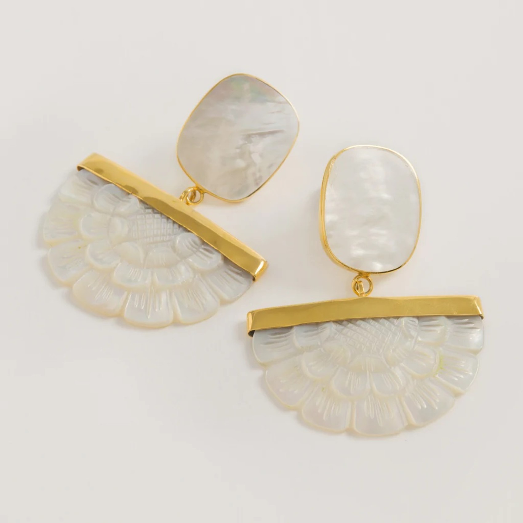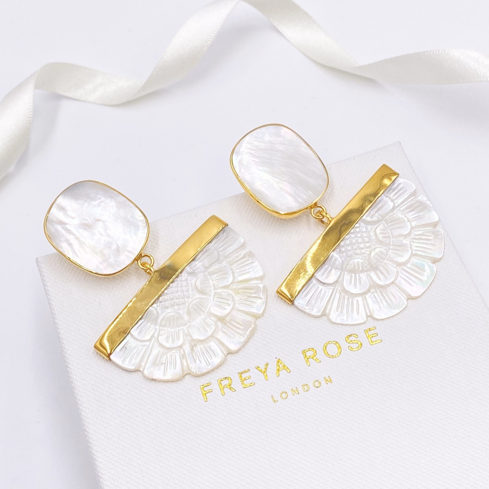 Freya Rose si è ispirata alla natura per progettare questi creativi ed eleganti orecchini di perle floreali. Questi orecchini a ventaglio sono stati realizzati a mano con oro 22ct e madreperla naturale splendidamente intagliata. Un design davvero unico che farà sicuramente girare la testa, in qualsiasi occasione!