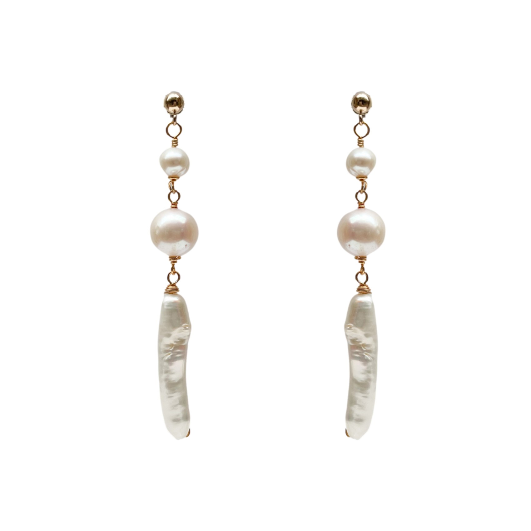 Lunghe perle barocche pendono deliziosamente da una borchia dorata. Gli orecchini a forma organica sono l'accessorio perfetto per la sposa moderna.