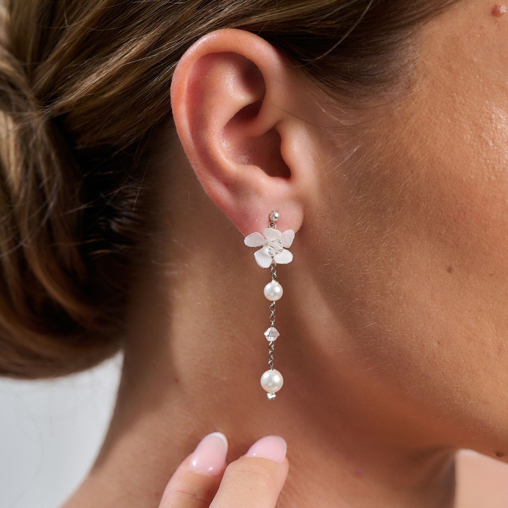 Un grazioso fiore in tessuto sospende una goccia di perle e cristalli in questi delicati orecchini floreali. Abbinate questo elegante paio a uno dei nostri copricapo floreali per un look da sposa assolutamente romantico. Incredibilmente leggeri: non vi accorgerete nemmeno di averli addosso!