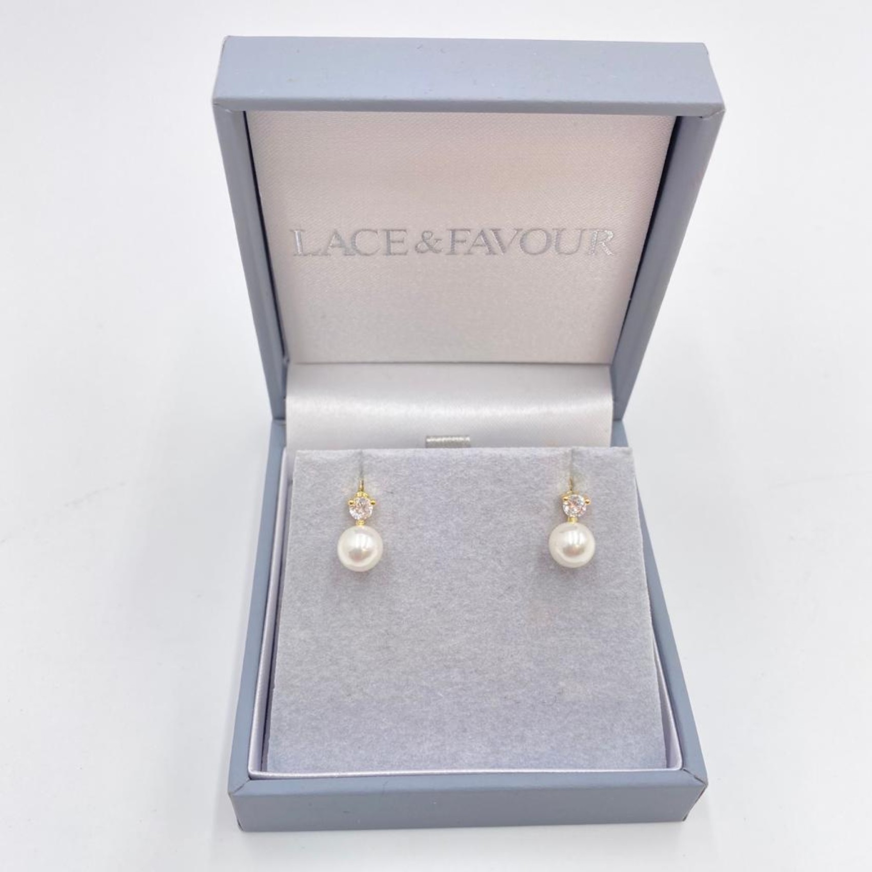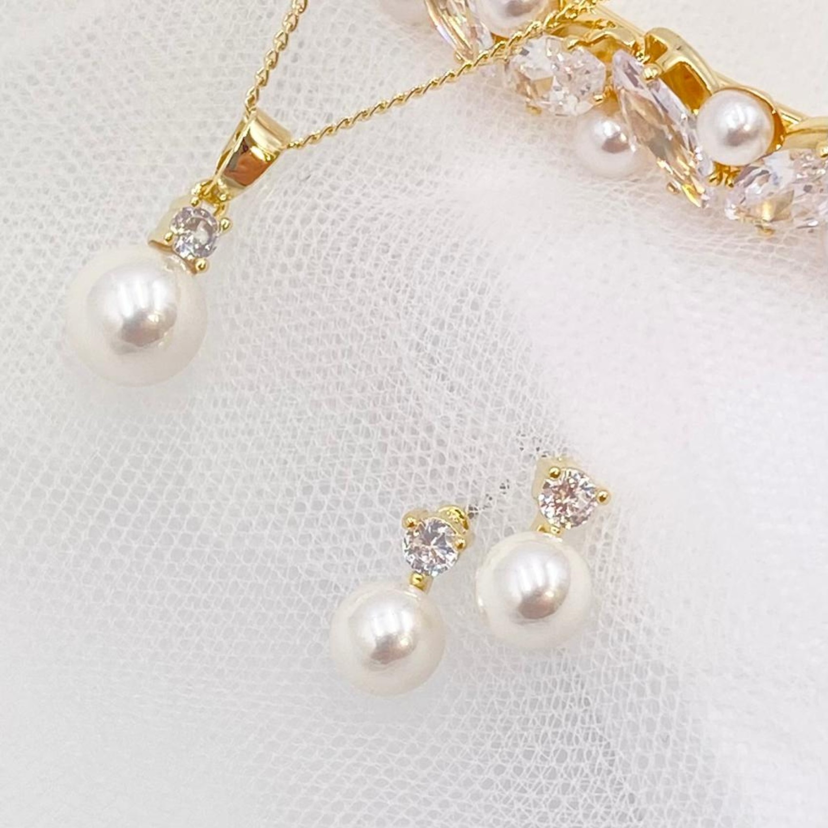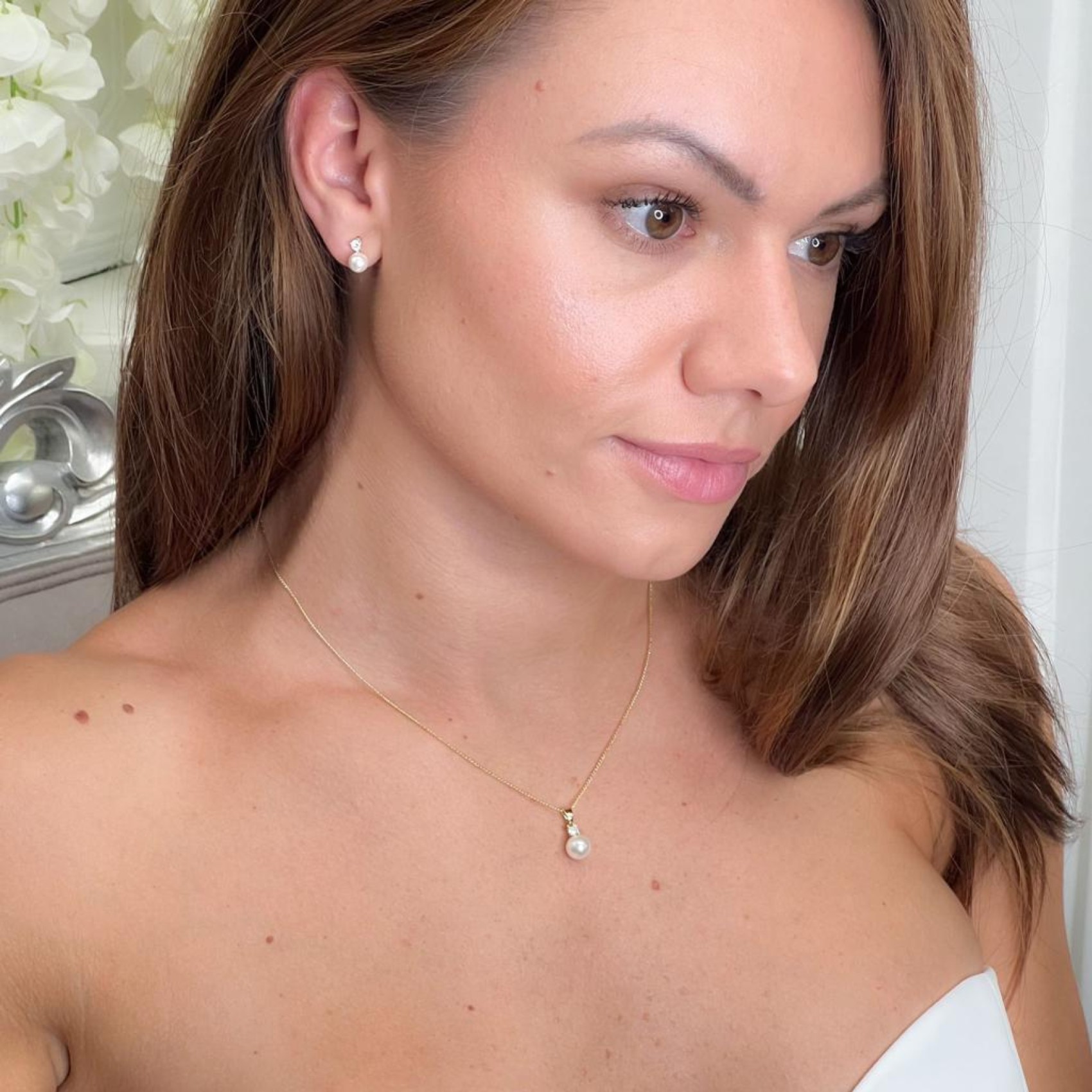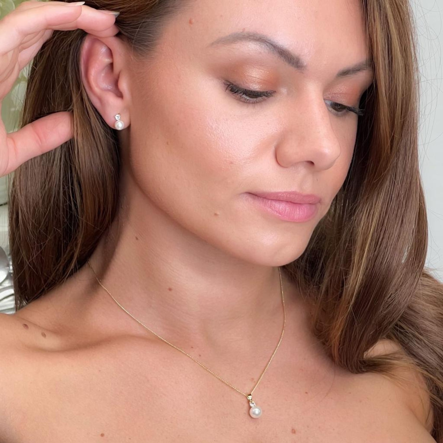 Delicati orecchini a perla in oro dal design semplice ed elegante con un singolo cristallo cubico scintillante e una perla avorio simulata. Perfetti per le spose o le damigelle.