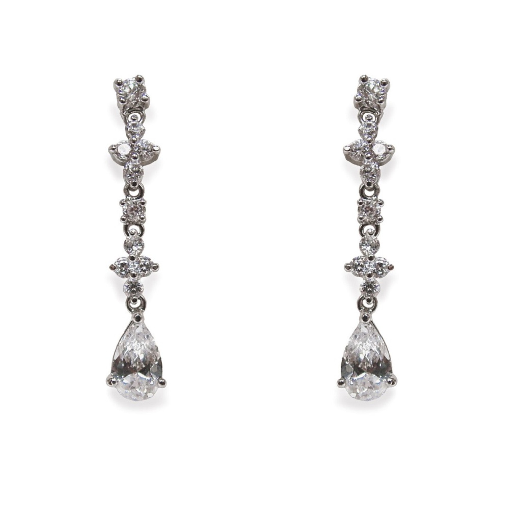 Gli orecchini Kensington sono delicati e bellissimi. Scintillanti cristalli di zirconia cubica sono incastonati in un design a goccia stretto influenzato dagli anni '20, rifinito con una singola pietra a goccia per un effetto scintillante. Questi orecchini da sposa conferiscono una sobria eleganza a un look nuziale classico o vintage.