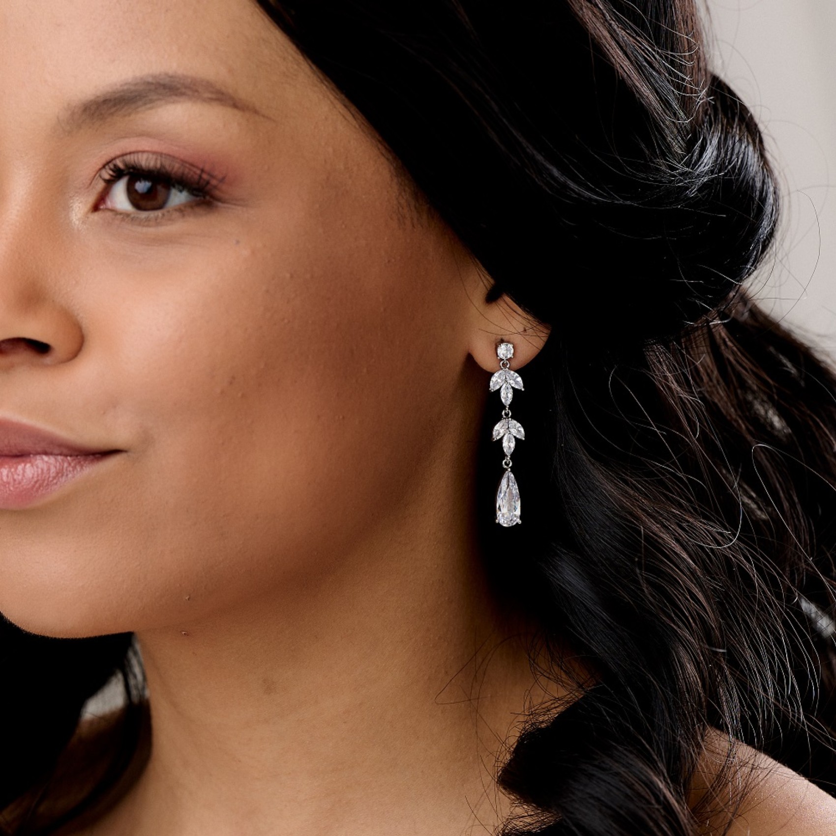 Gli orecchini da sposa Radiance, splendidamente eleganti, sono caratterizzati da scintillanti cristalli CZ a forma di foglia e da una pietra a goccia allungata. Perfetti per le spose che desiderano orecchini un po' più lunghi, questi orecchini sottili sono perfetti con un'acconciatura da sposa.