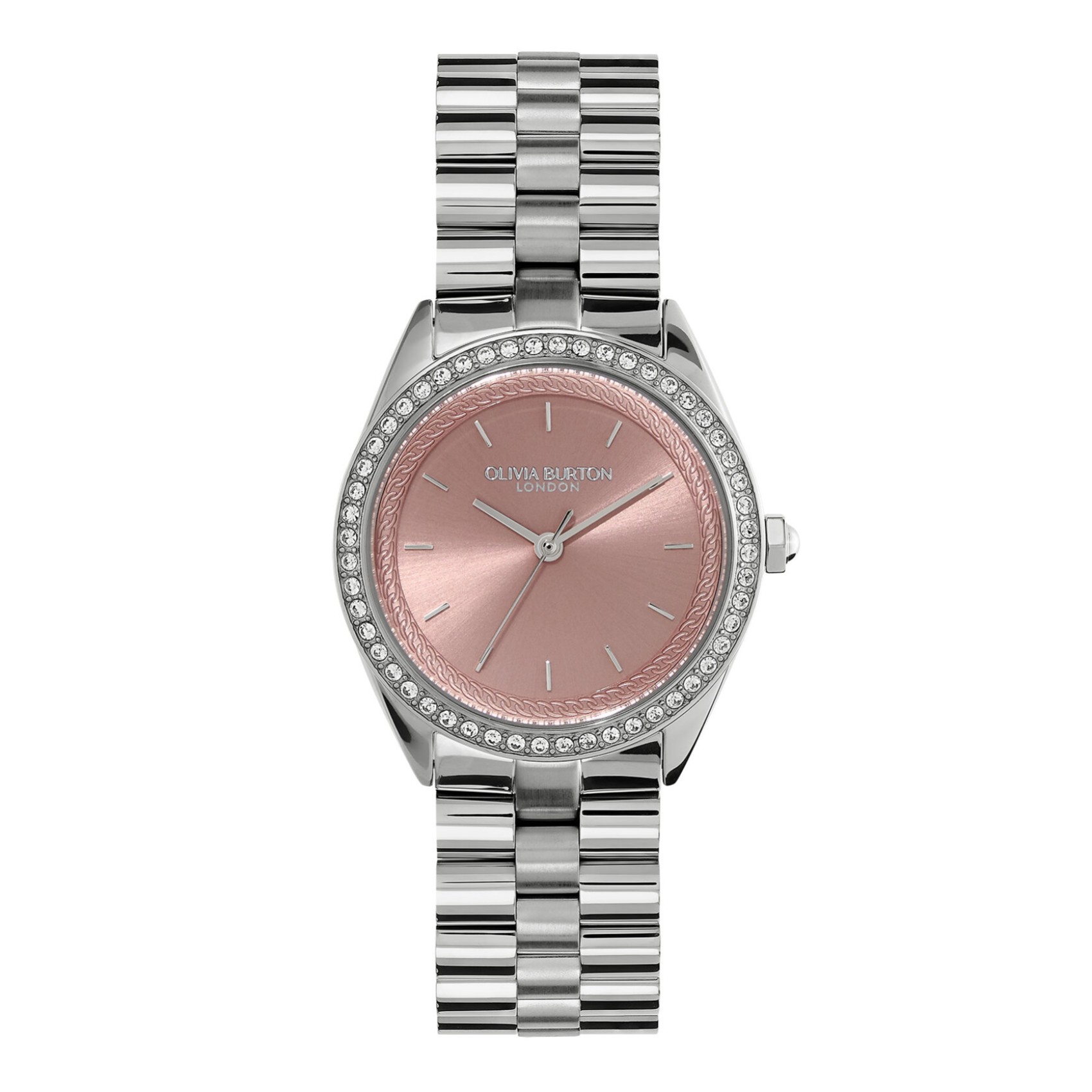 Questo orologio Sports Luxe di Olivia Burton è un classico in divenire. Il quadrante a raggi di sole in tonalità rosa tenue è incorniciato da un bordo a catena e da una lunetta di cristalli abbaglianti per un tocco in più. Rifinito con un cinturino sportivo con finitura argentata, questo orologio è sicuramente il modo di indossare lo Sport Luxe.