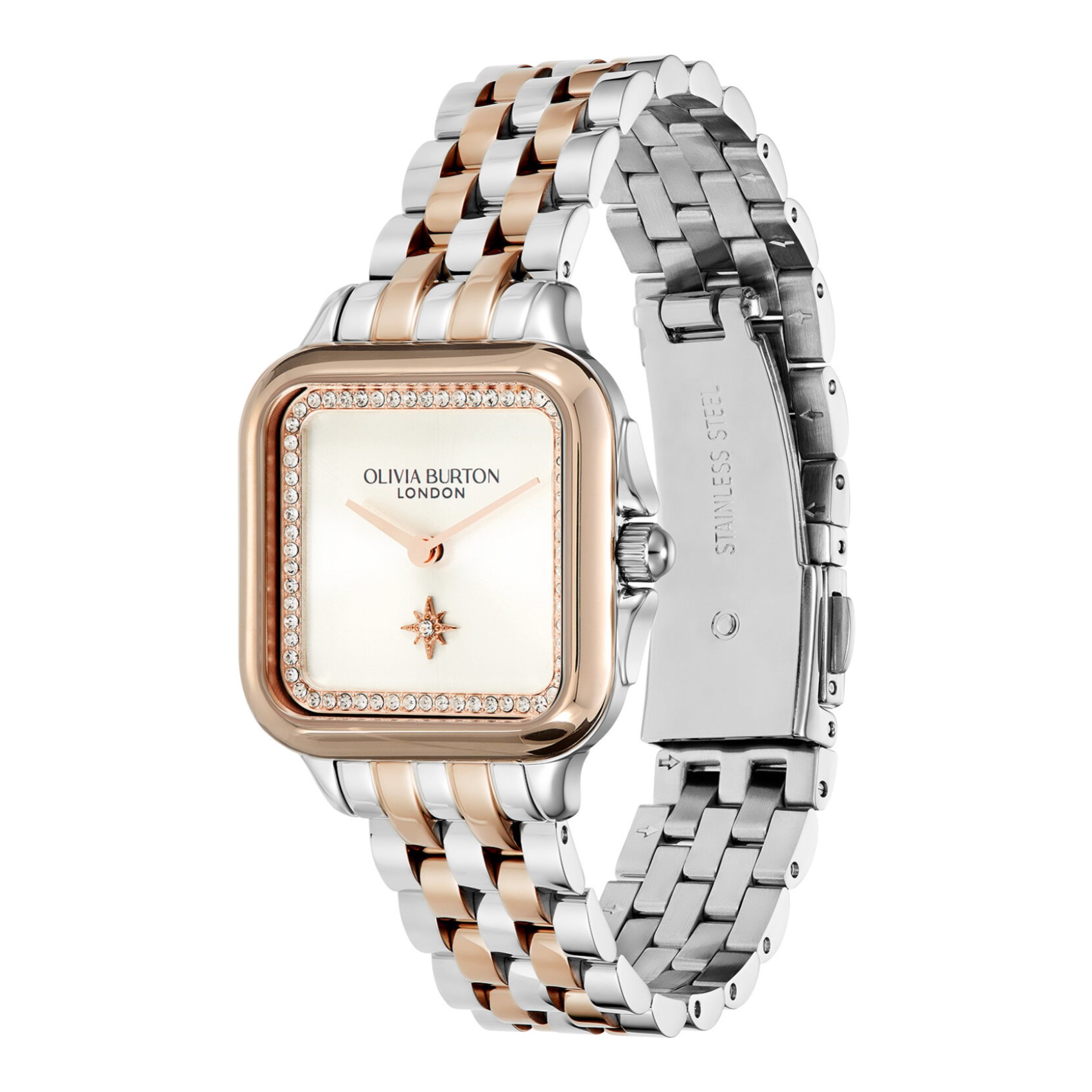 Il quadrante bianco argento a raggiera è incorniciato da cristalli trasparenti che ne esaltano l'elegante design morbido e squadrato. Rifinito con un significativo indicatore della Stella Polare e un cinturino bicolore in argento e oro rosa, questo quadrante è una celebrazione dello stile sofisticato di Londra.