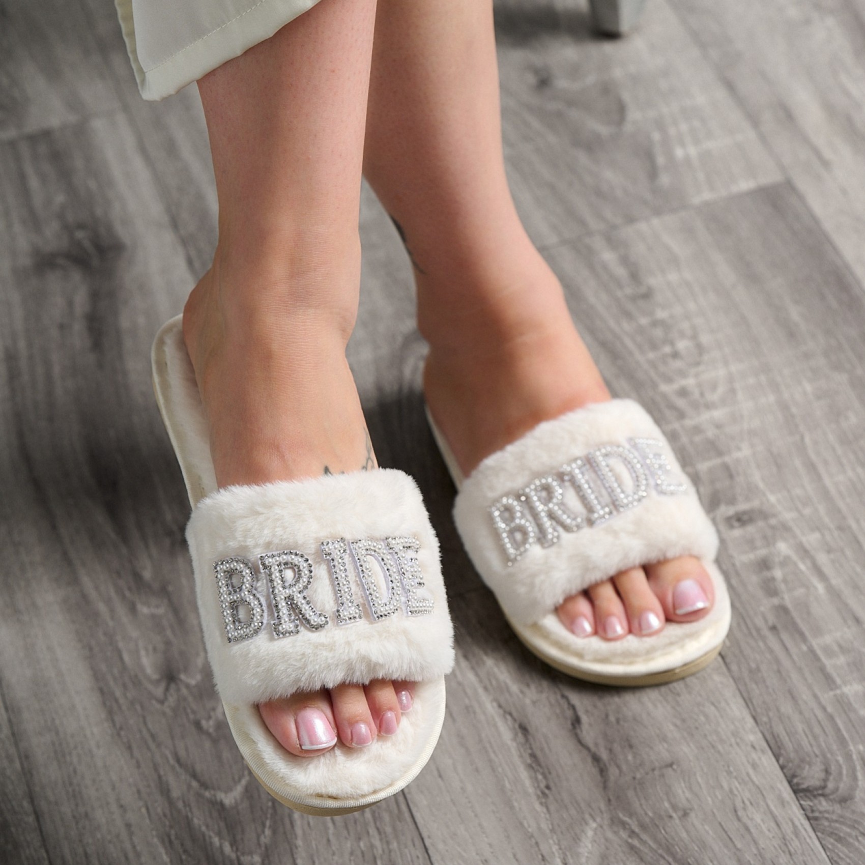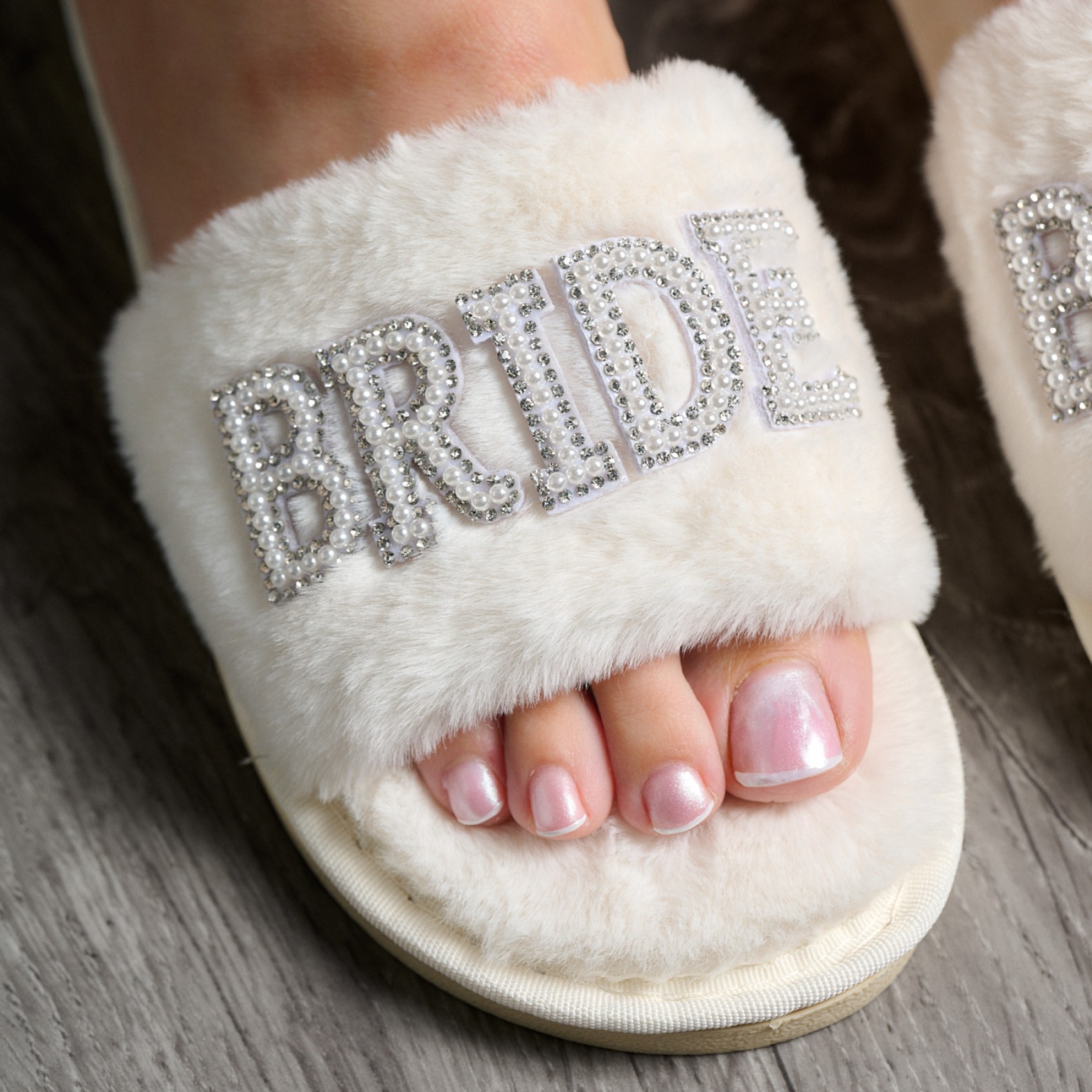 Un must have per la futura sposa glamour! Realizzate in morbidissima pelliccia sintetica color avorio e ornate con la scritta "bride" in diamanti e perle scintillanti. Queste pantofole da sposa sono perfette per la mattina del matrimonio, la luna di miele e oltre.