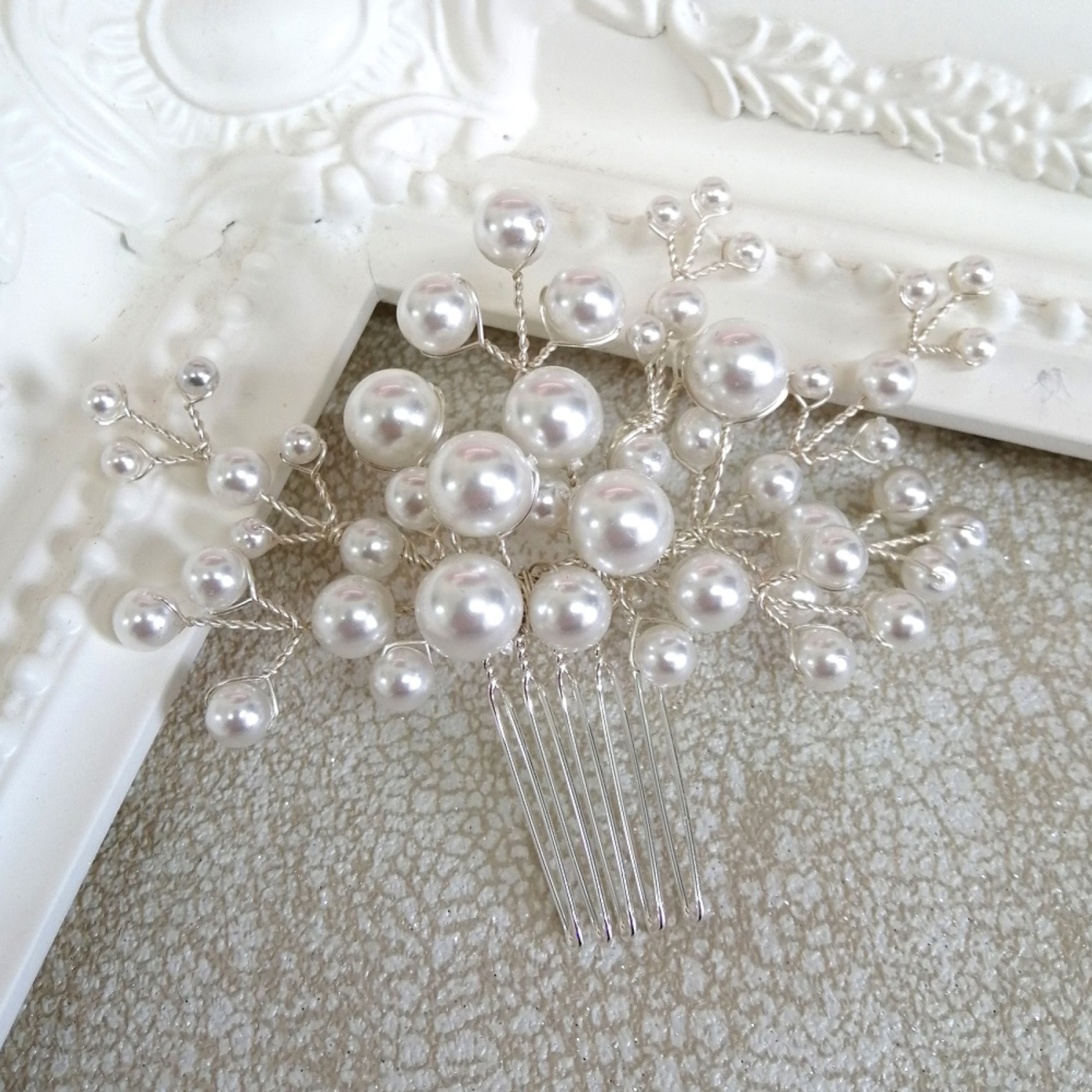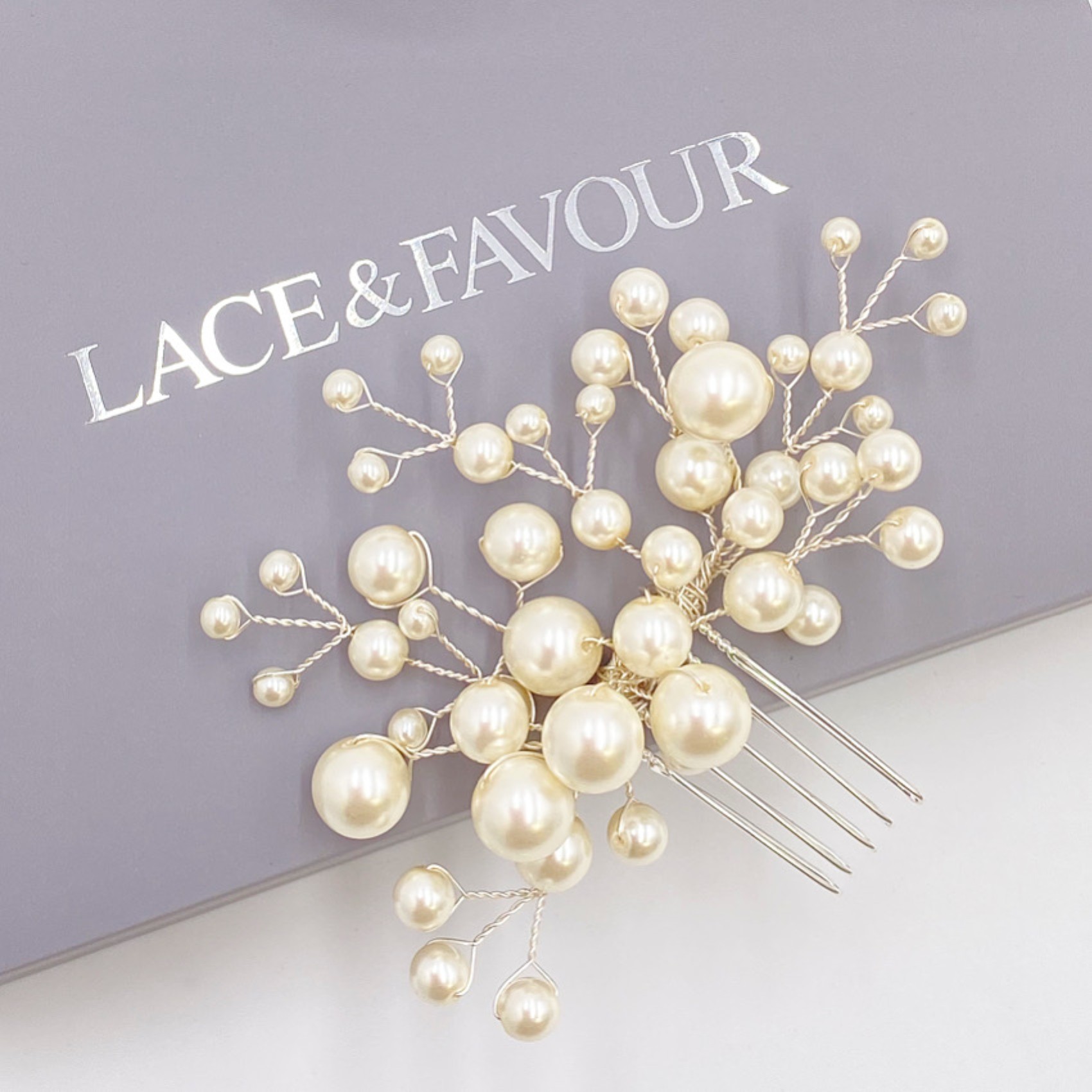 Splendido pettine per capelli da sposa con perle di varie dimensioni, progettato come parte della nostra popolare gamma Everlasting. Da annidare a lato di un'acconciatura o da indossare in cima a un velo per un look da sposa semplice e moderno. Perfetto anche per le damigelle!