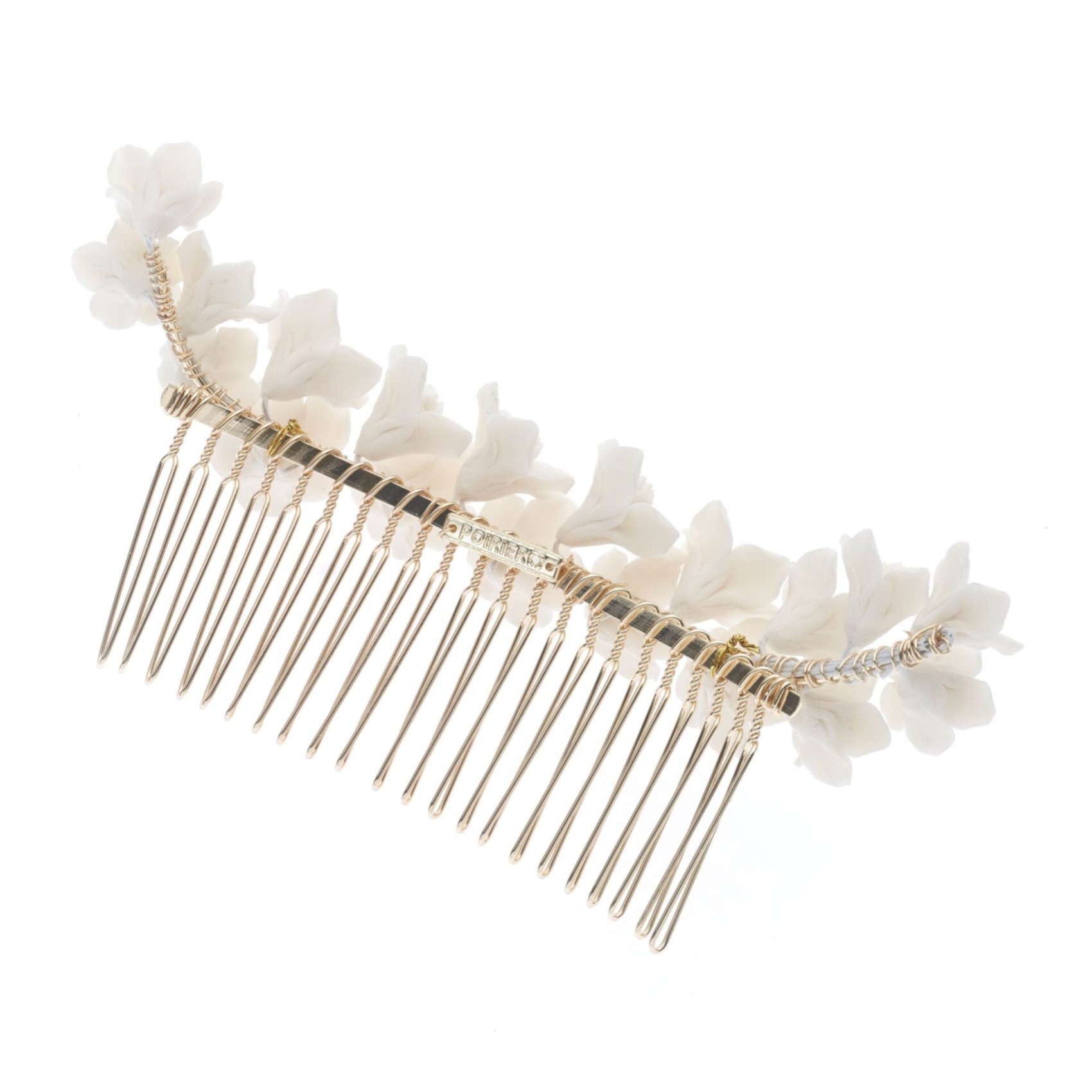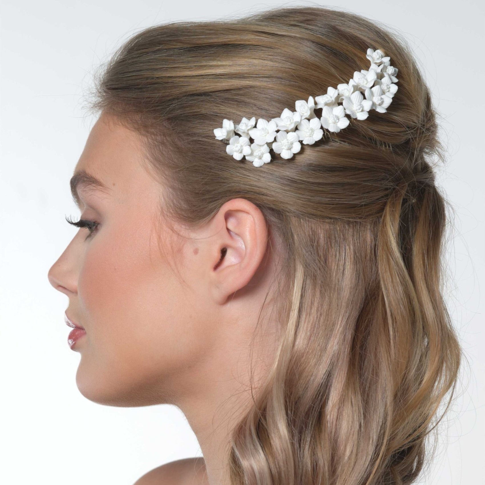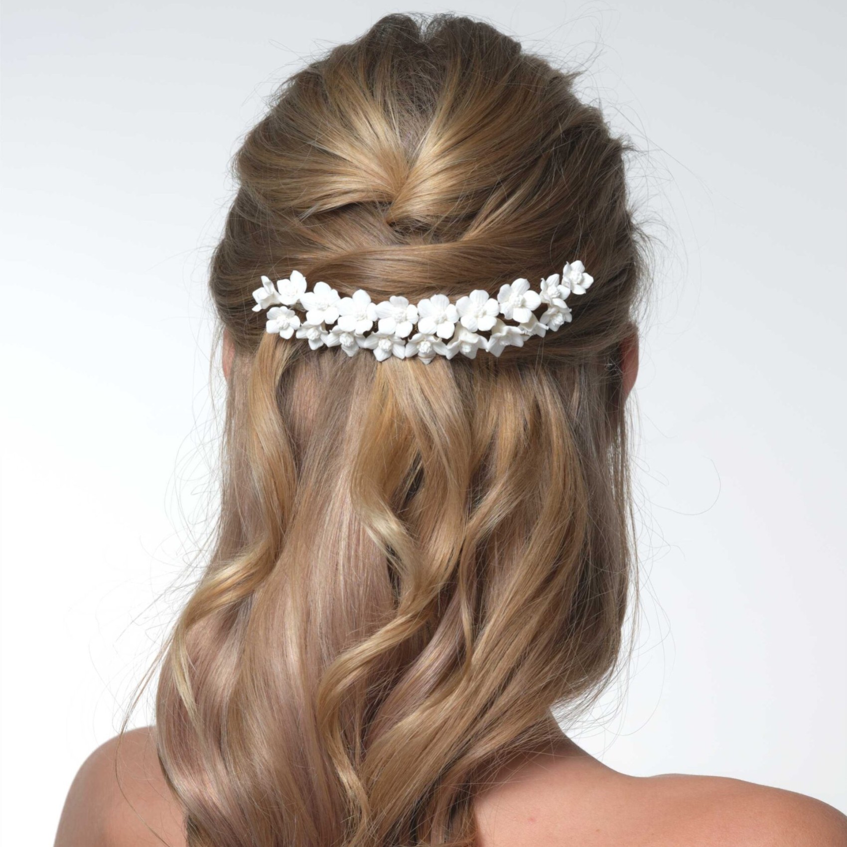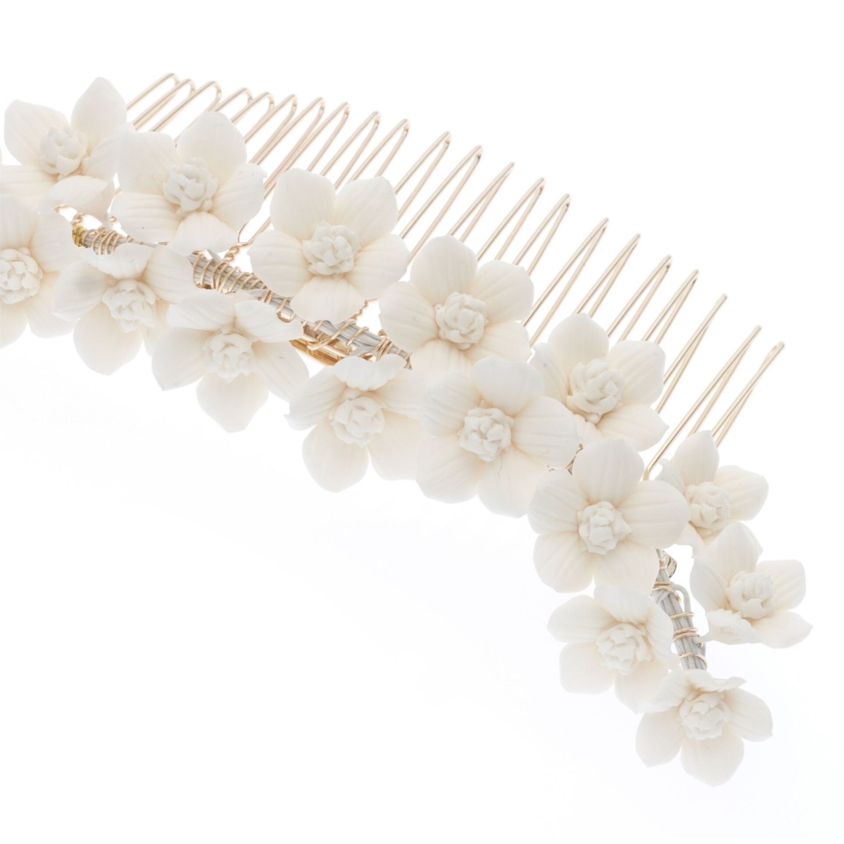 Adornate le acconciature della sposa con questo splendido pettine per capelli a fiori. Realizzato a mano con bellissimi fiori di porcellana color avorio, questo pettine da sposa va abbinato a un abito floreale per un look da sposa davvero romantico. Ci piace molto questo pettine da sposa acconciato dietro i capelli con un elegante velo a un piano. L'accessorio per capelli perfetto per un matrimonio informale in giardino.