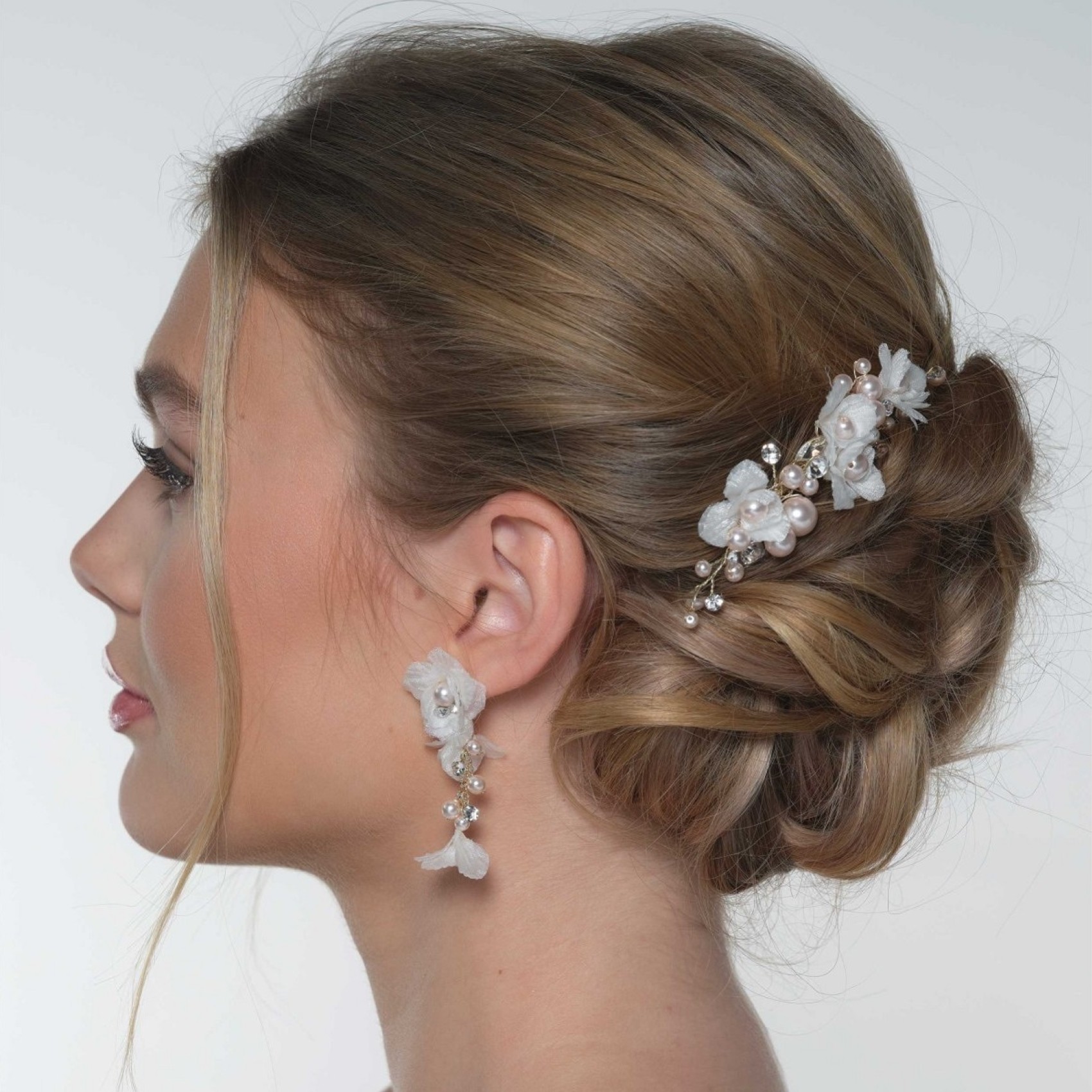 Il pettine per capelli floreale Amaryllis è perfetto per la sposa romantica. Combinando fiori in tessuto avorio con perle color blush e cristalli scintillanti, questo accessorio si inserisce in una pettinatura da sposa scompigliata per un'atmosfera morbida e bohémien. Abbinatelo agli orecchini coordinati per completare il vostro look.