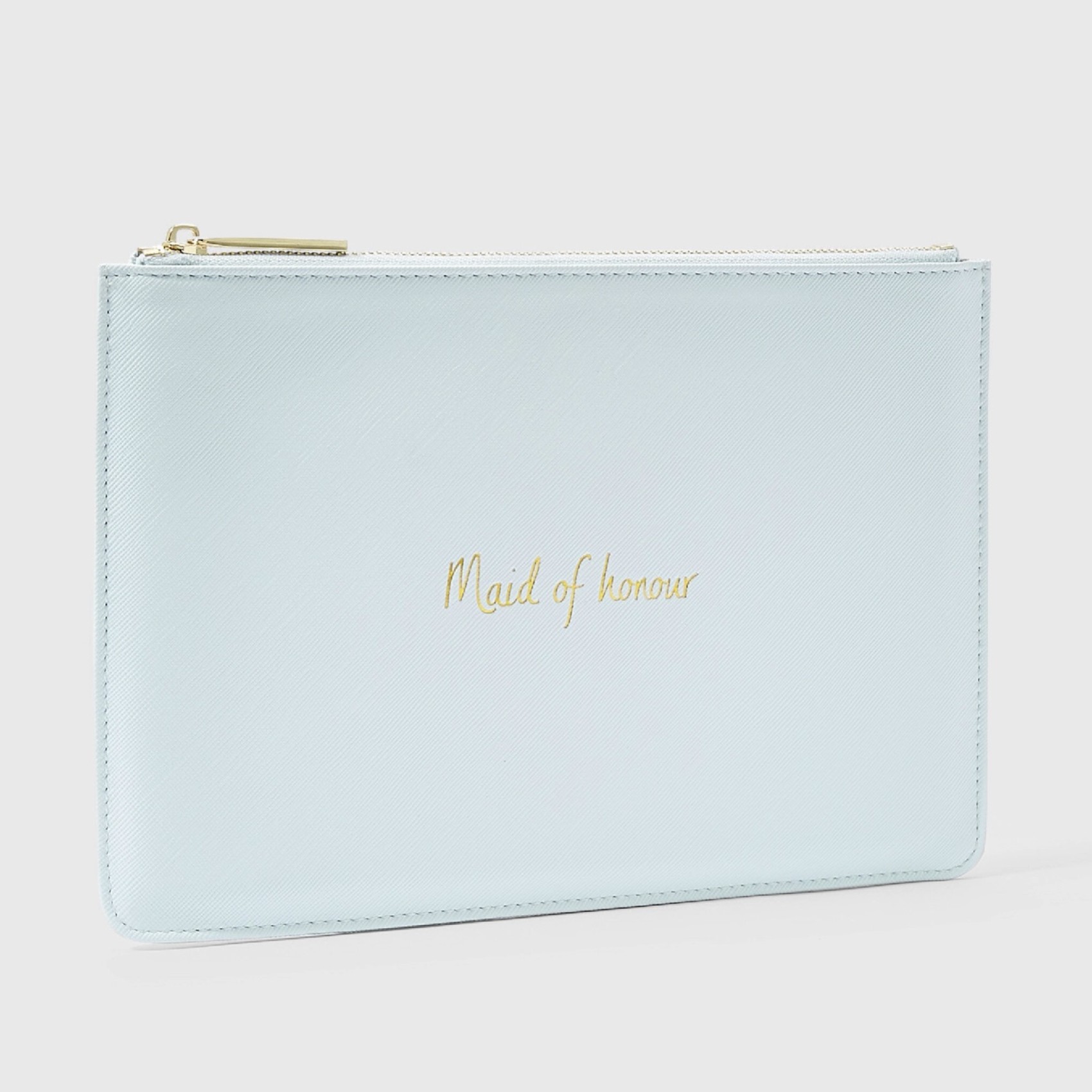 Questa splendida busta "damigella d'onore" blu polvere è rifinita con scritte in oro metallizzato e una chiusura a zip dorata. Un bel ricordo e una piccola pochette da tenere a portata di mano nel giorno speciale.