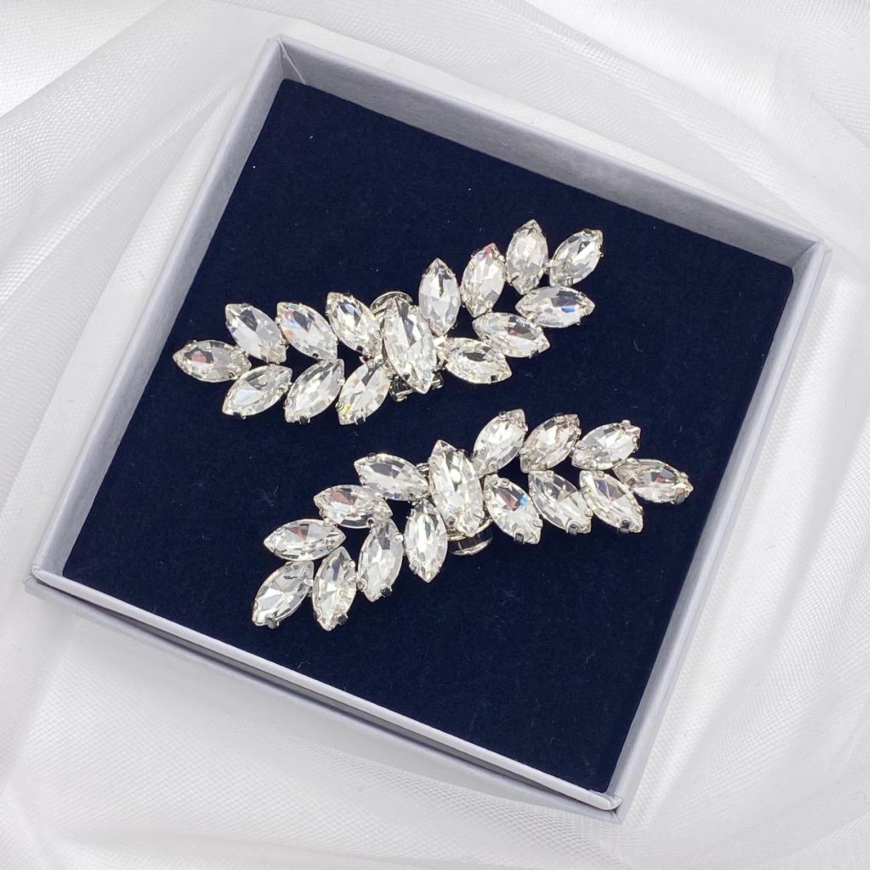 Classici cristalli marquise incastonati in un'elegante curva creano i nostri bellissimi fermascarpe Astral. Da indossare davanti o di lato per aggiungere un tocco di sofisticato scintillio alle vostre amate scarpe. Sono anche un bel regalo per una sposa, una damigella o un'amica speciale!