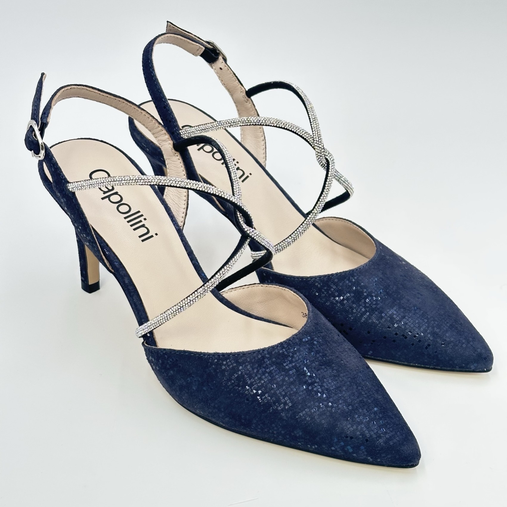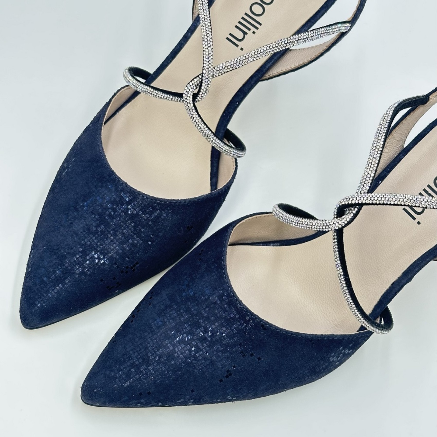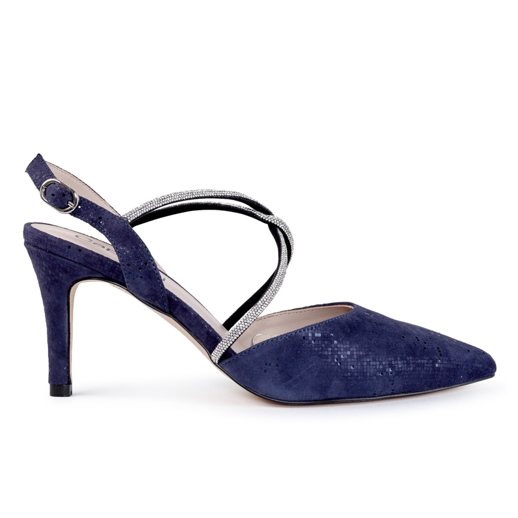 Charlotte è un modello essenziale per il guardaroba! Splendidamente realizzata in pelle nubuck color navy scuro, questa scarpa presenta un'elegante punta, un'elegante slingback e lusinghieri cinturini incrociati con diamanti. Perfetta per ogni occasione speciale, come la madre della sposa, le invitate a un matrimonio, le feste e le serate.