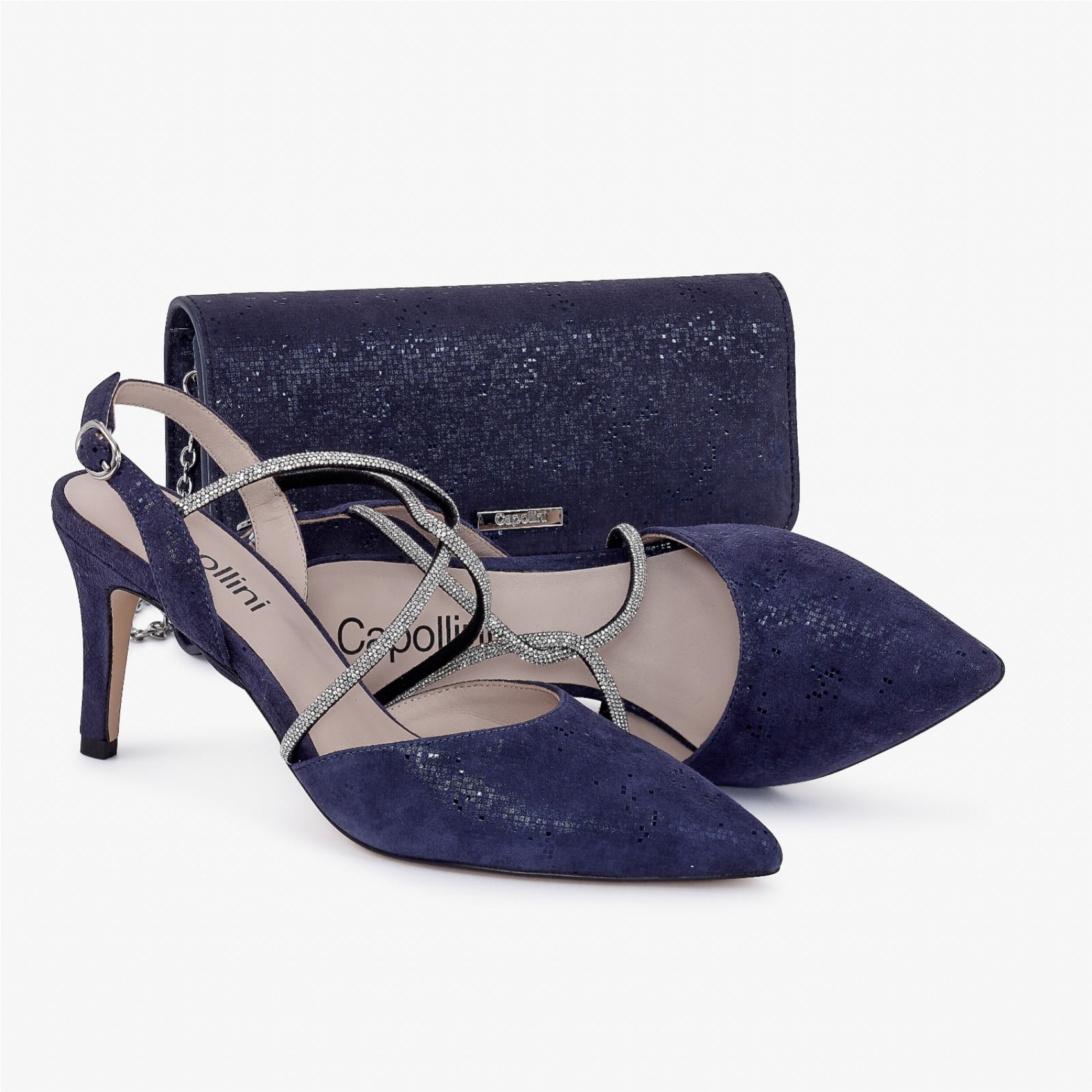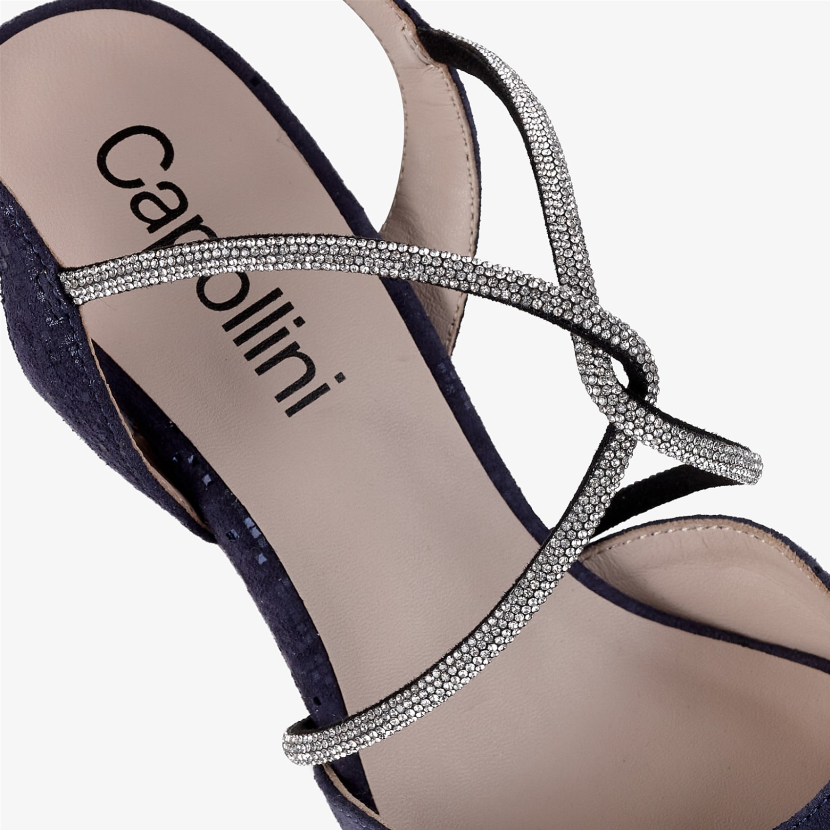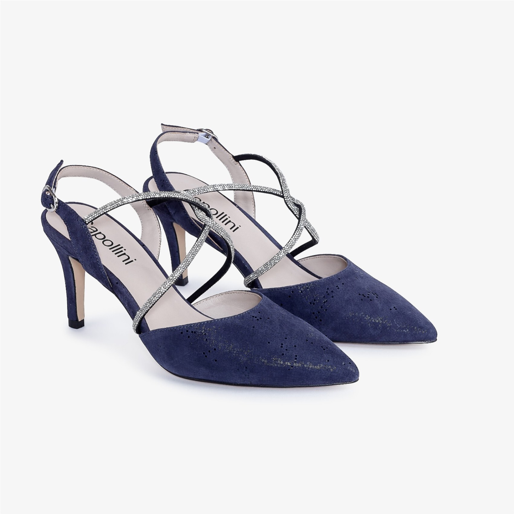 Charlotte è un modello essenziale per il guardaroba! Splendidamente realizzata in pelle nubuck color navy scuro, questa scarpa presenta un'elegante punta, un'elegante slingback e lusinghieri cinturini incrociati con diamanti. Perfetta per ogni occasione speciale, come la madre della sposa, le invitate a un matrimonio, le feste e le serate.