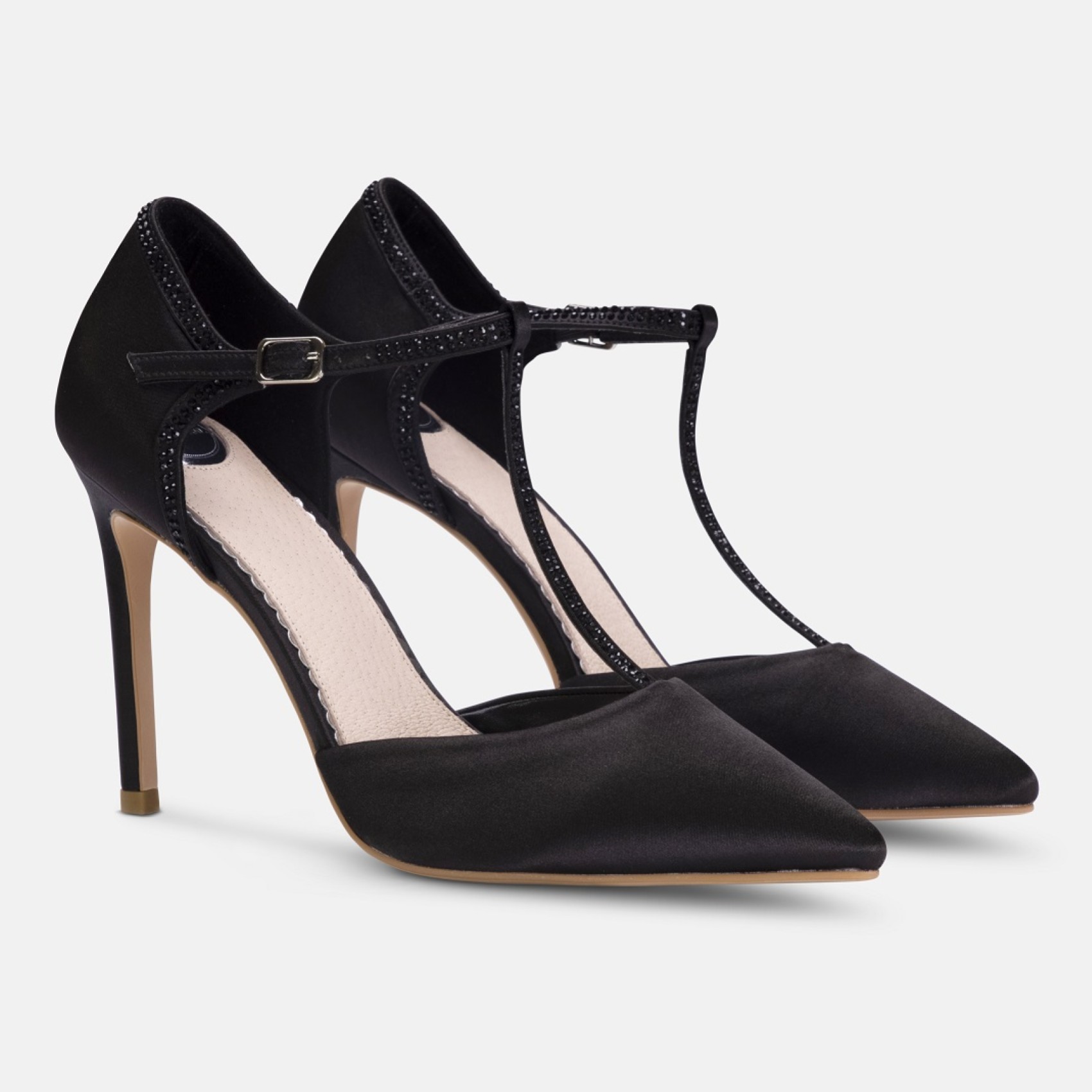 Le nostre nuove scarpe Jessica sono realizzate in un intramontabile raso nero e presentano un'elegante punta a punta, un alto tacco a spillo e un dettaglio di diamanti scintillanti. Il cinturino a T allunga la gamba, mentre il cinturino alla caviglia mantiene il piede in posizione. Completate da una soletta in pelle ammortizzata per un comfort che dura tutto il giorno.