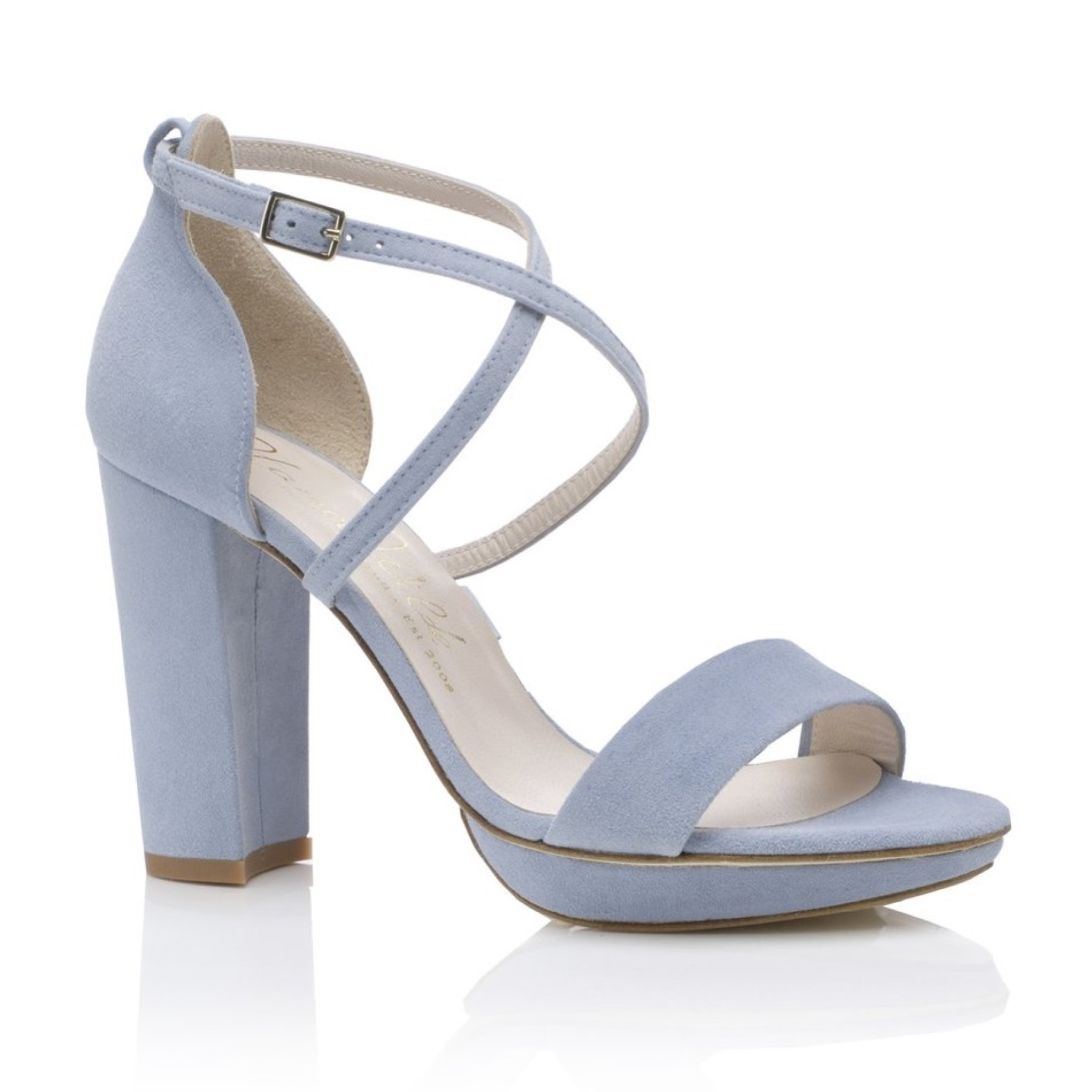 Un bellissimo sandalo con tacco a blocco alto in capretto scamosciato blu nebbioso, caratterizzato da un elegante plateau inferiore e da eleganti cinturini incrociati che si chiudono con una delicata fibbia argentata. Ultra moderno e femminile, il sandalo a blocco Arabella di Harriet Wilde aggiungerà sicuramente un tocco di glamour da sposa al vostro grande giorno. Perfetto per il vostro "qualcosa di blu".