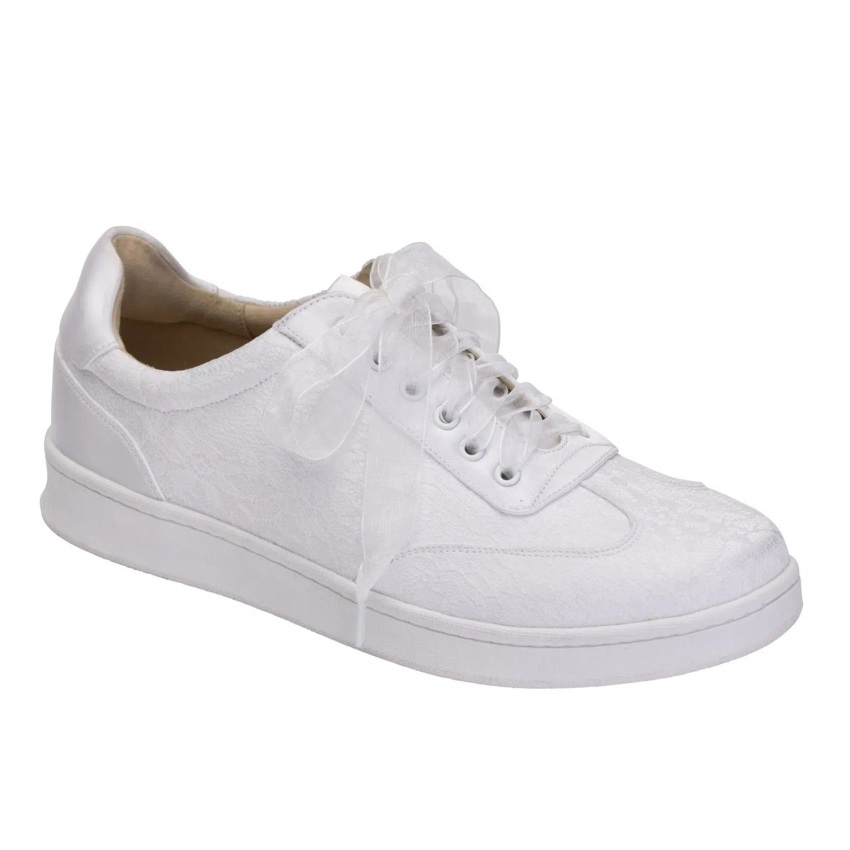 Pensato per le spose che amano lo stile disinvolto, Paisley unisce pizzo di tendenza e forme moderne in un abito da sposa. Come Blossom, è realizzata in delicato pizzo Chantilly avorio, ma con un supporto in raso avorio che conferisce una finitura avorio più ricca e solida. La silhouette sottile assicura una forma lusinghiera e contemporanea, mentre i morbidi lacci in nastro d'organza avorio aggiungono un tocco romantico. Perfetta per le spose che amano la comodità delle scarpe da ginnastica ma che desiderano un look raffinato ed elevato, Paisley abbina uno stile senza sforzo a una vestibilità che dura tutto il giorno. Leggera, graziosa e innegabilmente da sposa, questa scarpa da ginnastica aggiunge un tocco rilassato ma elegante al vostro look del giorno del matrimonio.