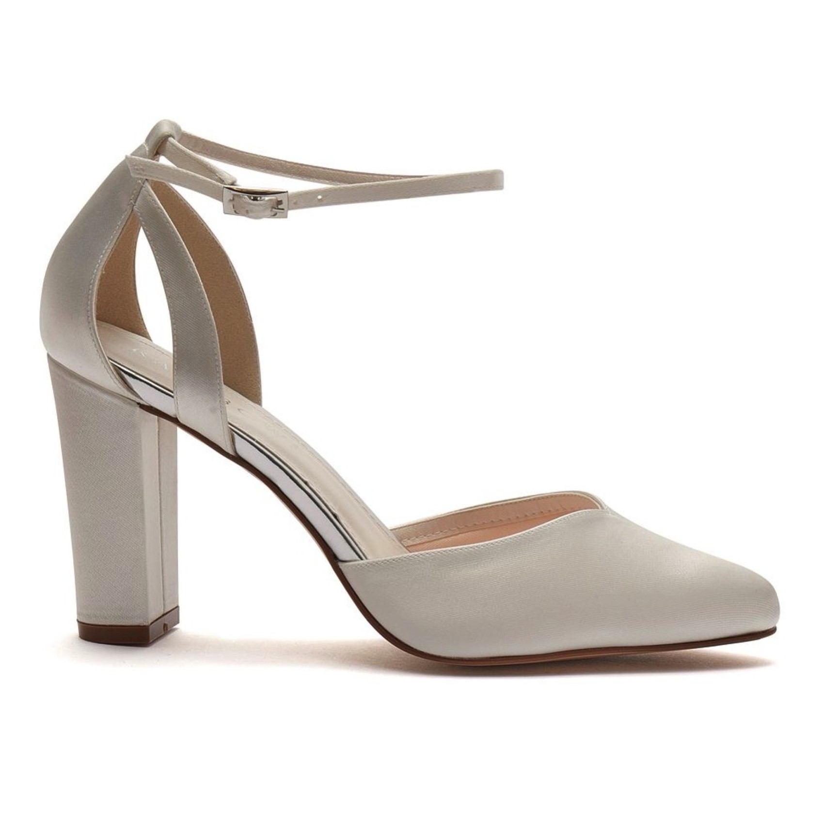 Rainbow ClubRealizzate in raso avorio lucido con finiture in pelle argentata, queste eleganti scarpe da sposa hanno una punta a mandorla, una scollatura a cuore, un retro chiuso con cinturino curvo, un delicato cinturino alla caviglia e sono rifinite con un tacco a blocco adatto a tutti i giorni. Sono una scarpa da sposa ideale per le spose che desiderano altezza e comfort, e possono anche essere tinte per abbinarsi agli abiti delle damigelle o degli invitati.