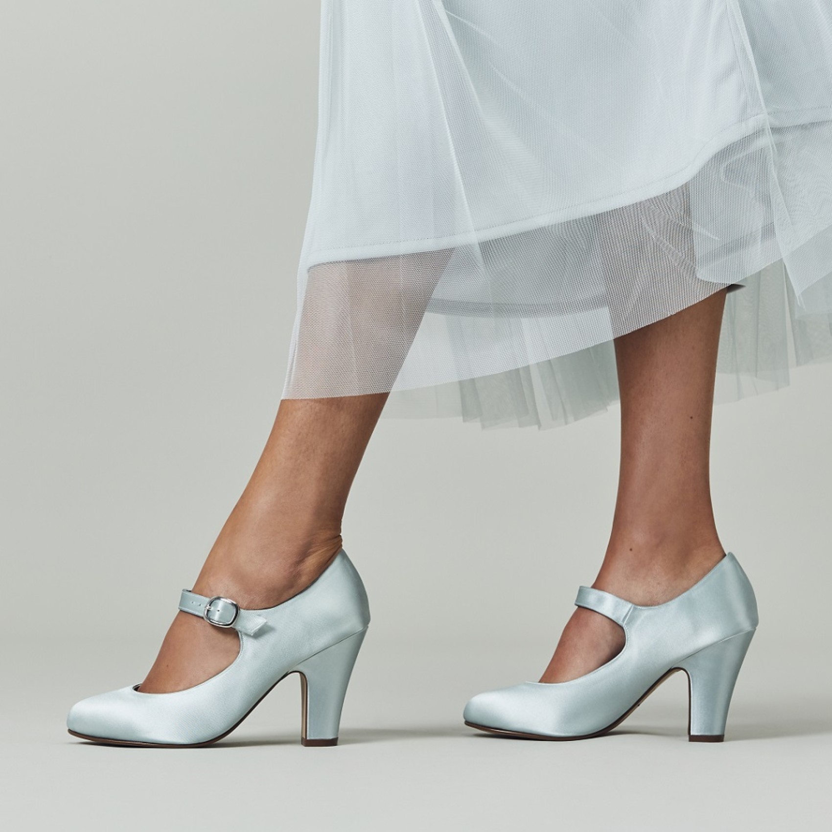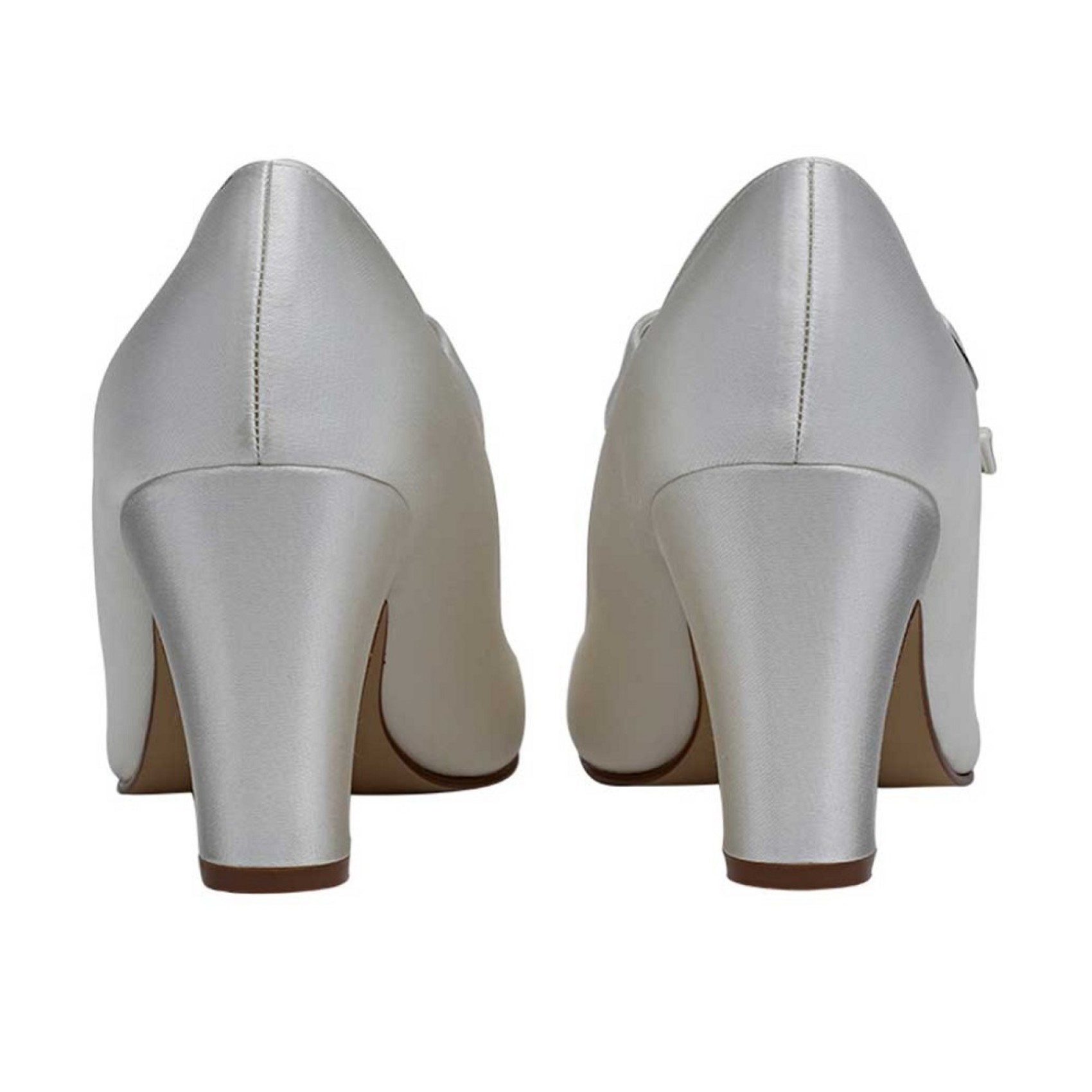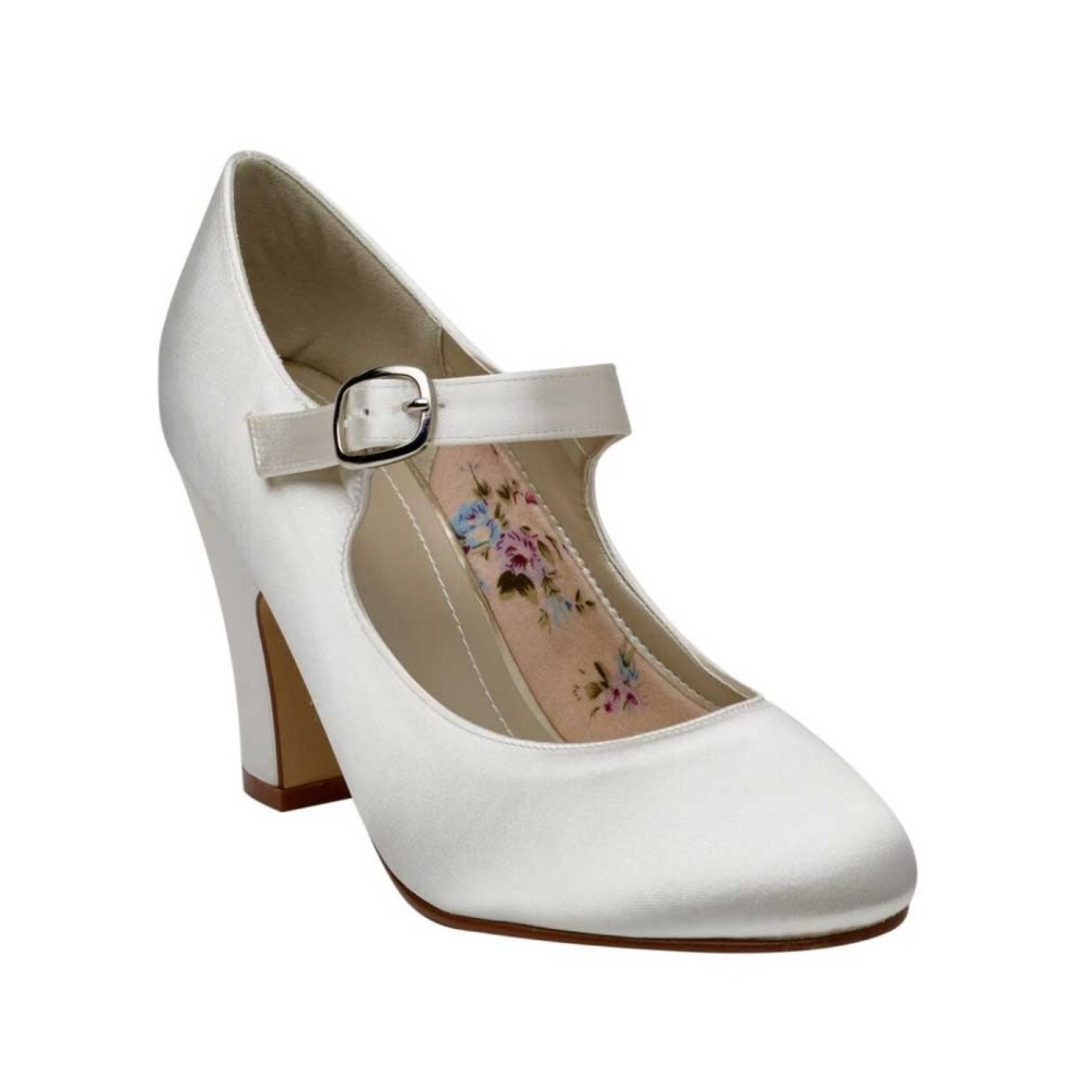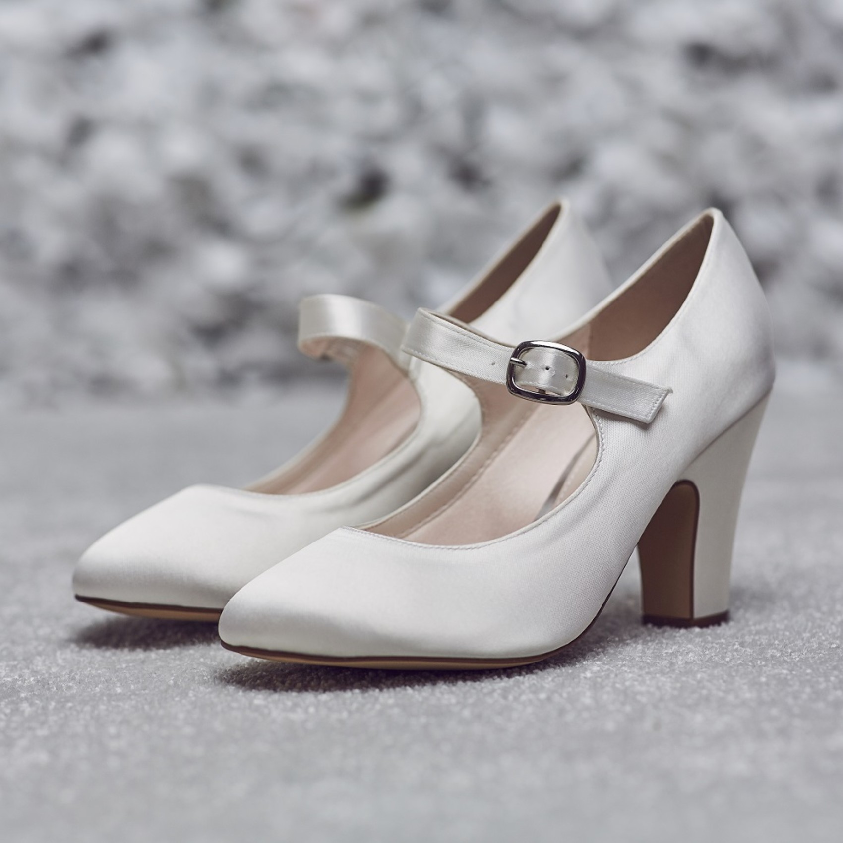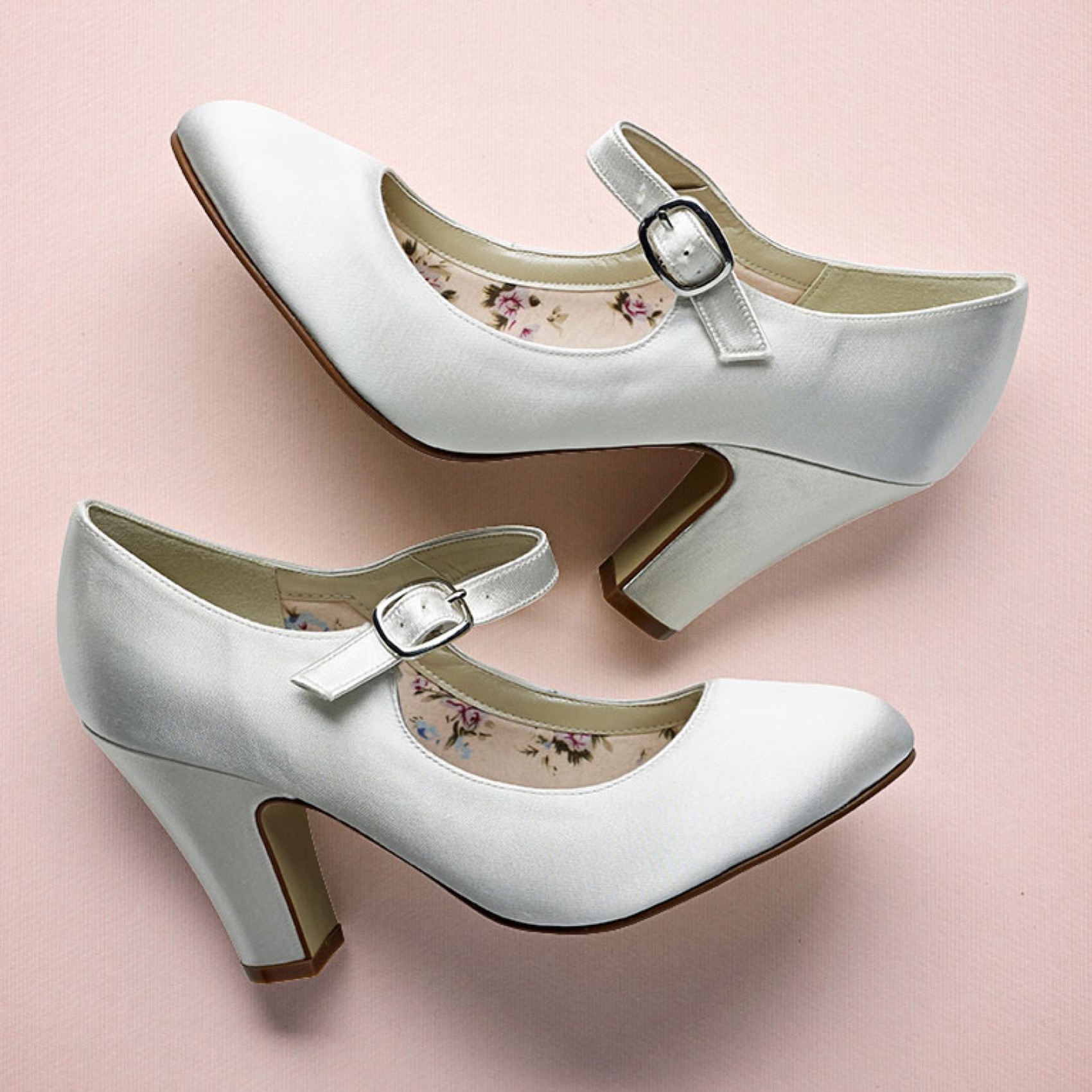 Una splendida scarpa Mary Jane in stile retrò, realizzata in raso color avorio con un tacco grosso per garantire stabilità, rifinita con un ampio cinturino alla caviglia e una fibbia argentata. Le scarpe Madeline sarebbero l'aggiunta perfetta a un abito da sposa anni Cinquanta in raso o pizzo. Realizzate a mano con una morbida fodera in cotone e un'imbottitura in memory foam per garantire il massimo comfort durante tutta la giornata.