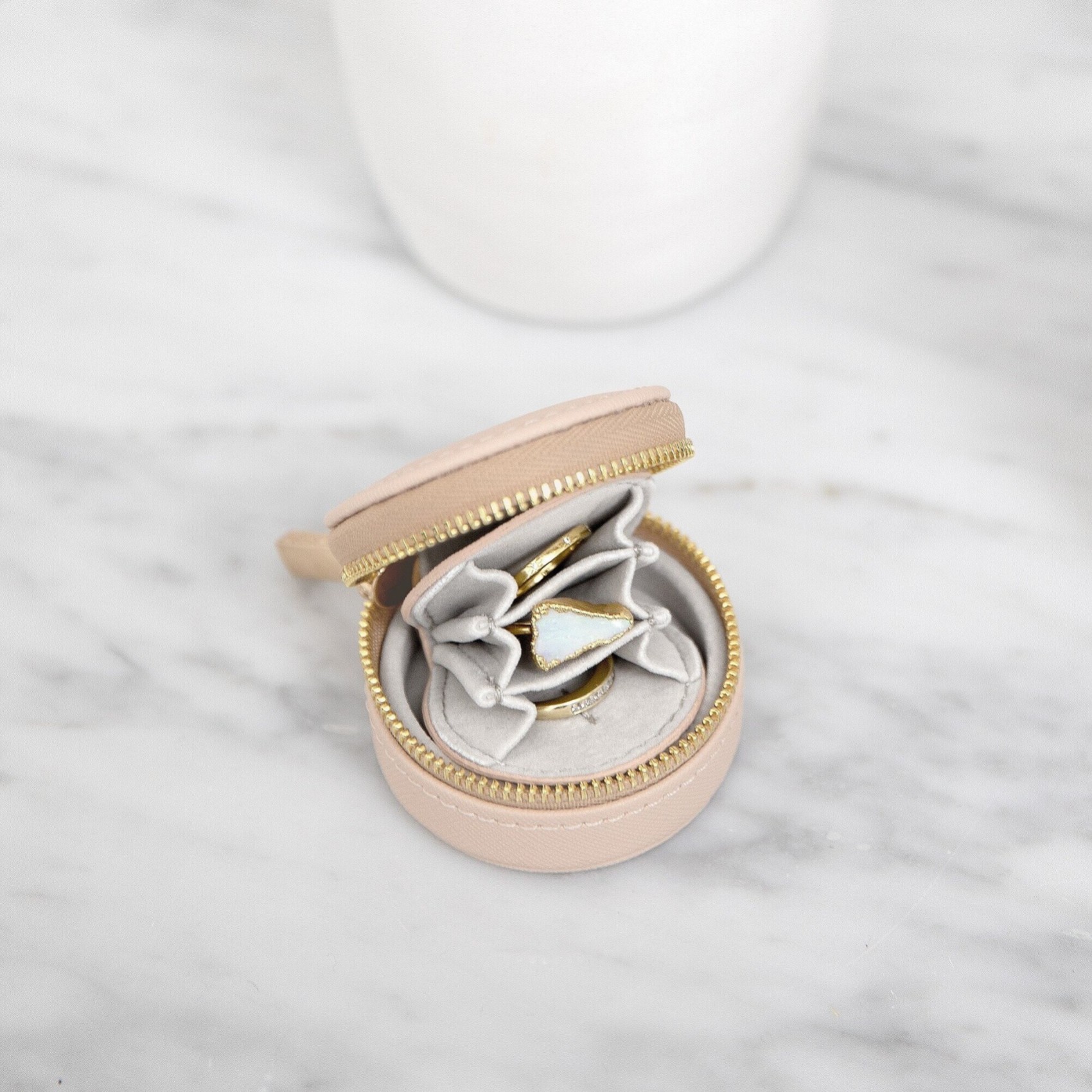 Ideale per un viaggio o da tenere nella borsa della palestra per proteggere e conservare i gioielli. All'interno dello scomparto con cerniera rosa blush si trova un morbido interno in velluto grigio per i vostri gioielli, dotato di una custodia rimovibile con tre scomparti individuali che aiutano a mantenere i vostri gioielli senza grovigli e facili da trovare. Perfetto per un regalo unico da damigella d'onore.