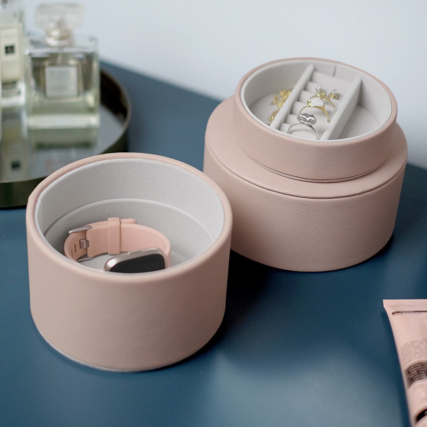 Il portagioie da comodino è il luogo perfetto per tenere al sicuro i vostri tesori quotidiani mentre fate il vostro sonno di bellezza! Compatto ma pratico, il portagioie ha spazio per anelli, orecchini e altri gioielli quotidiani. Sollevando il vassoio interno, si scopre un secondo spazio alla base del portagioie per gli altri ninnoli. Rifinito in ecopelle rosa blush con un interno in morbido velluto grigio.