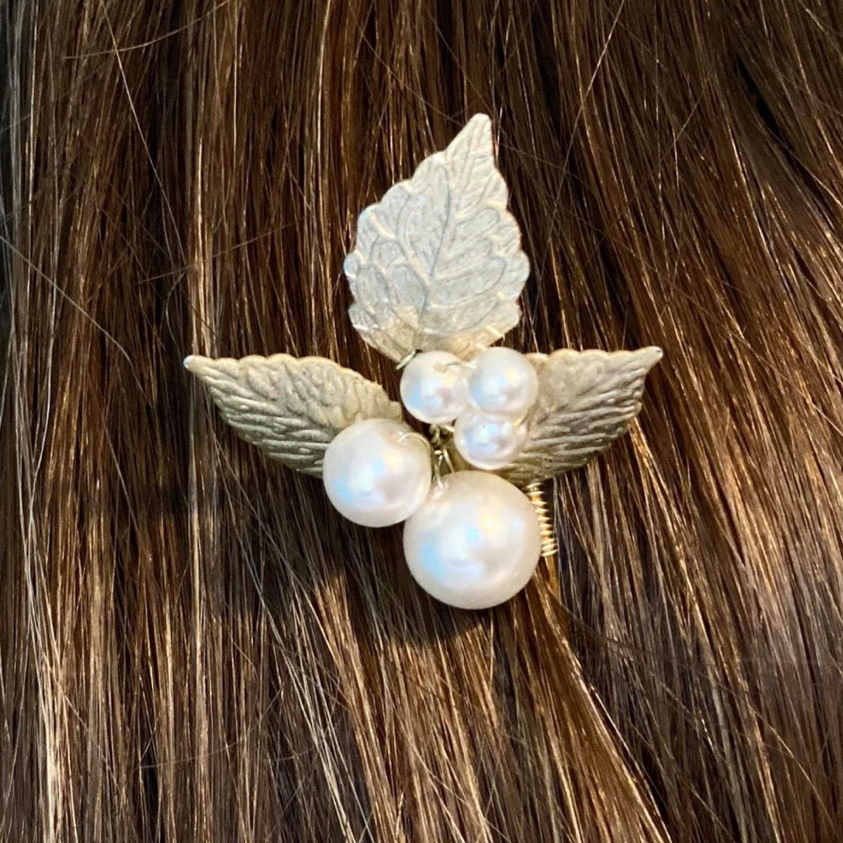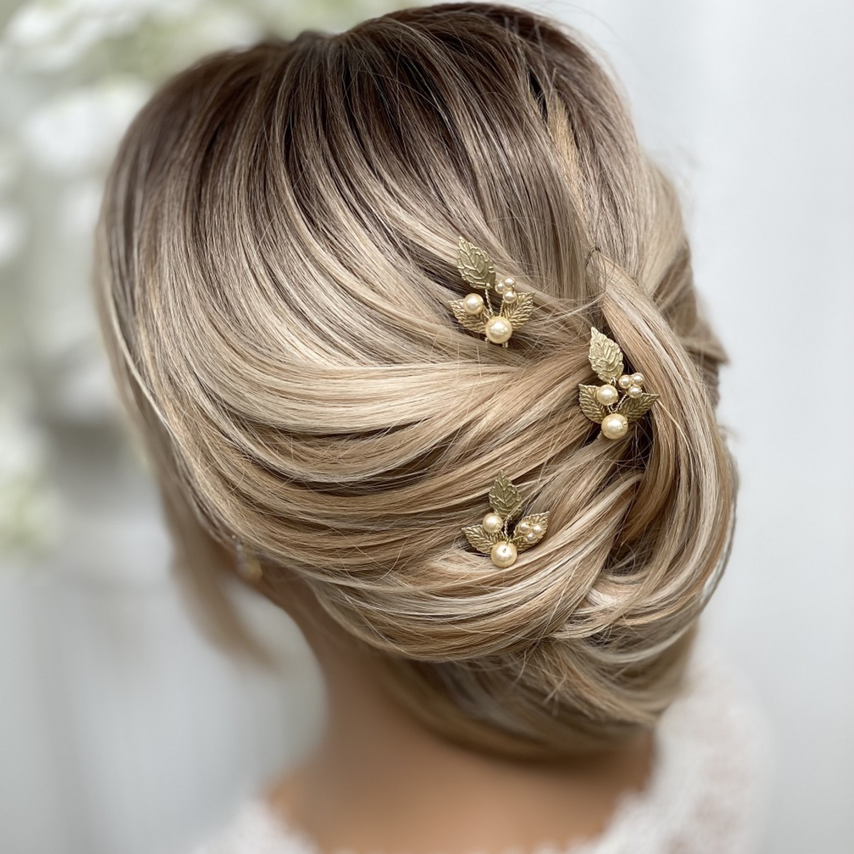 Un bellissimo set di 3 spille per capelli con perle e foglie, realizzate a mano con un trio di delicate foglie smaltate e un gruppo di perle Swarovski di varie dimensioni. Progettate per completare il pettine Aurelia e la mezza aureola, o per essere combinate con le nostre spille per capelli Iris per un look da sposa personalizzato. Queste spille per capelli da sposa e da damigella sono perfette per una cerimonia all'aperto e rilassata. L'elegante design a foglia rende queste spille ideali per un matrimonio autunnale.