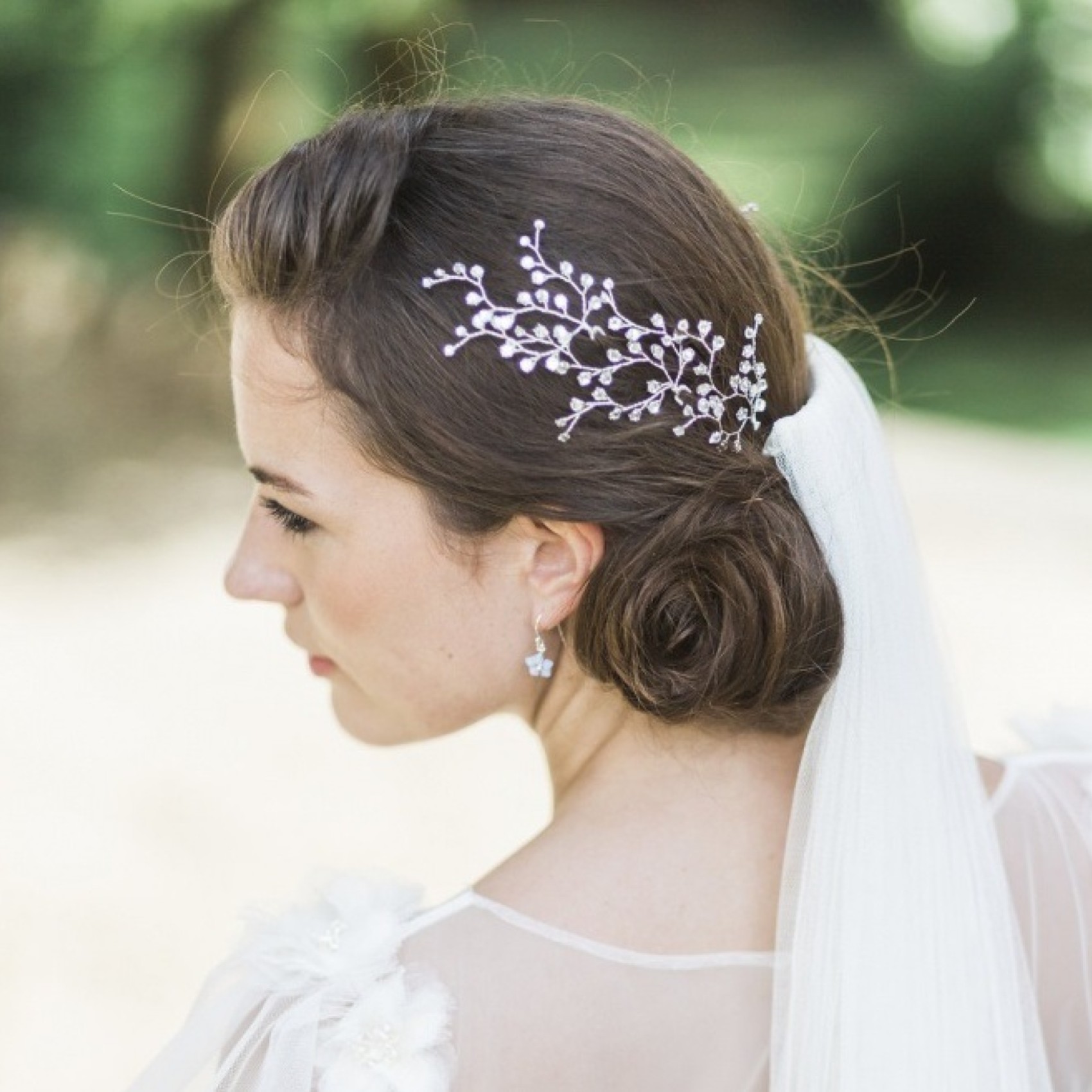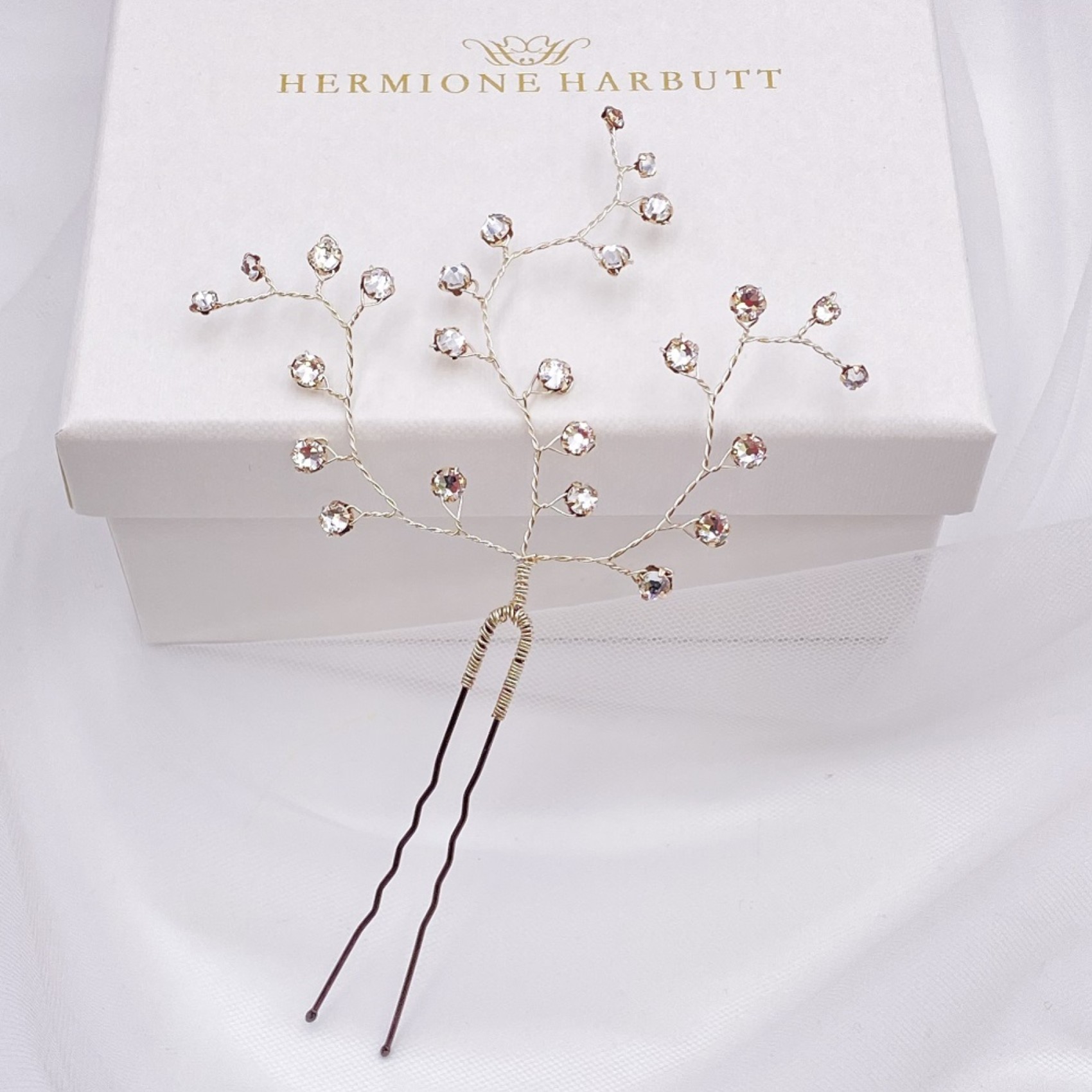 Delicati viticci di scintillanti cristalli Swarovski incastonati che danno l'effetto di graziose gocce di rugiada tra i capelli. Perfetti per essere disposti lateralmente, sopra il velo o a puntini su ogni lato dei capelli.
