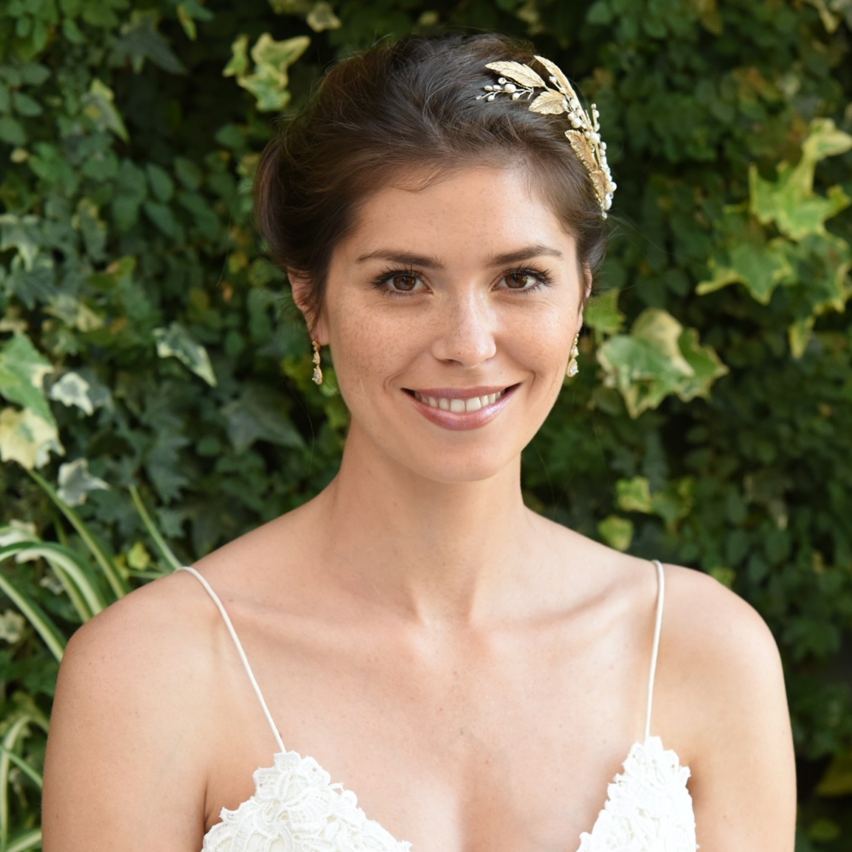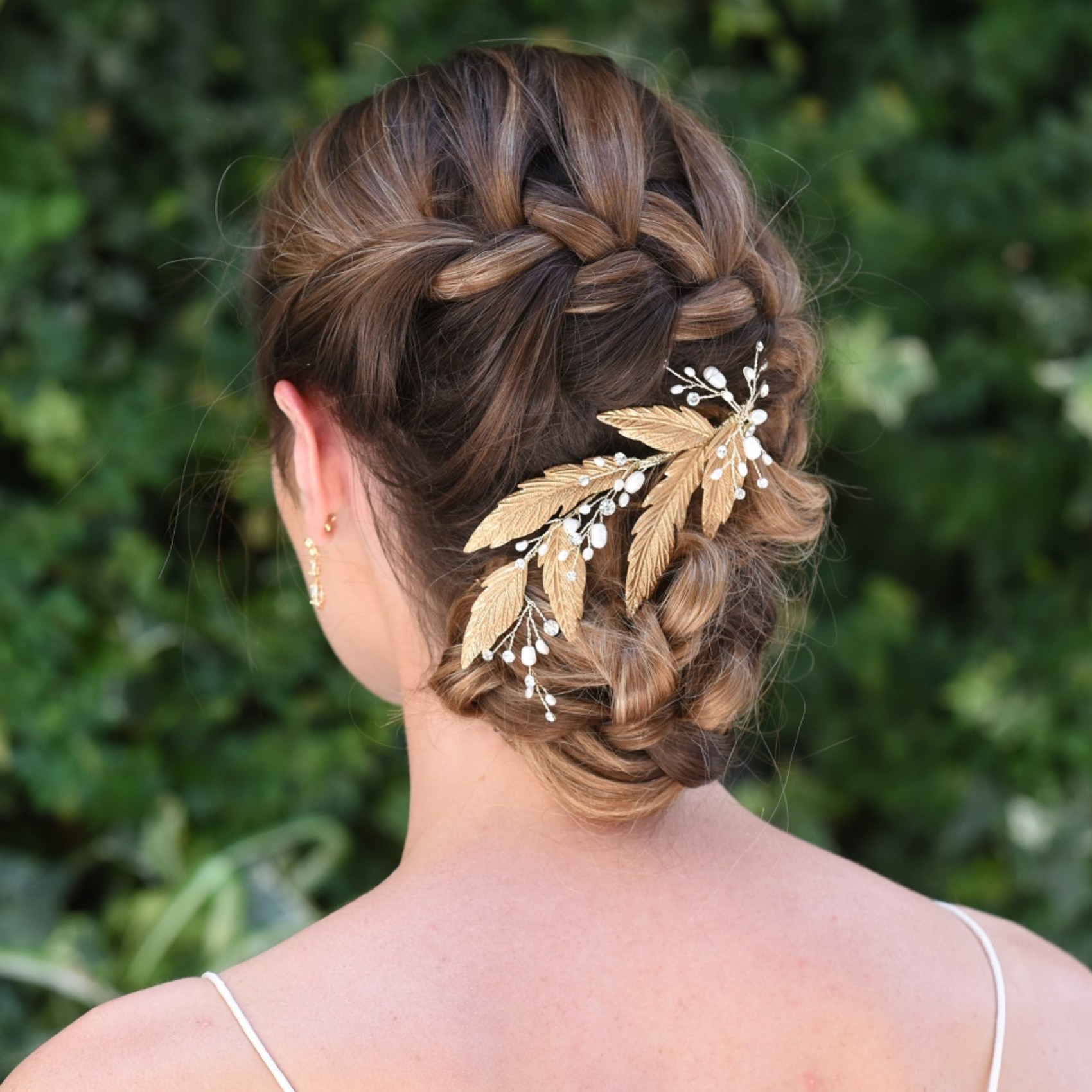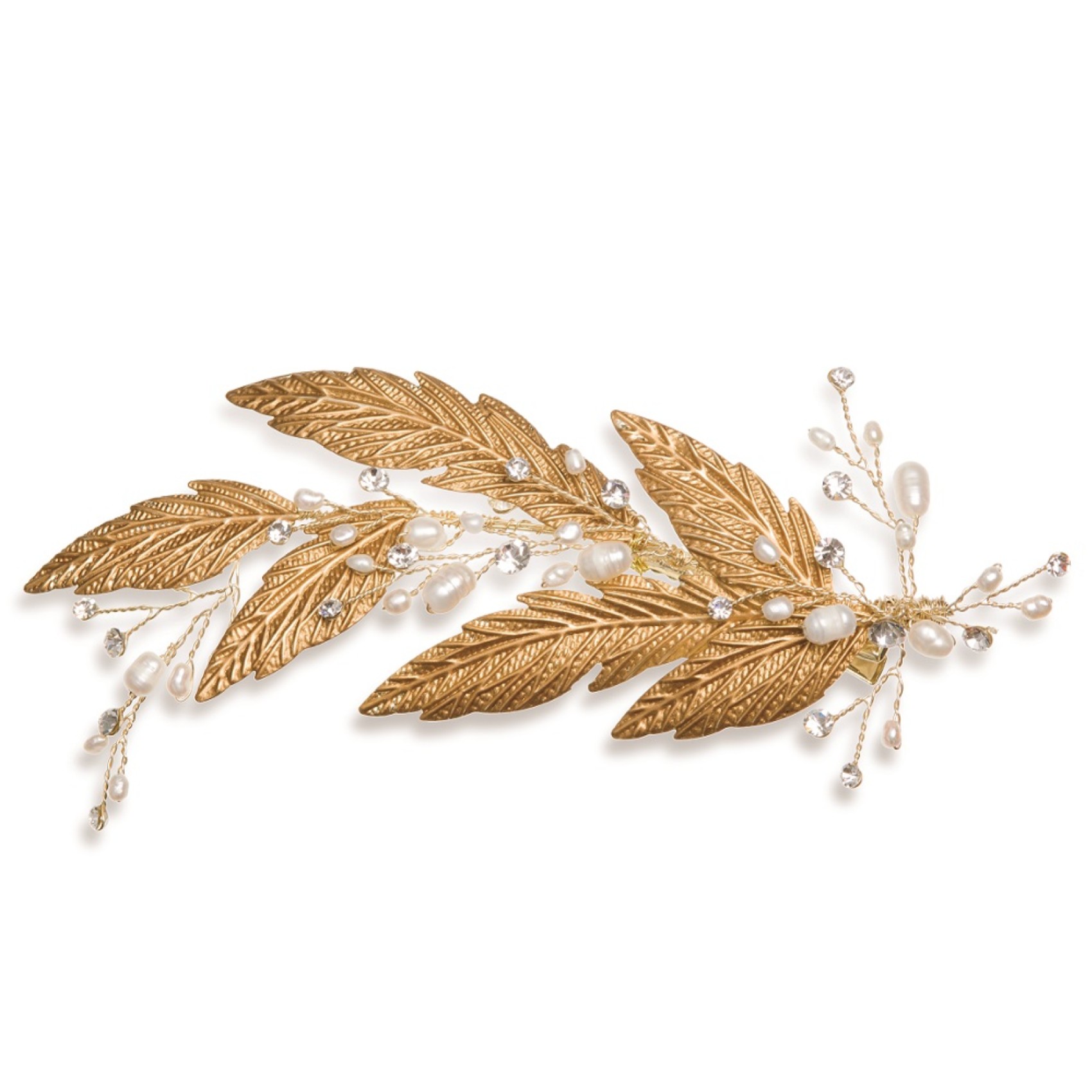 Un fermaglio organico per capelli da sposa ornato da delicate foglie smaltate in bronzo, da rametti di pietre solitarie dal taglio abbagliante e da autentiche perle d'acqua dolce. Perfetto per un romantico matrimonio autunnale, da infilare a lato di un'acconciatura scompigliata per un look da sposa boho e rilassato. Si fissa ai capelli con un piccolo fermaglio in coccodrillo.