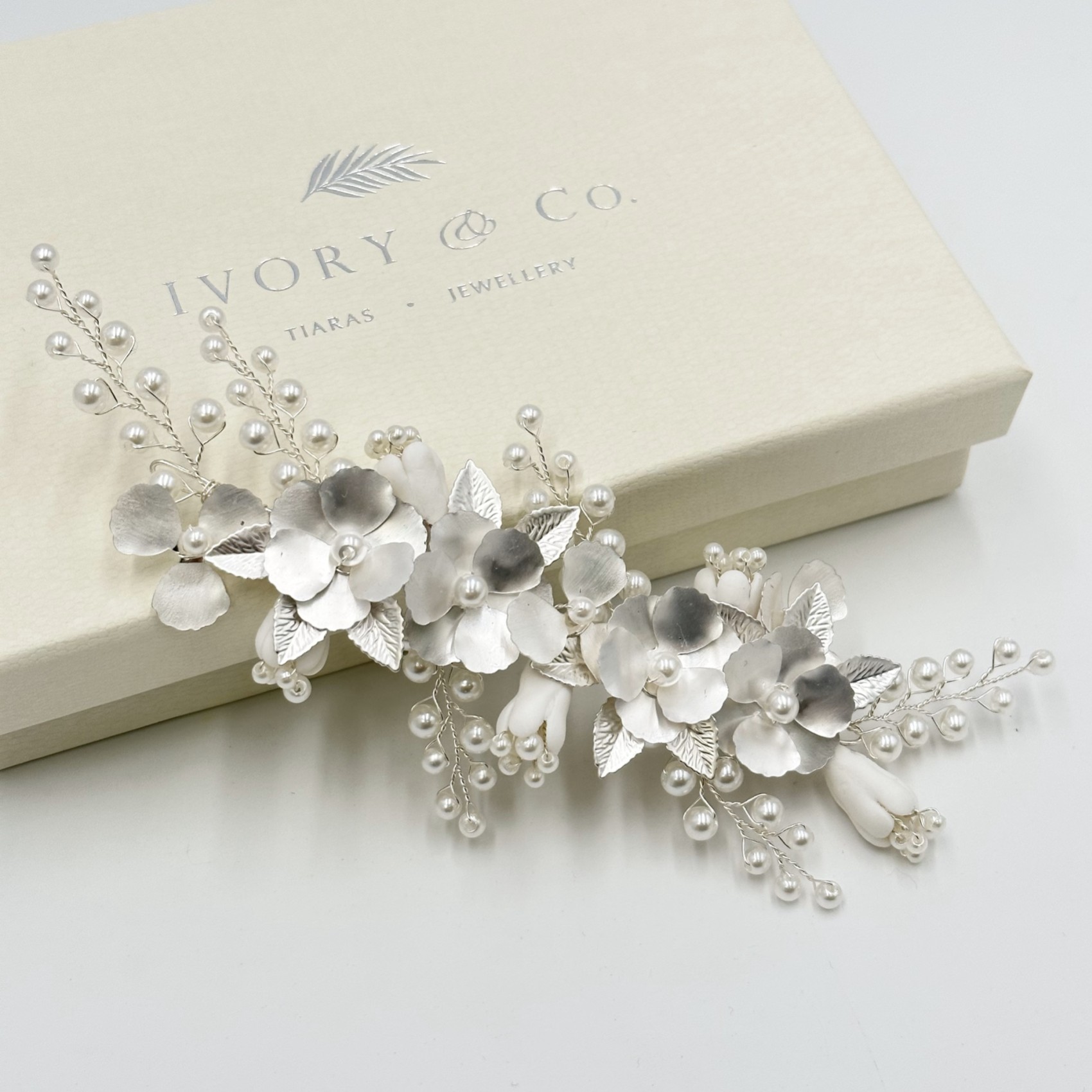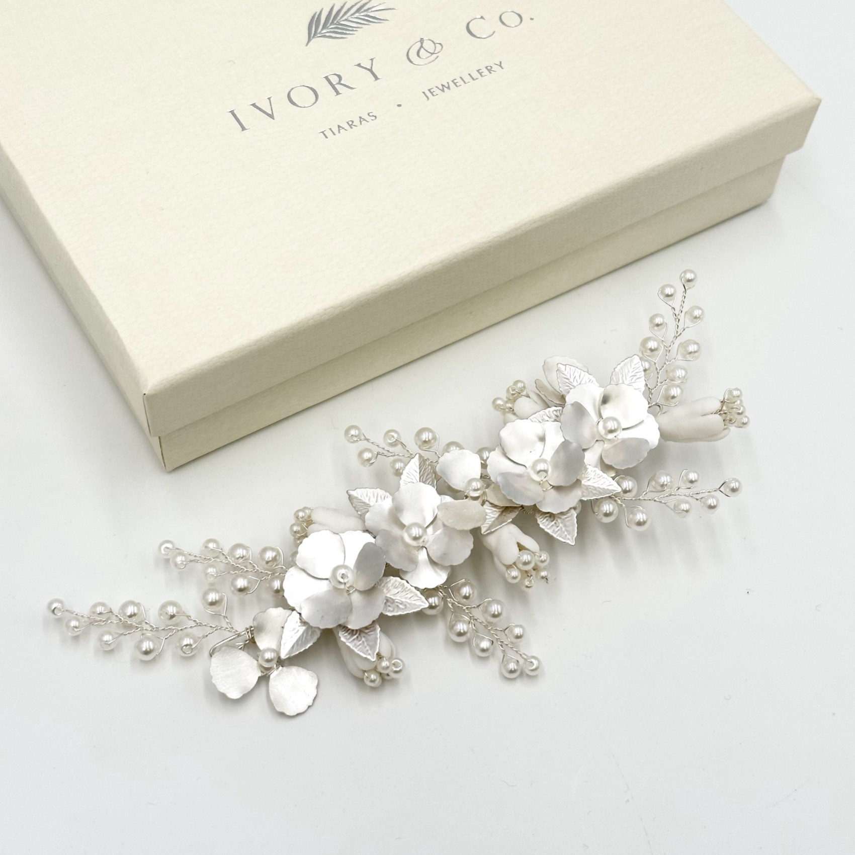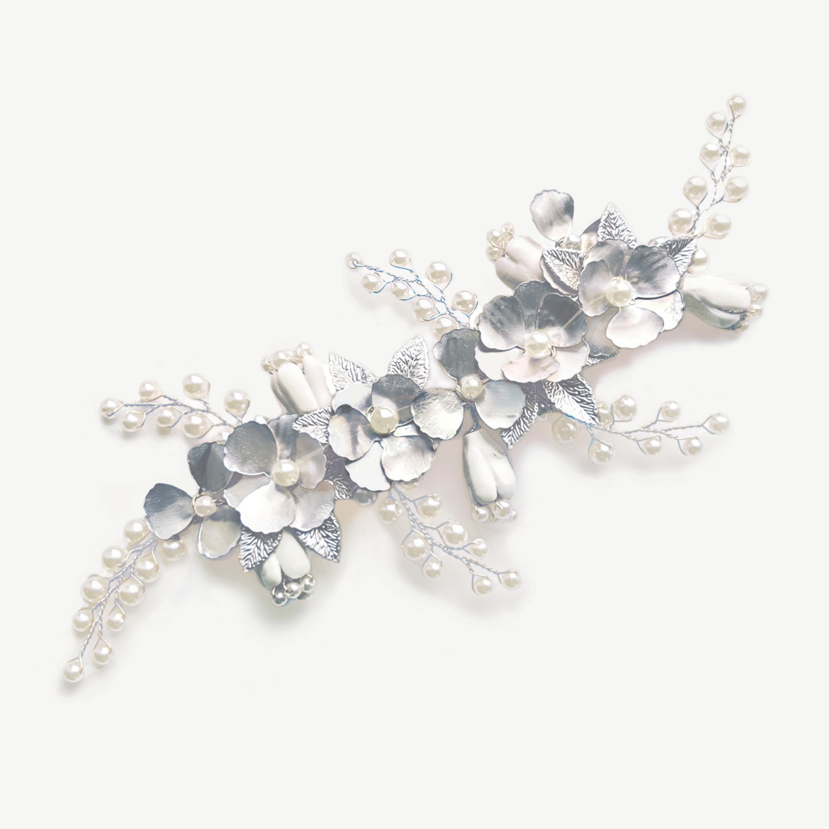 Un bellissimo e unico fermaglio floreale per capelli da sposa con delicati fiori e foglie d'argento smaltati a mano, rifiniti con rametti di delicate perle finte color avorio. Fresco e informale, questo copricapo è perfetto per matrimoni romantici o boho.