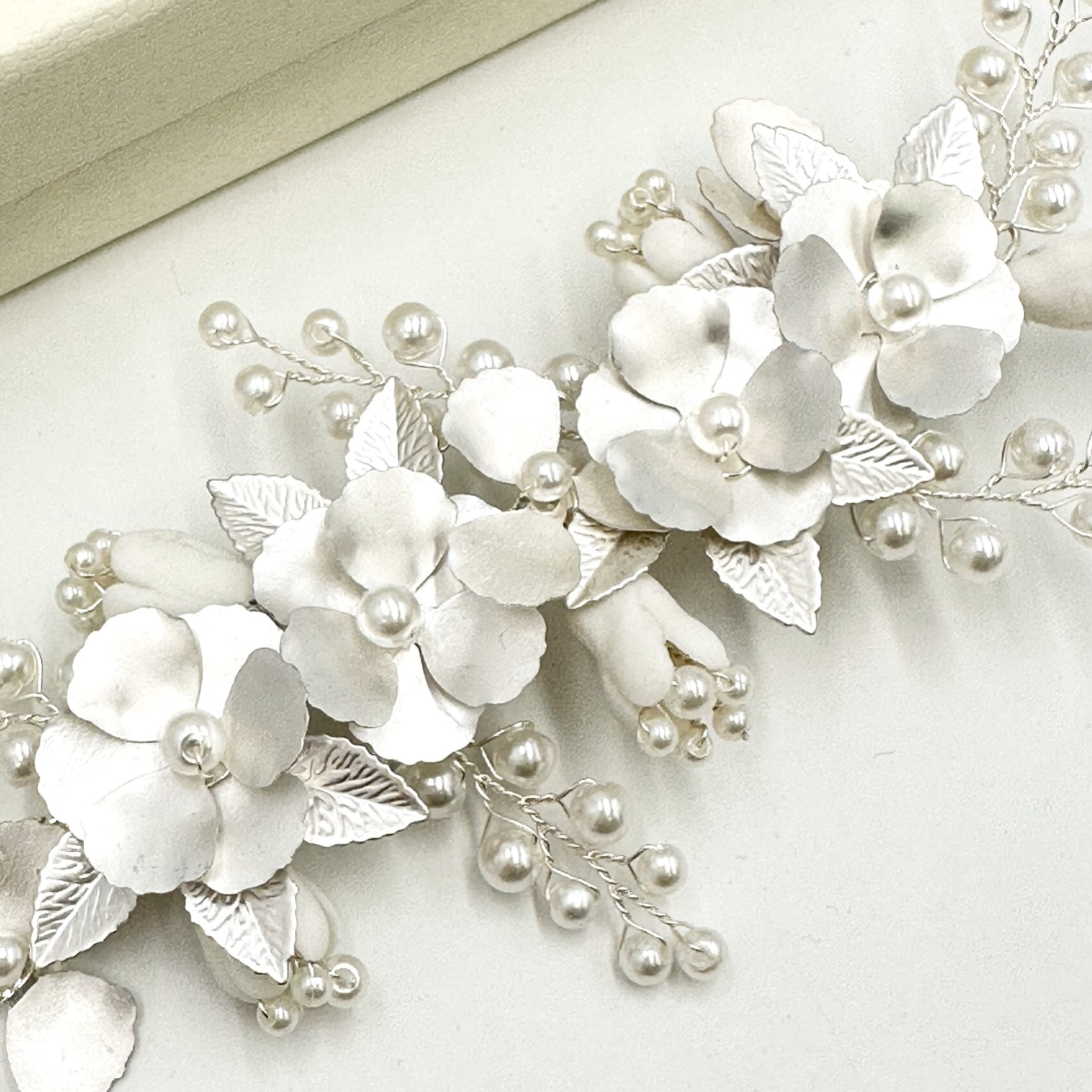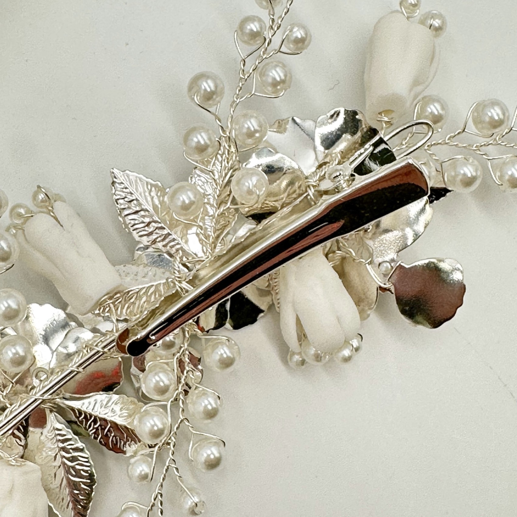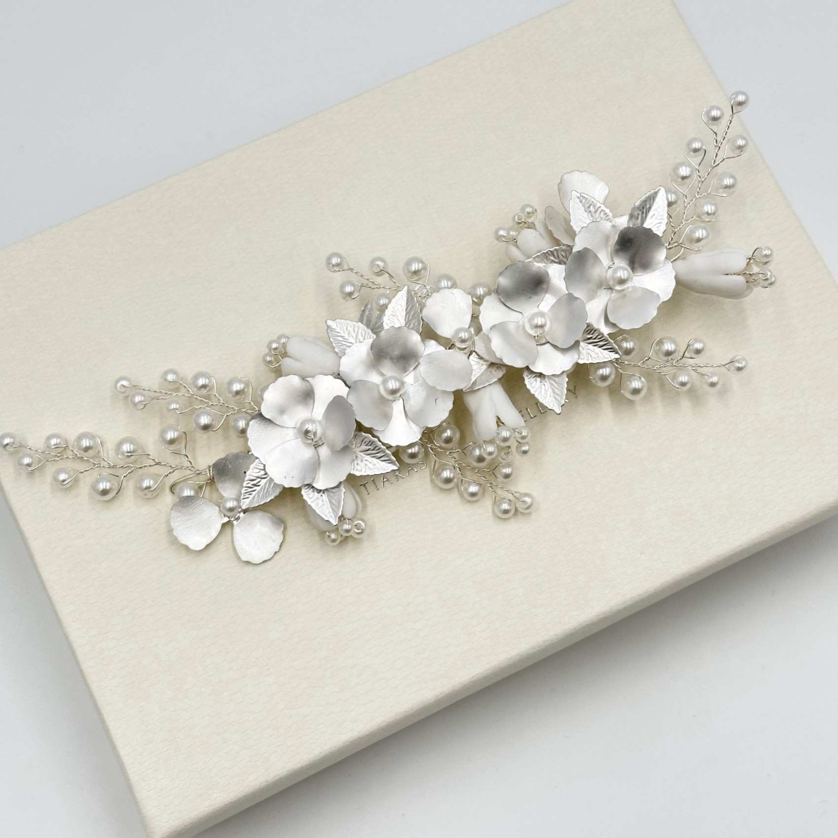 Un bellissimo e unico fermaglio floreale per capelli da sposa con delicati fiori e foglie d'argento smaltati a mano, rifiniti con rametti di delicate perle finte color avorio. Fresco e informale, questo copricapo è perfetto per matrimoni romantici o boho.