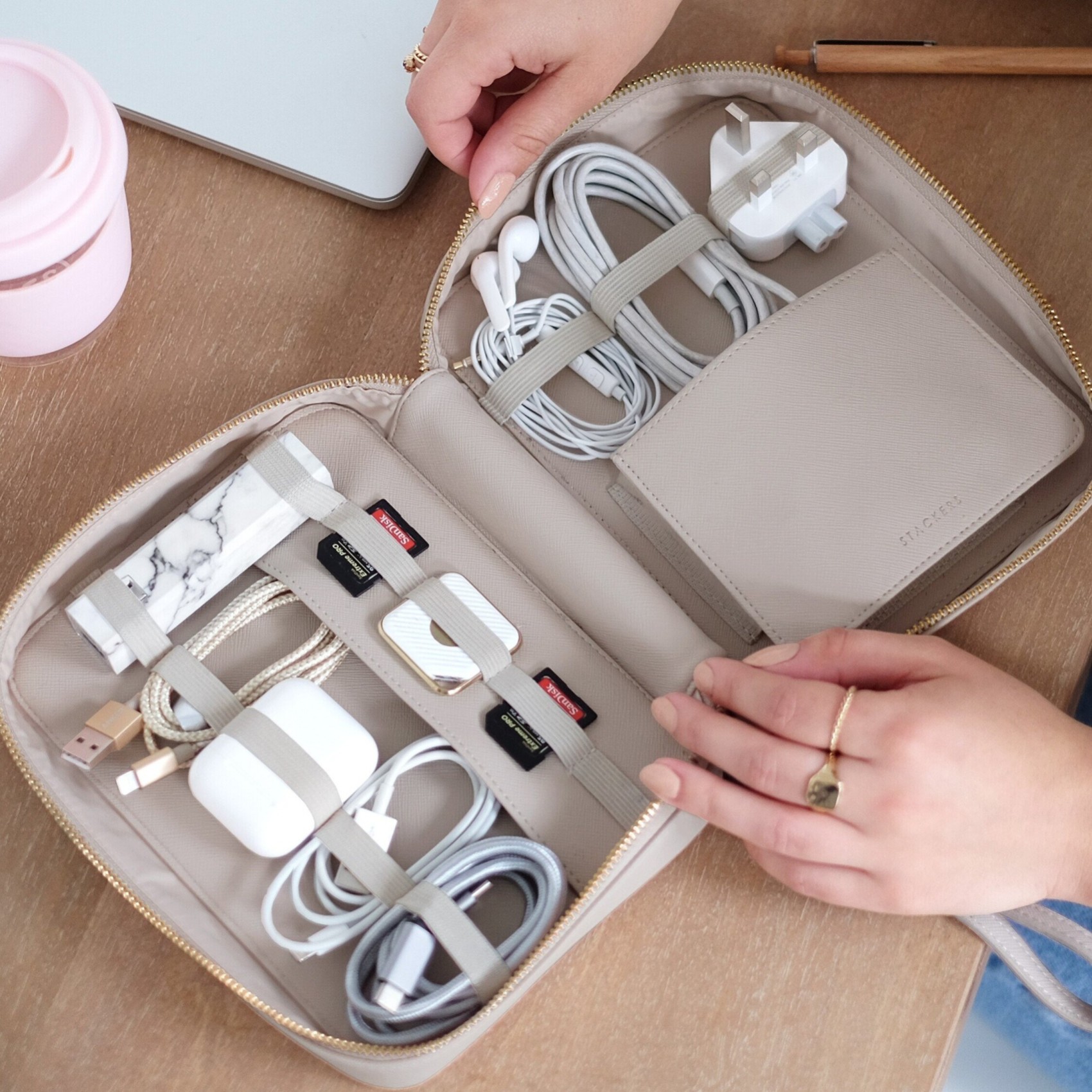 Chi avrebbe mai detto che organizzare i cavi potesse essere così bello? Organizzate la vostra tecnologia in viaggio o a casa. Il raccoglitore di cavi stackers taupe è dotato di diversi scomparti interni progettati per i vostri cavi, schede di memoria, caricabatterie e altro ancora. Addio al caos dei cavi!