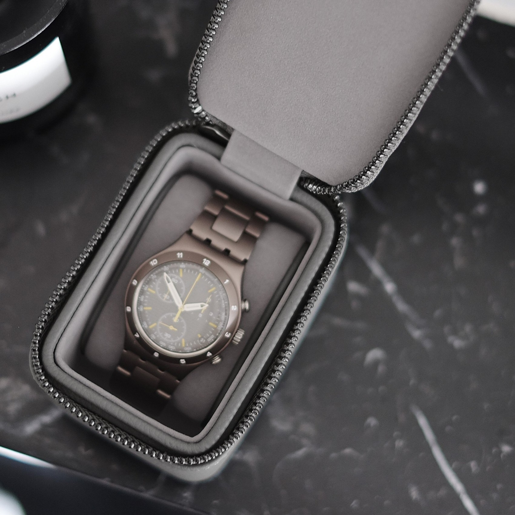 Mantenete la vostra collezione di orologi organizzata e al sicuro con questo portaorologi da viaggio grigio ardesia. Con l'esterno in pelle vegana e la fodera in velluto, è l'ideale per tenere gli orologi al riparo da graffi e polvere. Facilmente accessibile e protetto da una chiusura a zip.