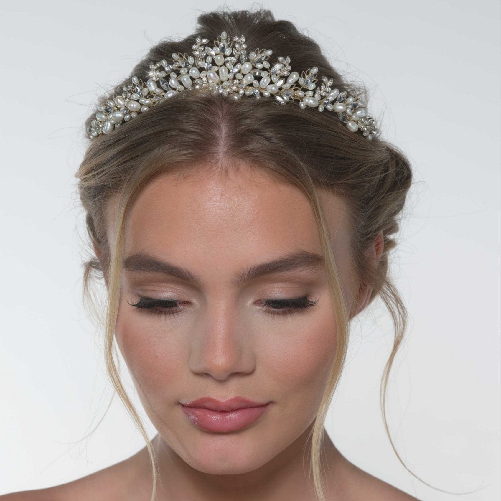 Un diadema da sposa dalla forma perfetta, delicato e di grande effetto allo stesso tempo. Splendidamente realizzato con perle d'acqua dolce color avorio, intrecciate a mano con foglie di cristallo dorato per il più bel tocco di scintillio. Questo elegante diadema è la scelta ideale per una cerimonia più rilassata, pur mantenendo un aspetto classico.