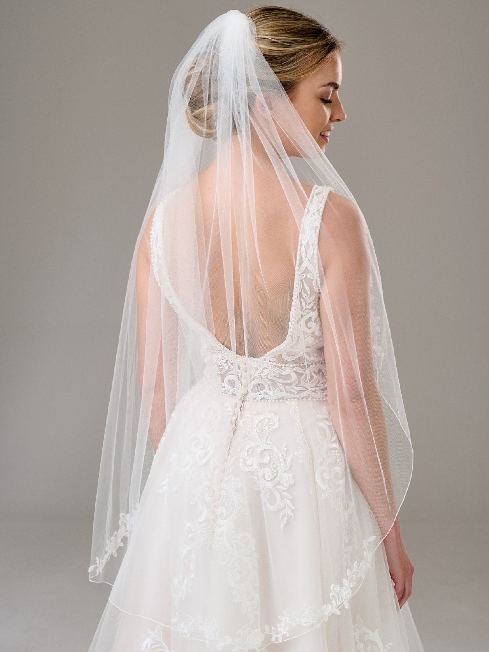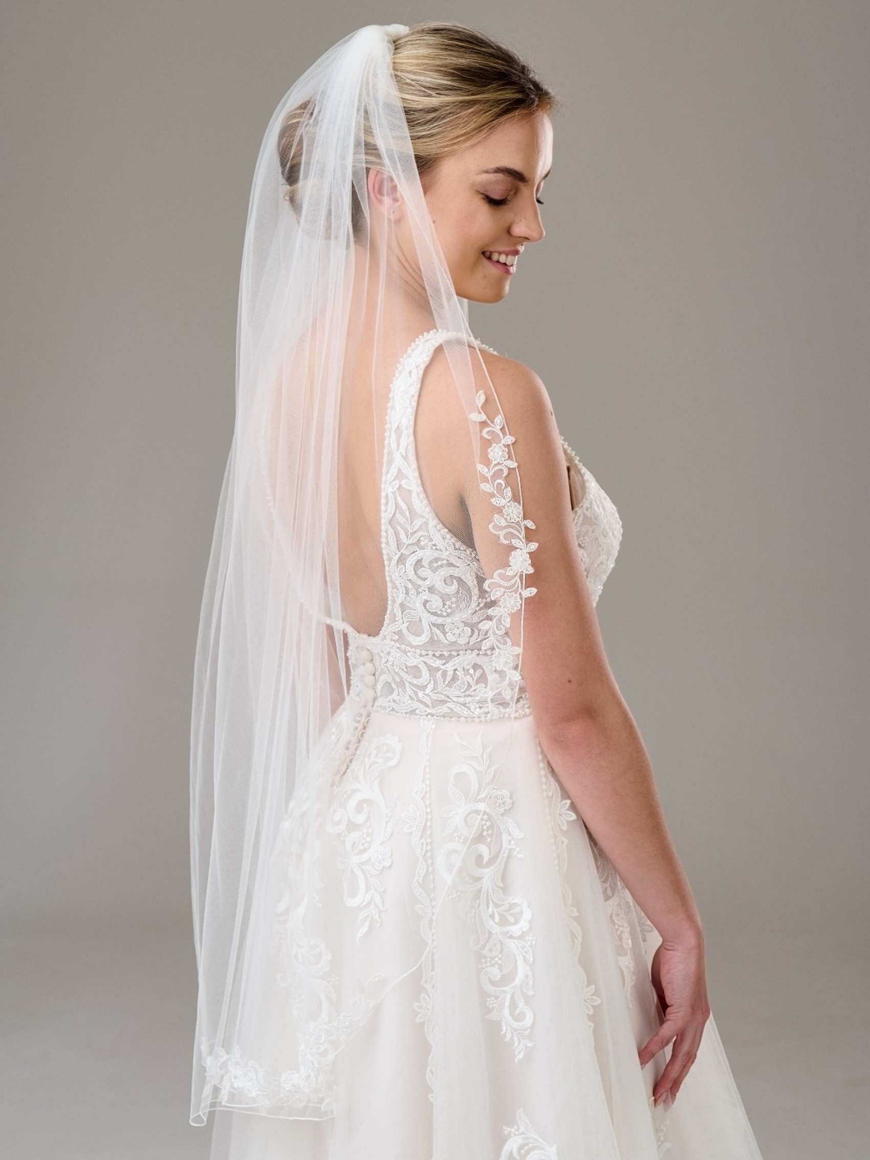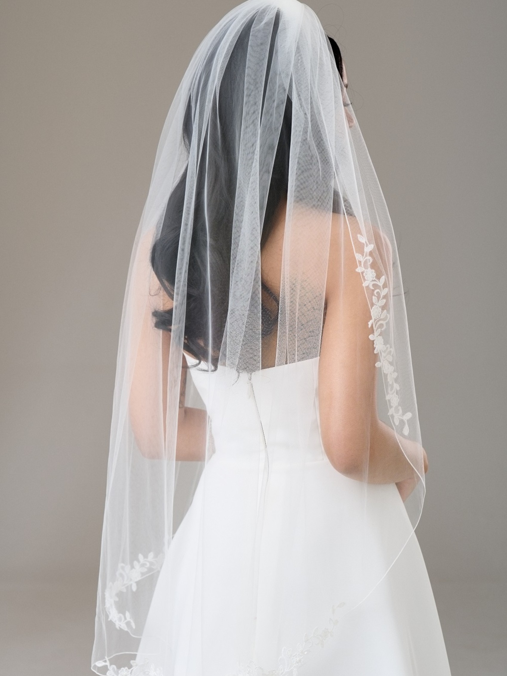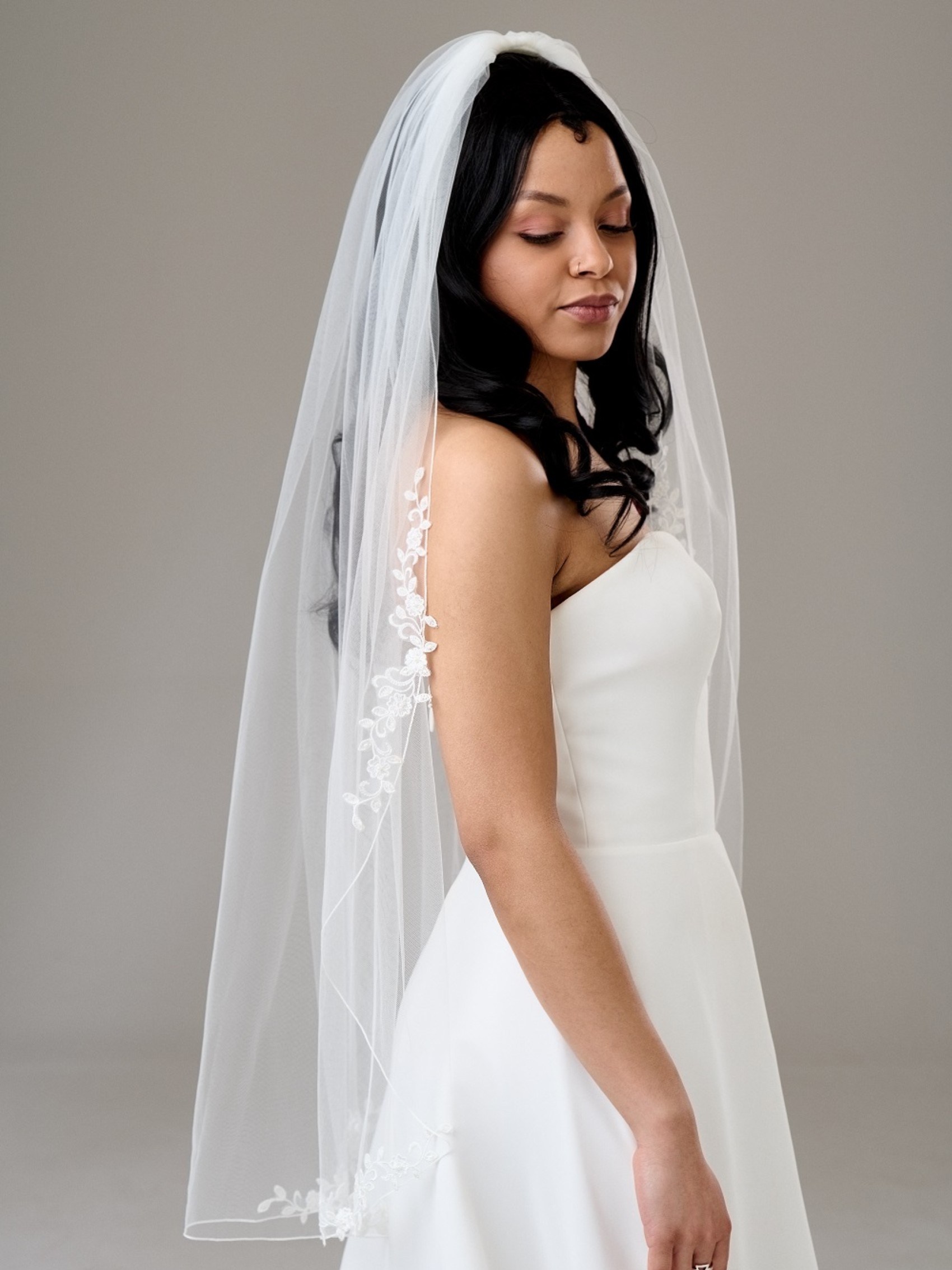 Un unico strato di morbido tulle avorio decorato con delicato pizzo floreale è un velo da sposa semplice ma attraente. Ogni motivo di pizzo è dettagliato con delicate perle avorio e perline per un sottile luccichio. Una scelta splendidamente femminile per la sposa moderna, questo velo da sposa è altrettanto splendido sia con un abito semplice senza spalline che con un dettagliato abito A-line. Disponibile in 5 diverse lunghezze, dal gomito all'elegante cattedrale.