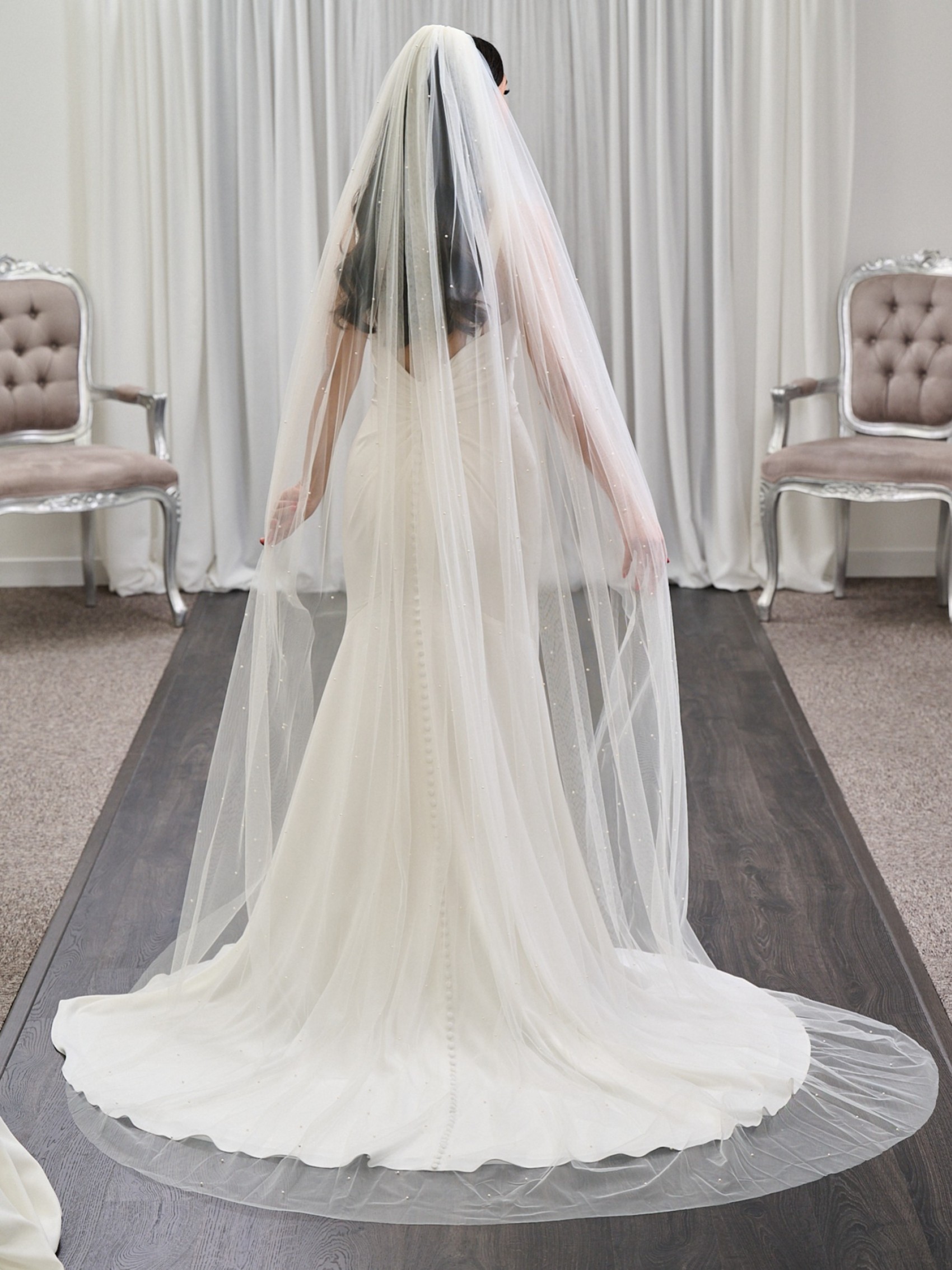 Our Camden veil is the epitome of perfection. A beautifully elegant single tier bridal veil handcrafted from luxury Italian tulle featuring a clean cut edge and scattered with dainty ivory pearls all over. Designed to add a touch of timeless elegance to any bridal ensemble the pearls are artfully placed across the veil, adding a touch of understated glamour without overwhelming the overall look.