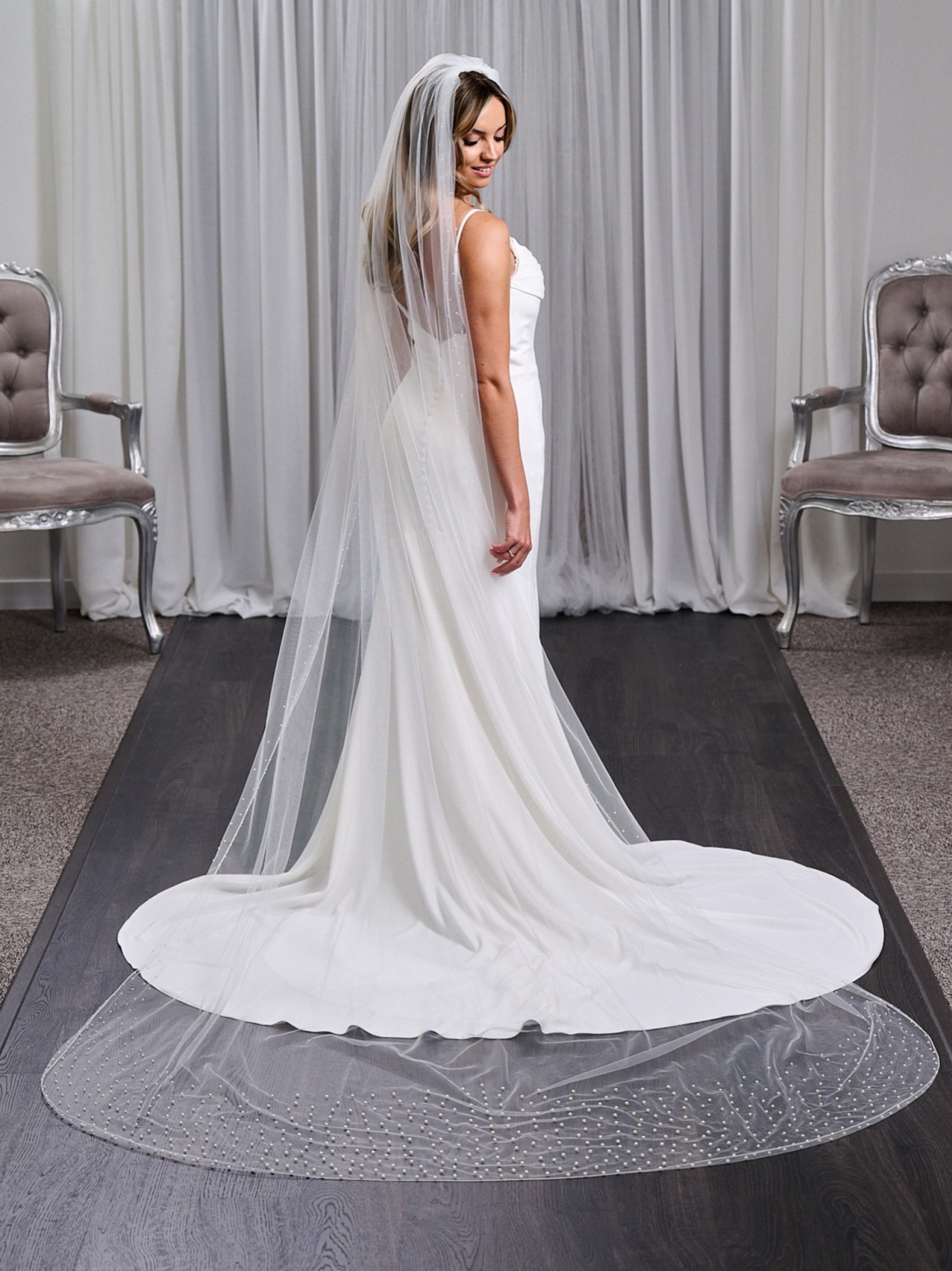 Splendido velo da sposa lungo, Chicago è realizzato in un'unica striscia di morbido tulle avorio con uno strascico di perle pesantemente impreziosito da un bordo più stretto di perle sul pettine. Rifinito con un bordo pulito a cordoncino, questo velo lungo di perle si abbina a un abito elegante per uno splendido look da sposa moderno.