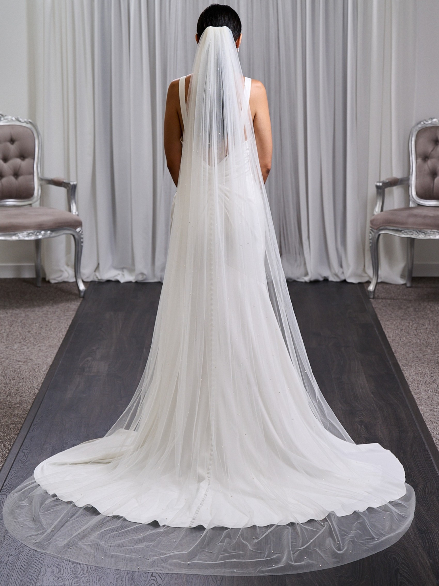 A myriad of sparkling crystals and dainty ivory pearls are scattered over single layer of soft Italian tulle in this beautiful wedding veil. The perfect choice for brides who can't choose between a pearl and crystal veil, this design pairs well with so many different bridal gowns.