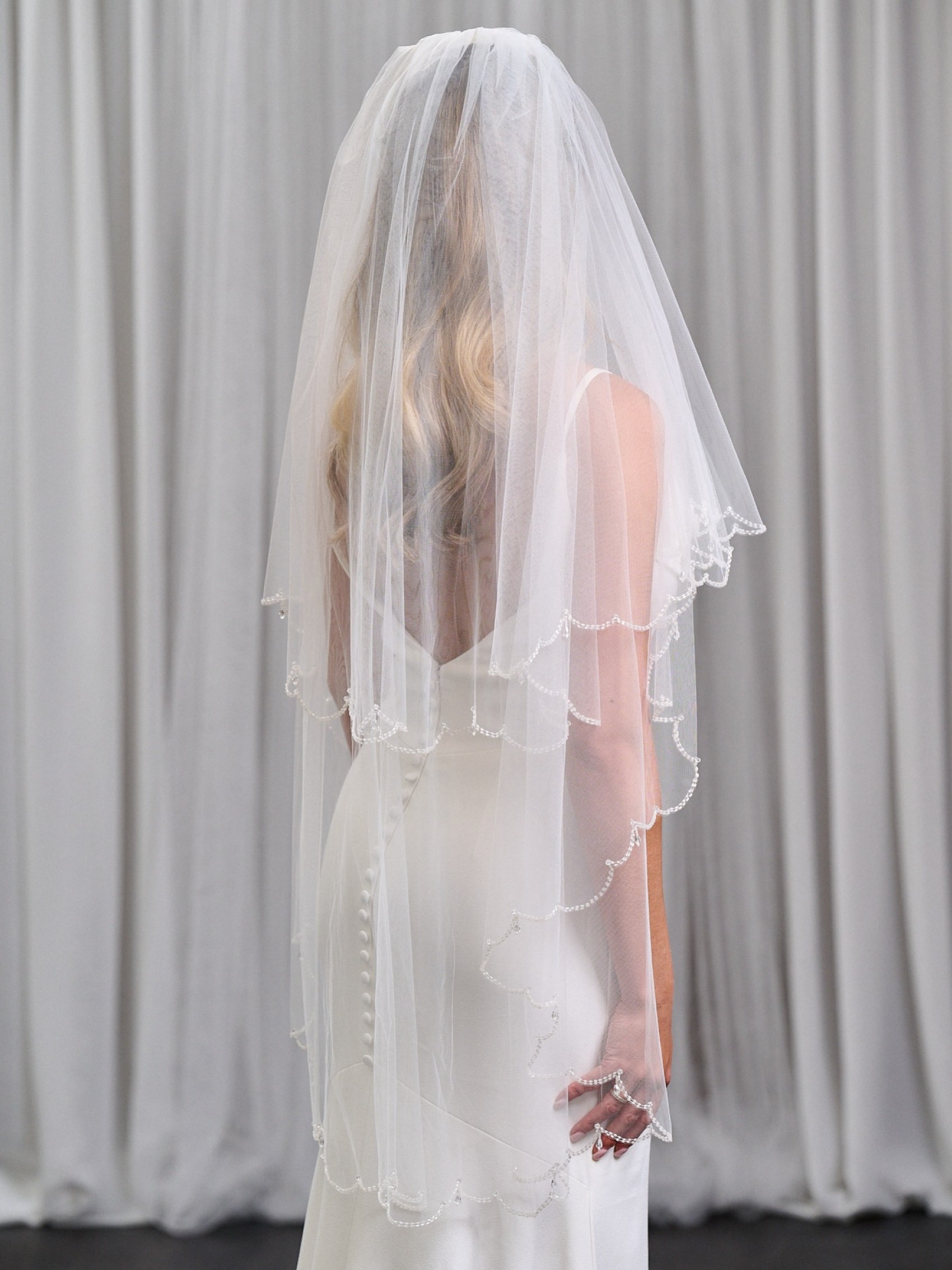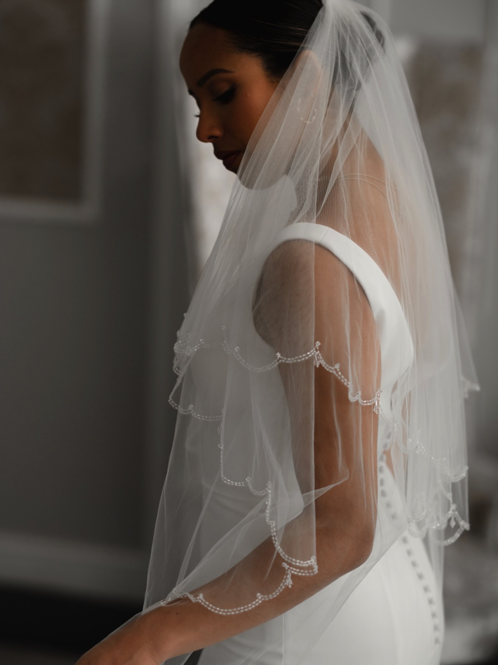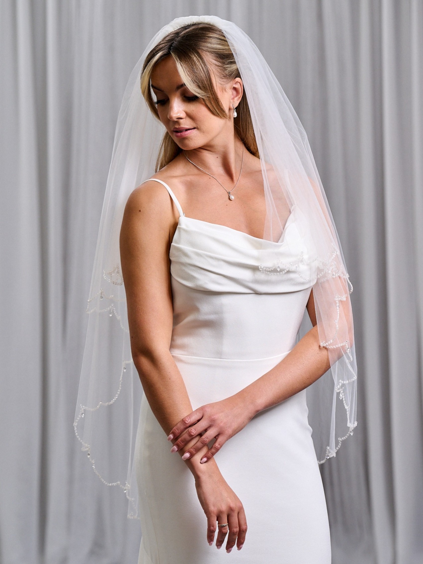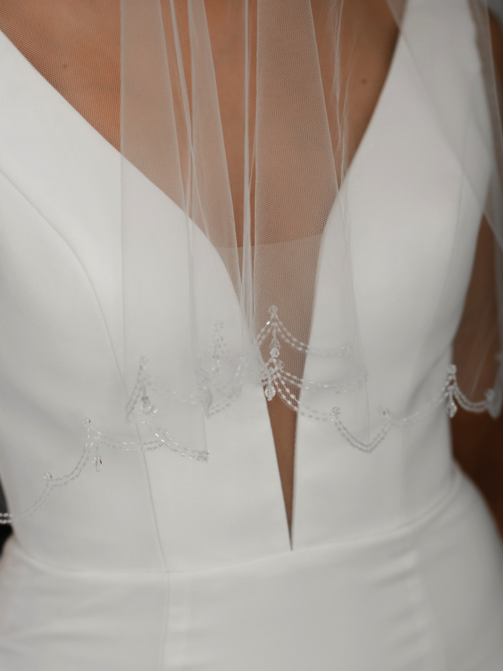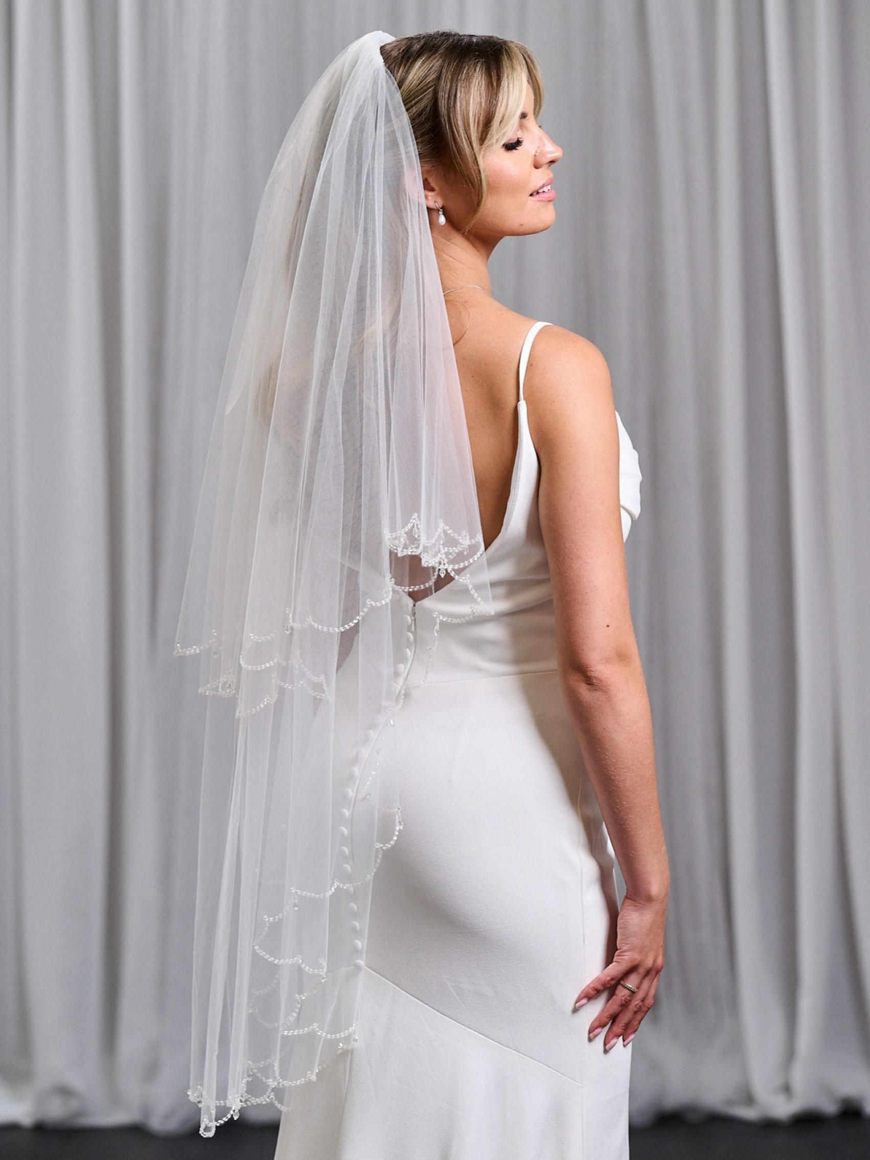 Un bellissimo velo da sposa a due livelli con un doppio bordo smerlato rifinito con gocce di cristallo scintillanti. Questo splendido velo da sposa, disegnato da Linzi Jay, è il modo perfetto per aggiungere dettagli a un abito da sposa semplice.