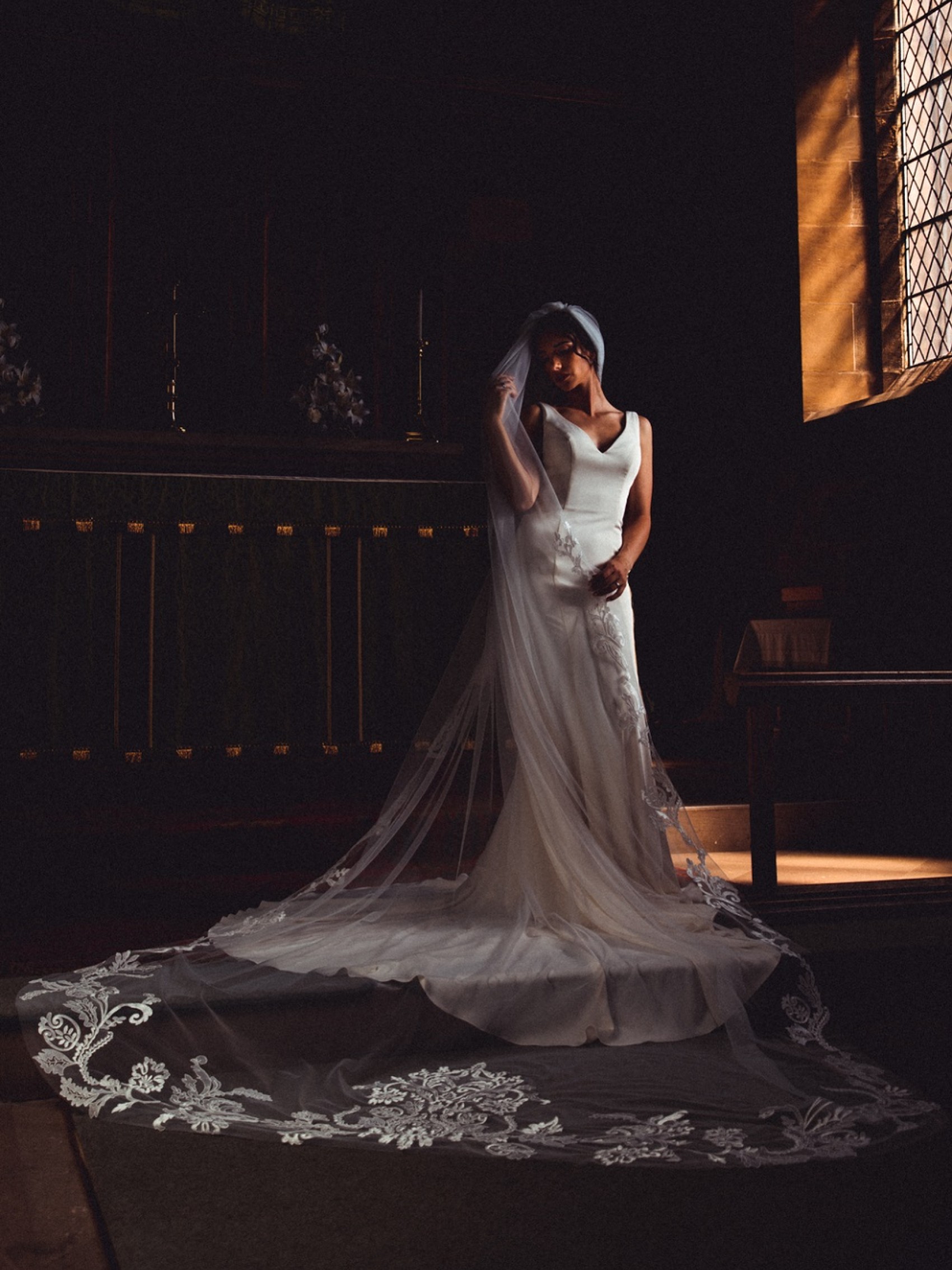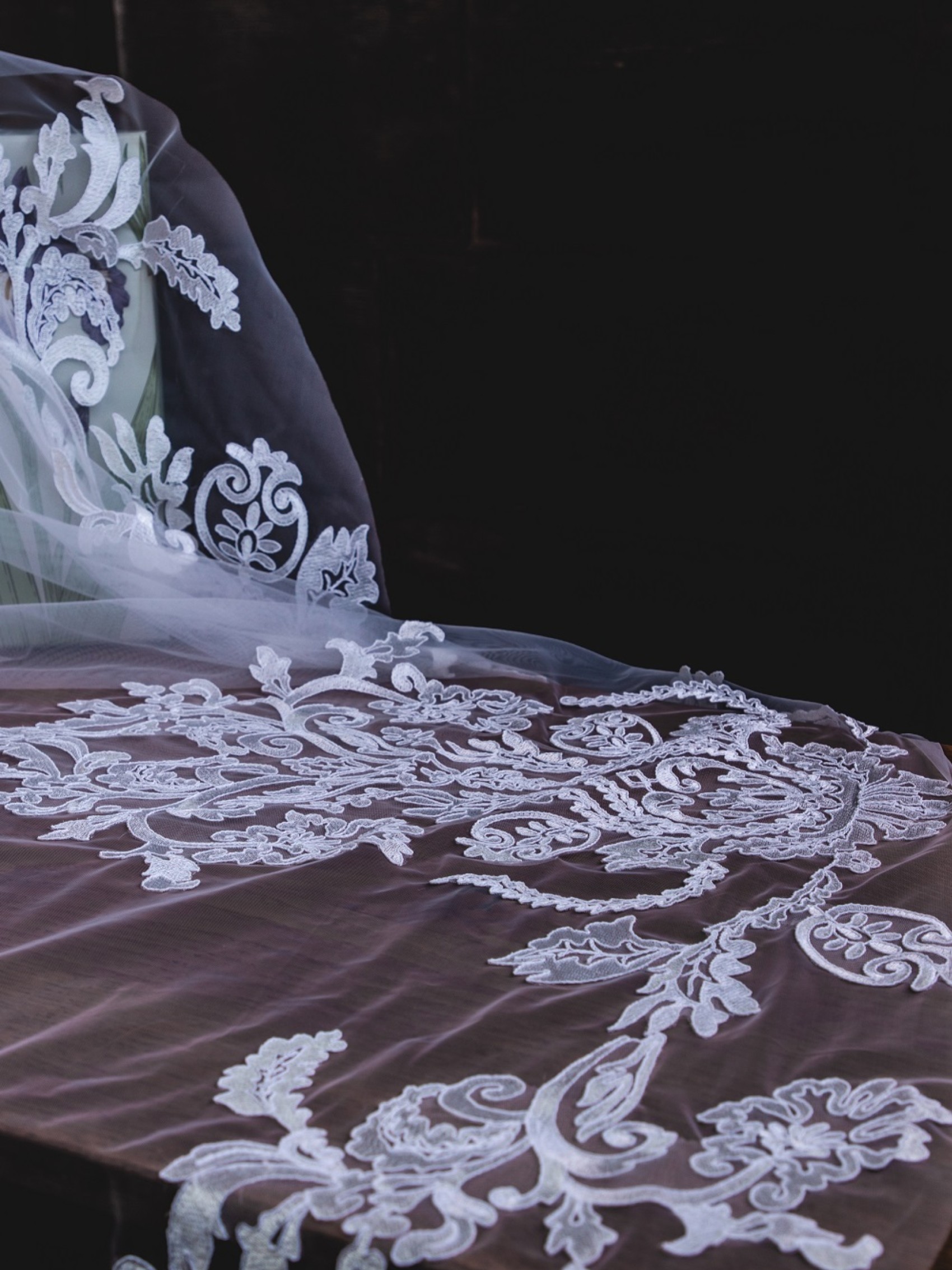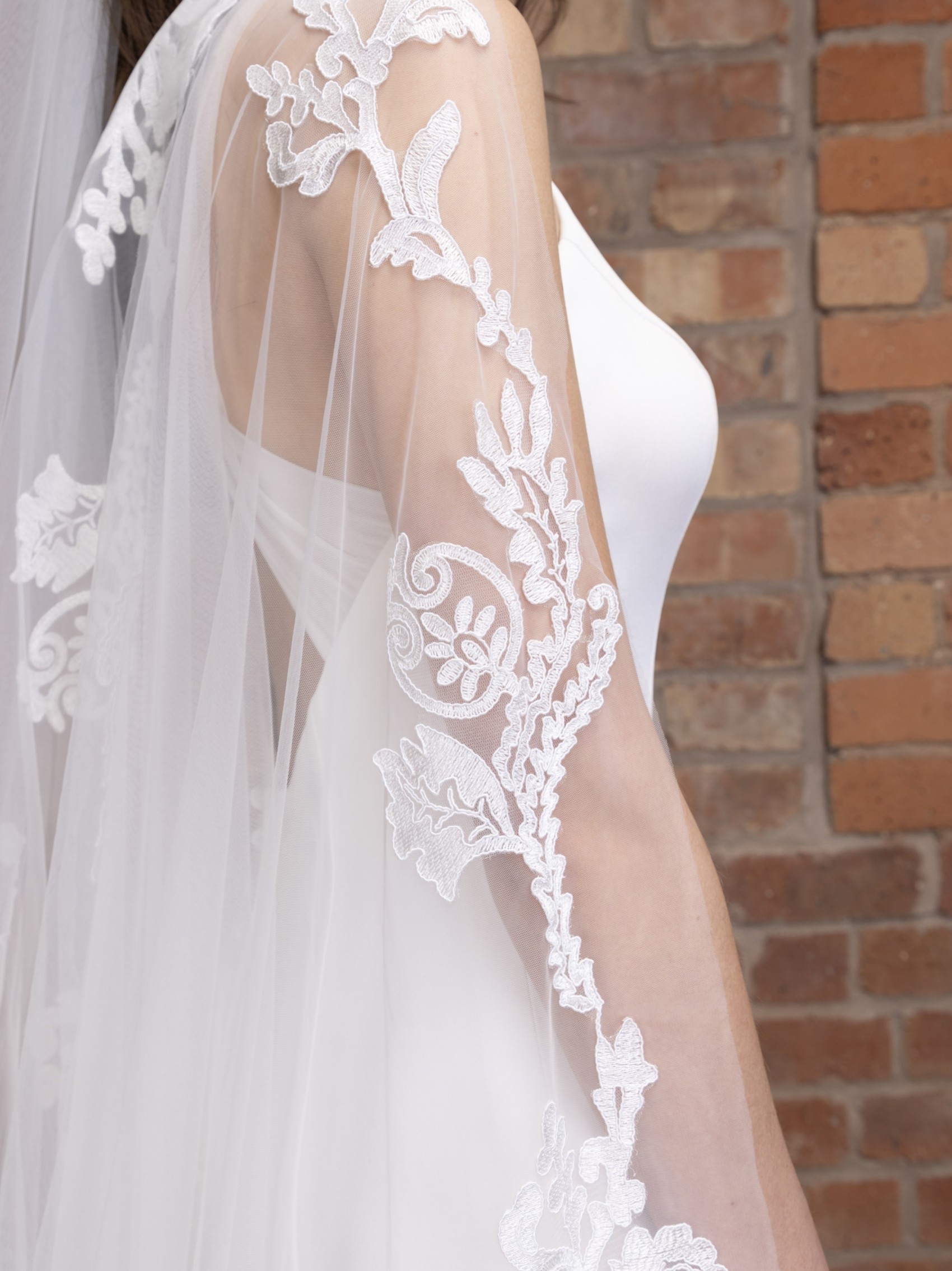 Accompagnate l'altare indossando questo squisito velo da sposa a cattedrale di Perfect Bridal. Ornato da splendidi motivi di pizzo ornato, questo velo è realizzato in un'unica striscia di morbido tulle color avorio con un bordo tagliato a mano. Il design presenta un grande motivo a forma di diamante al centro dello strascico, con pizzi più piccoli e vorticosi che si assottigliano lungo il velo fino ai fianchi.