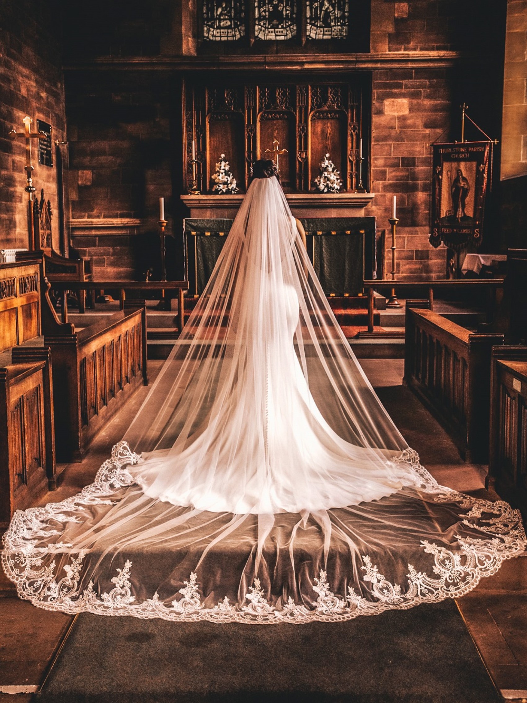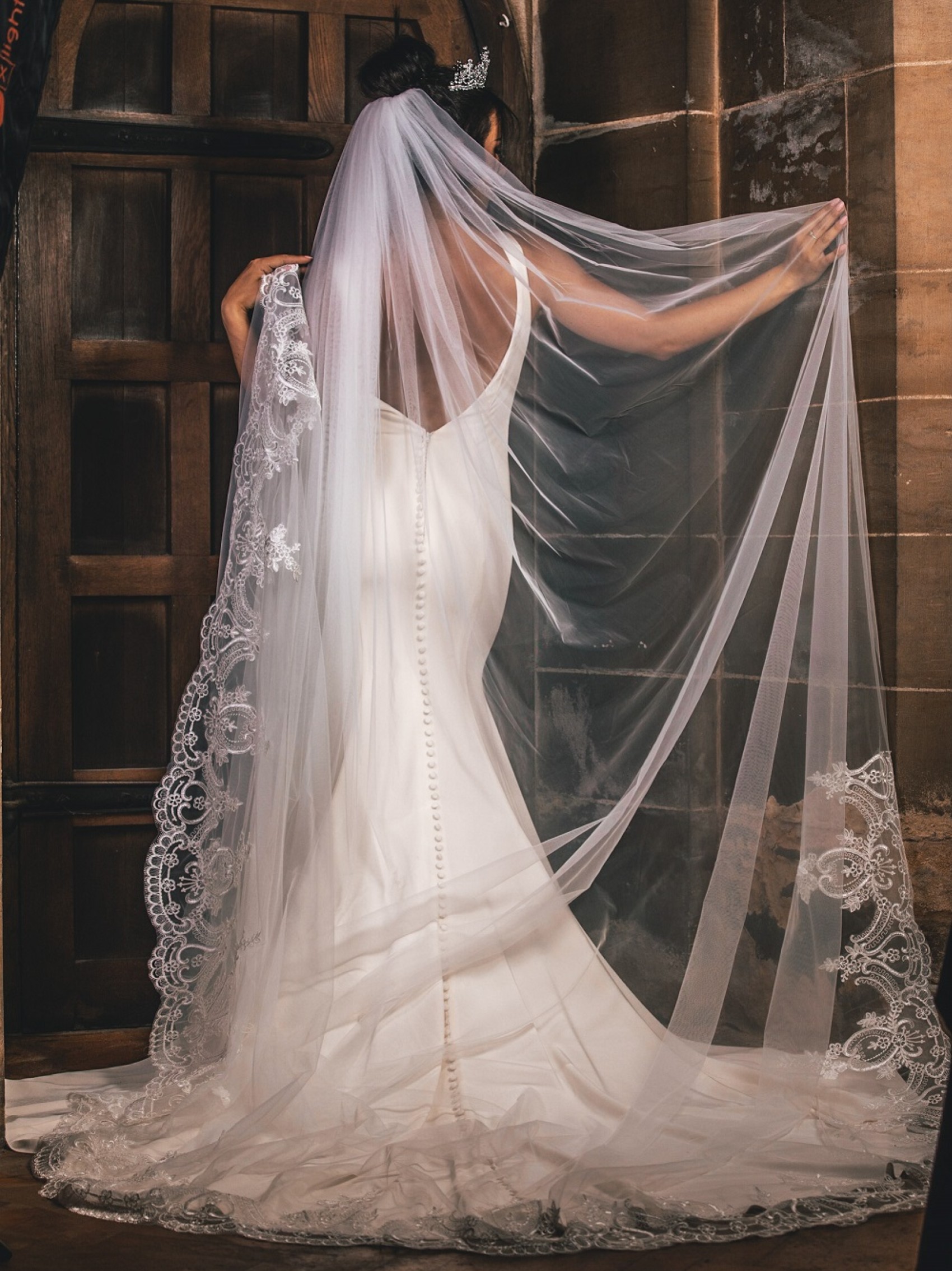 Tutti gli occhi saranno puntati su di voi con questo splendido velo! Un pizzo ricco di dettagli adorna lo strascico di questo splendido velo da sposa. Realizzato a mano da un'unica striscia di morbido tulle avorio, questo velo pende meravigliosamente con uno strascico circolare. Pensiamo che questo velo sia più adatto ad abiti da sposa più semplici. Un velo da sposa straordinario per un'entrata in chiesa in grande stile! Disponibile in lunghezza piena o cattedrale.