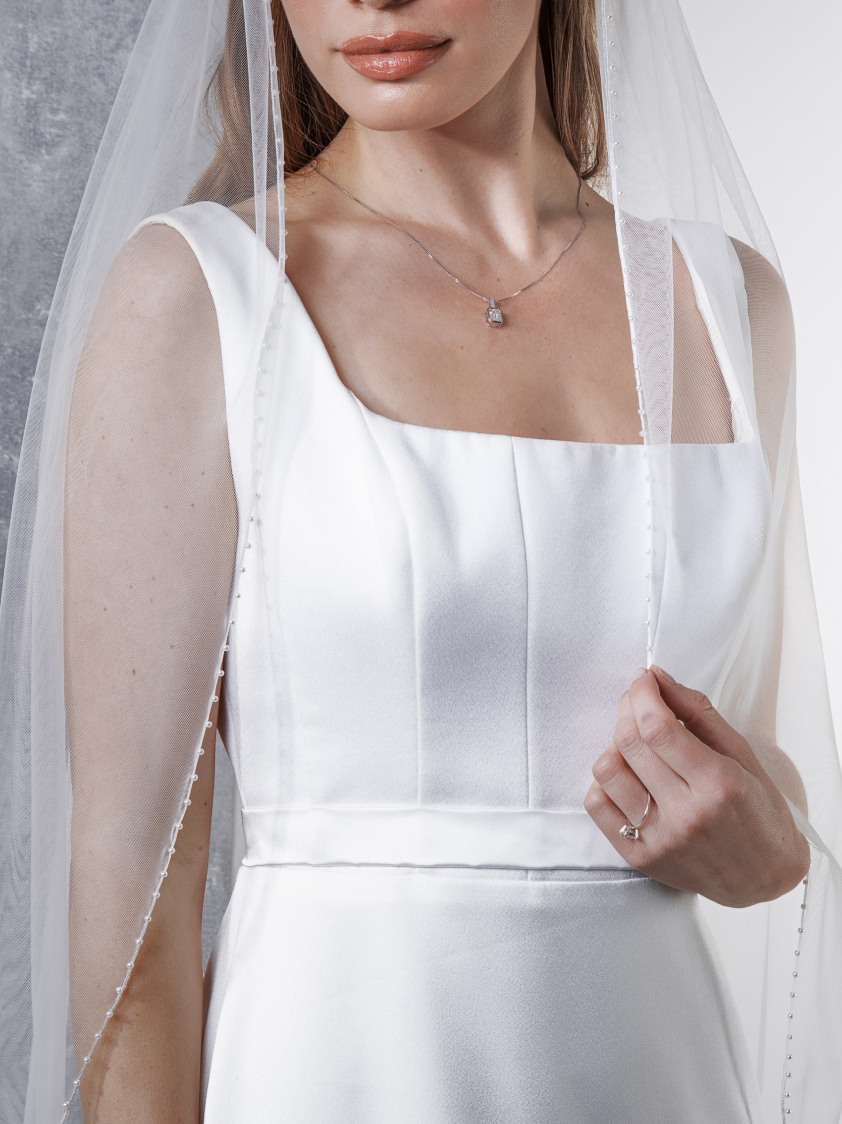 Un velo da sposa semplice ma di grande effetto, realizzato in morbido tulle italiano color avorio e rifinito con un perfetto bordo di perle. Questo classico velo di perle si abbina a molti stili diversi di abiti da sposa.