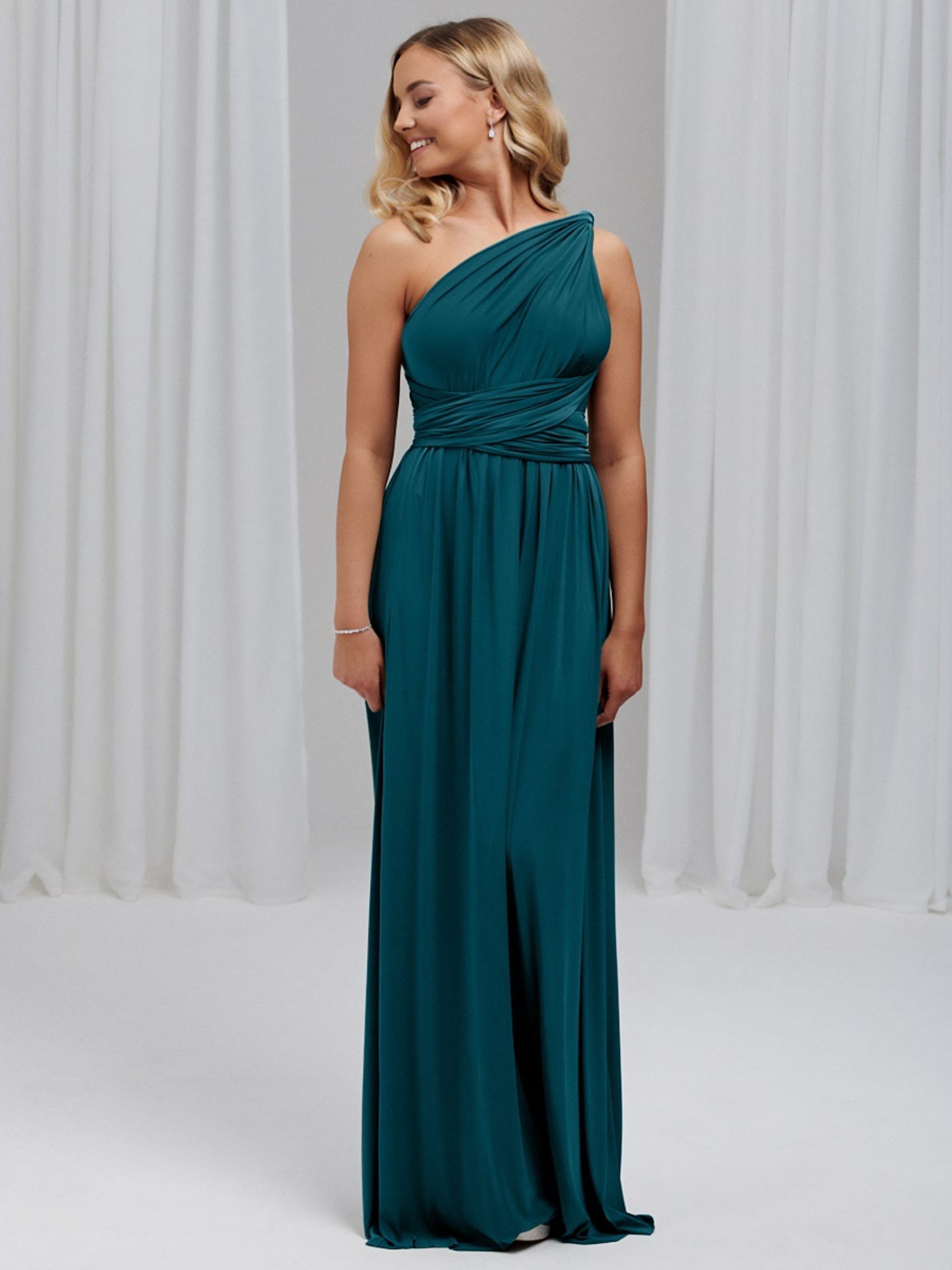 Our luxury in stock teal multiway bridesmaid dress is the perfect solution for all your bridesmaids. Handmade from heavyweight slinky, stretch fabric for comfort this one size multiway maxi dress has a super-smooth feel and can be worn in countless different ways to suit any size and shape. Infinity bridesmaid dresses are perfect for brides who are unsure of which style of dress to go for (you can literally decide on the morning of the wedding!) They also make the ideal maternity bridesmaid dress as the stretchy waistband can be placed above the bump. A beautiful colour choice for an Autumn wedding.