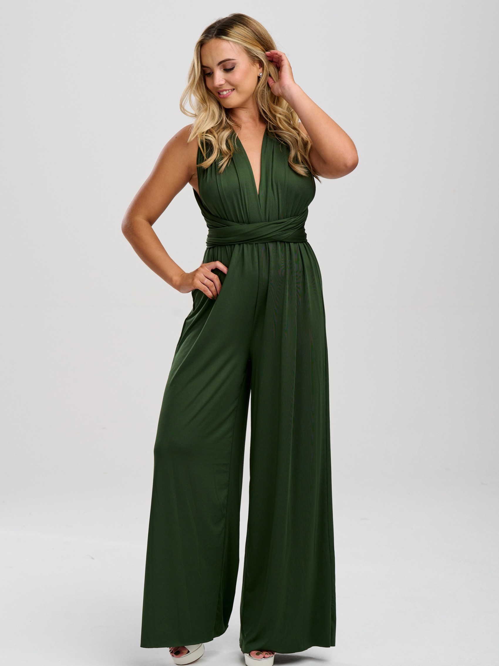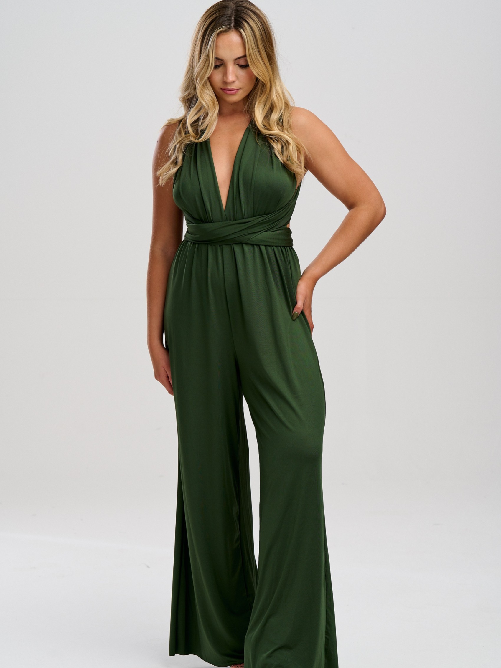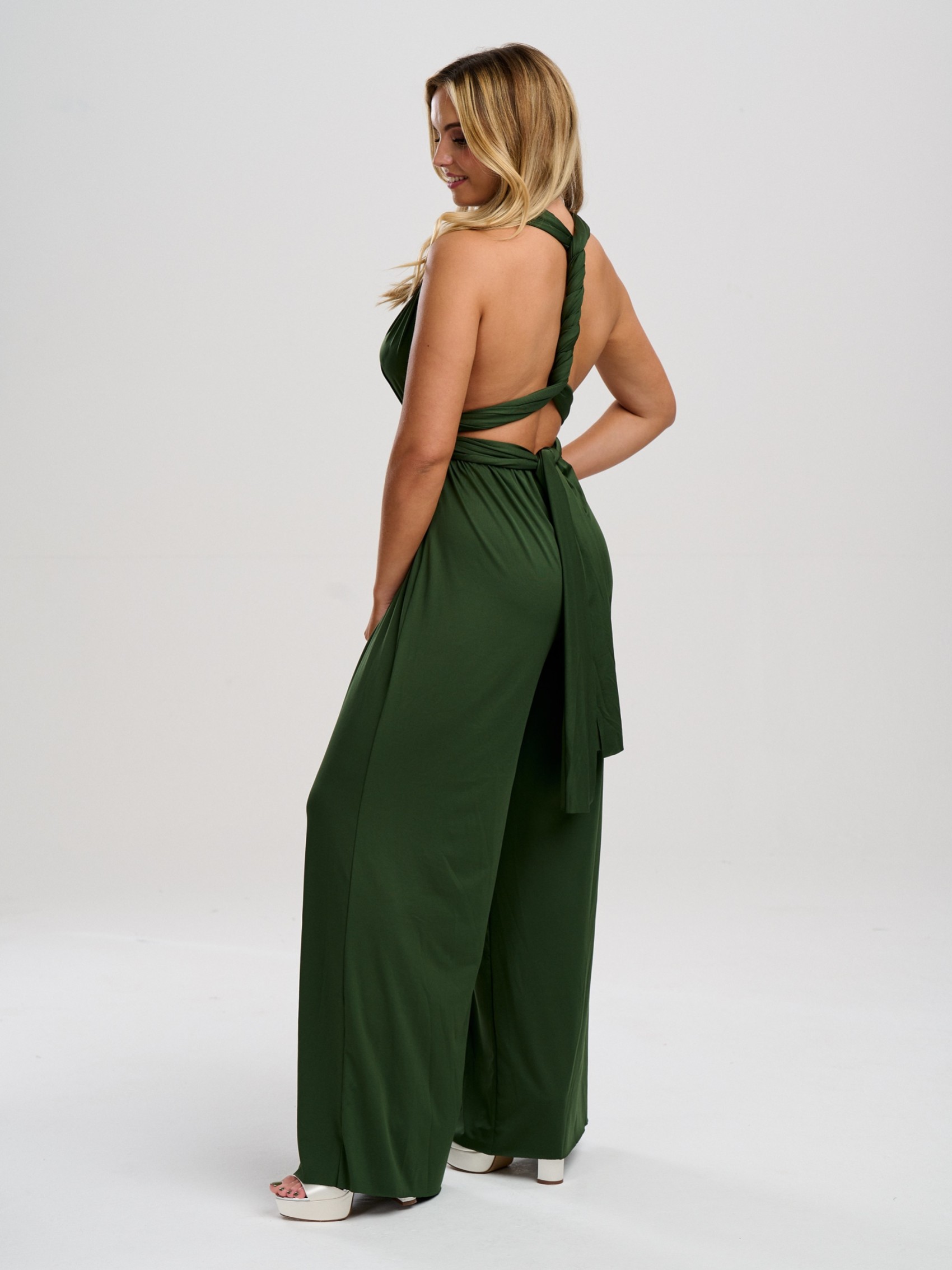 Our luxury in stock olive green multiway jumpsuit is the perfect solution for all your bridesmaids. Handmade from heavyweight slinky, stretch fabric for comfort this one size bridesmaid jumpsuit has a super-smooth feel and can be worn in countless different ways to suit any size and shape. Infinity jumpsuits are perfect for bridesmaids who are unsure of which style to go for (you can literally decide on the morning of the wedding!) They also make the ideal maternity bridesmaid jumpsuit as the stretchy waistband can be placed above the bump. Perfect for an olive green wedding theme!