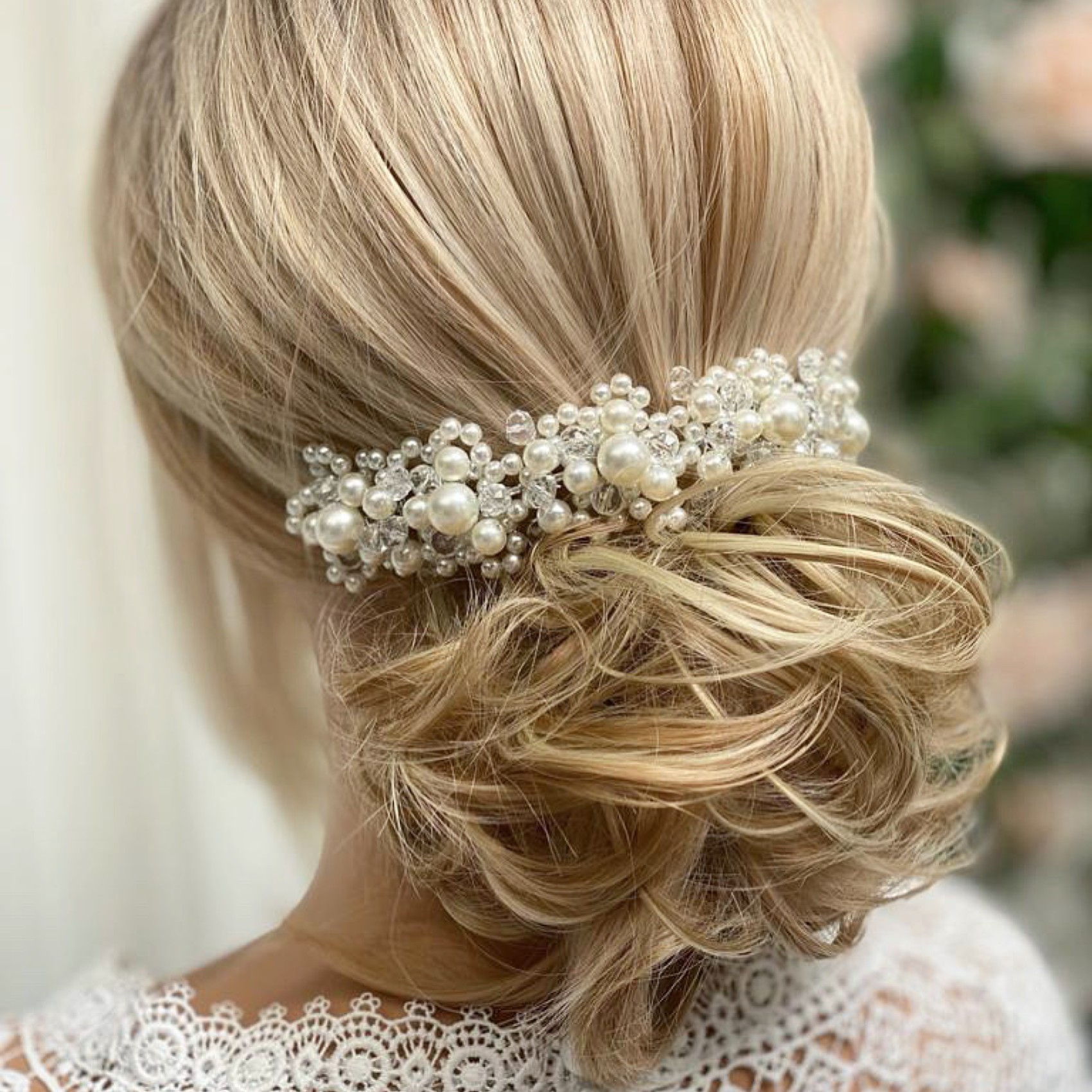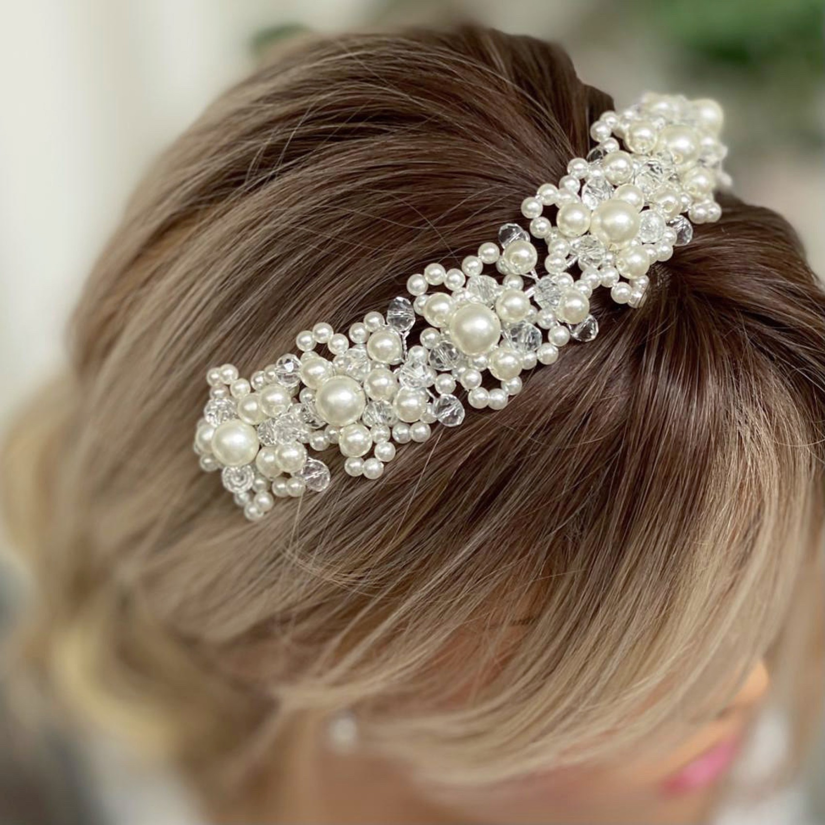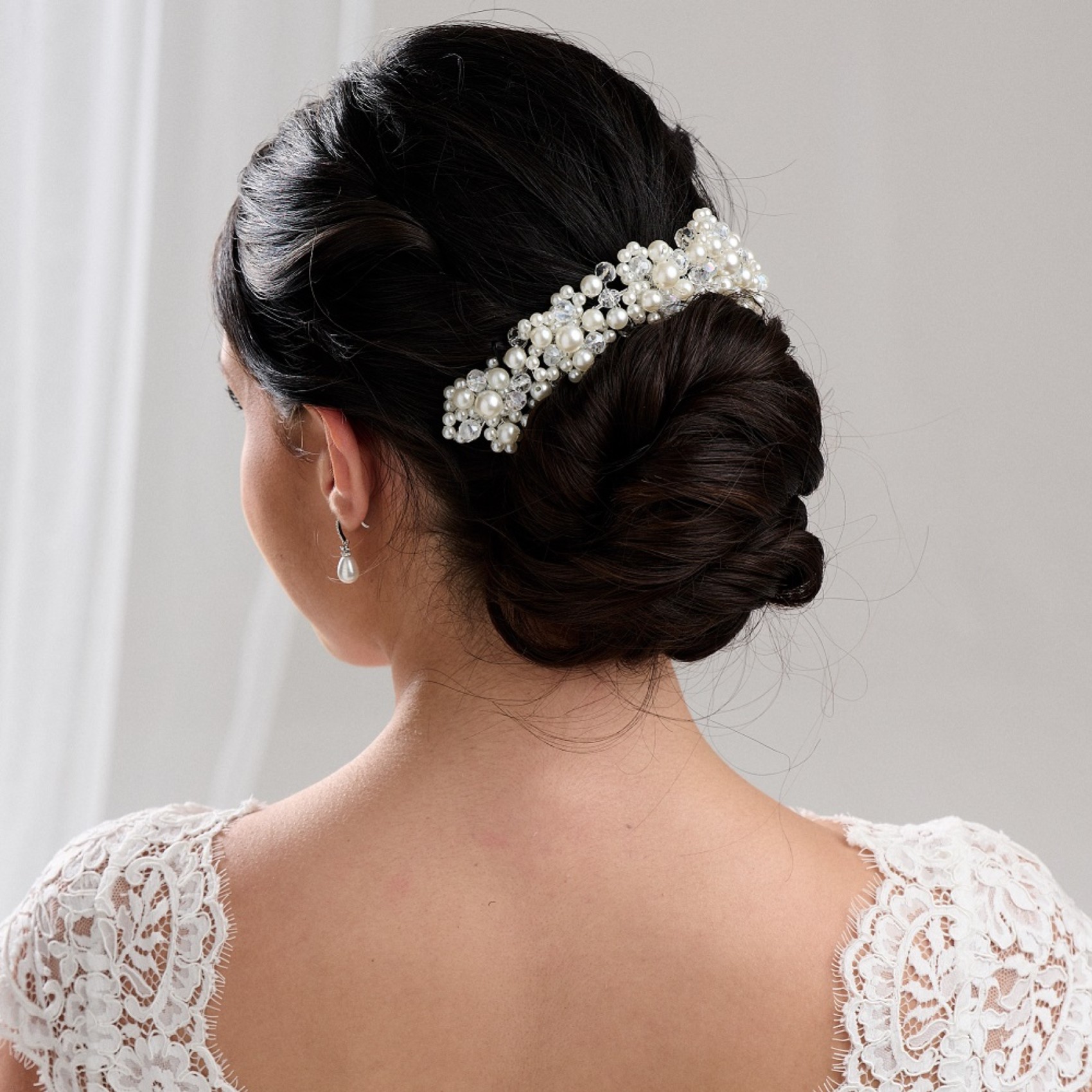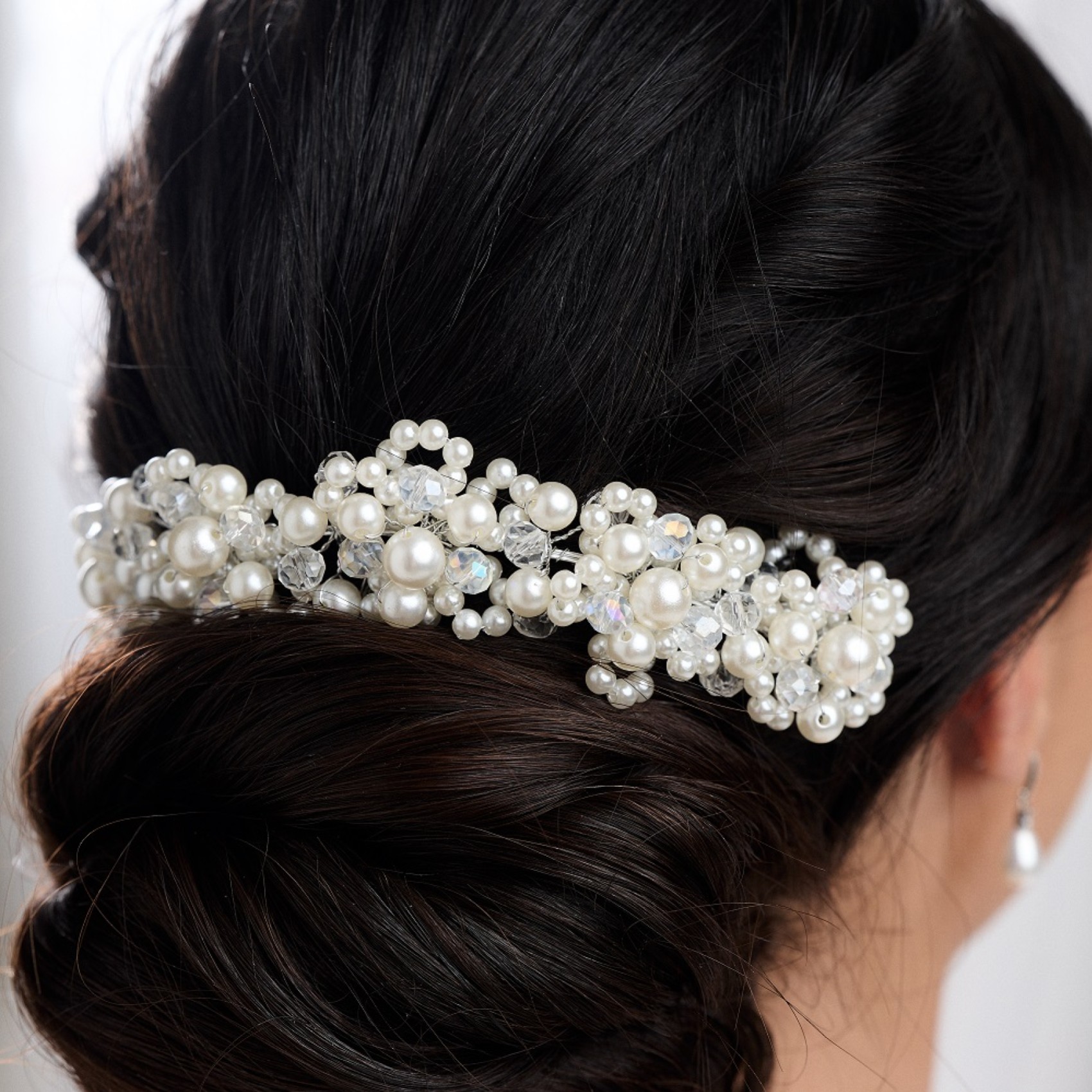 A miriad of multi size ivory pearls and shimmering crystals makes up this beautiful statement wedding headpiece. A stunning addition to a loose up-do wear this piece with a cascading tulle veil for the dreamiest bridal look. Secures into the hair with pins.