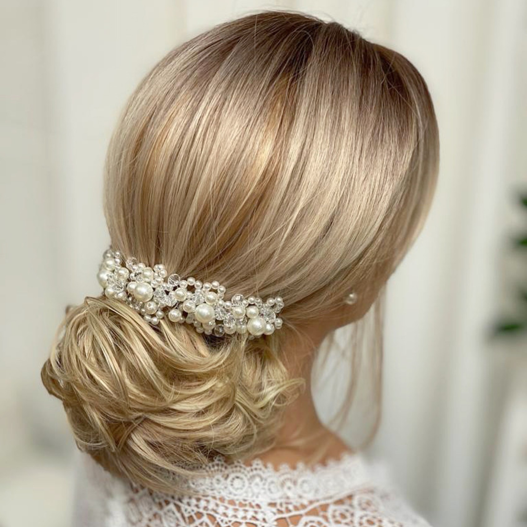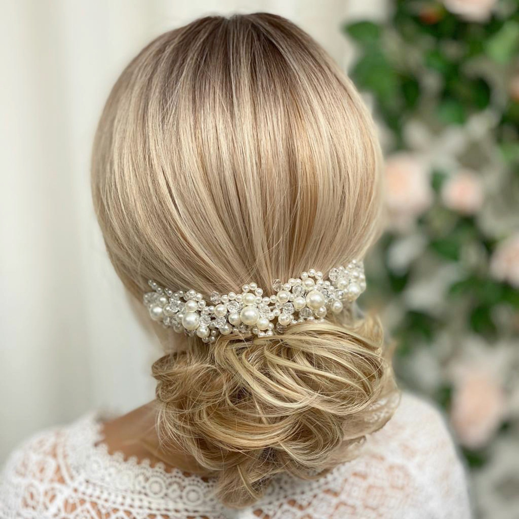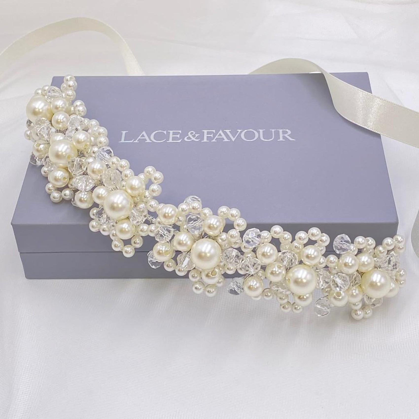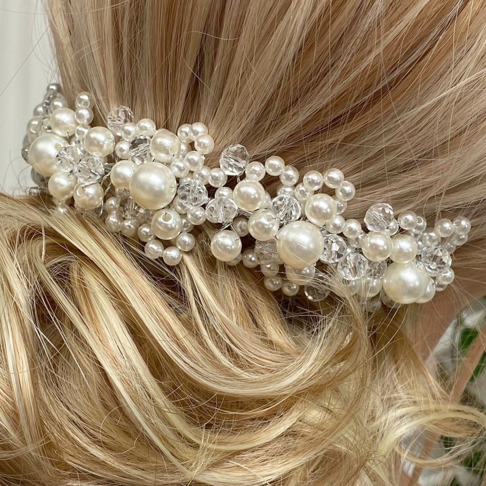 A miriad of multi size ivory pearls and shimmering crystals makes up this beautiful statement wedding headpiece. A stunning addition to a loose up-do wear this piece with a cascading tulle veil for the dreamiest bridal look. Secures into the hair with pins.