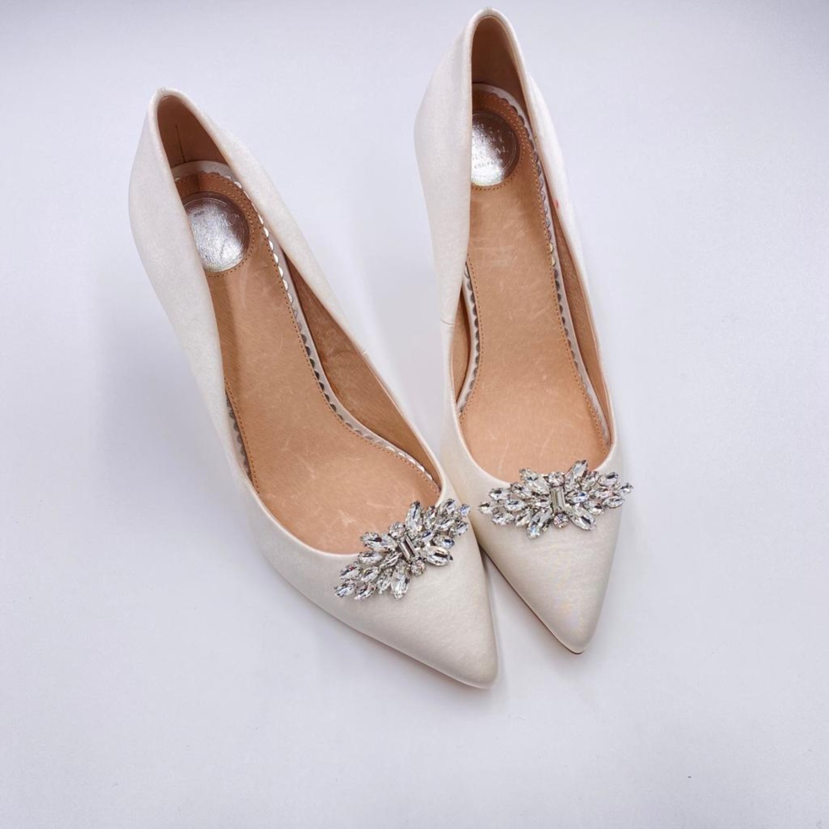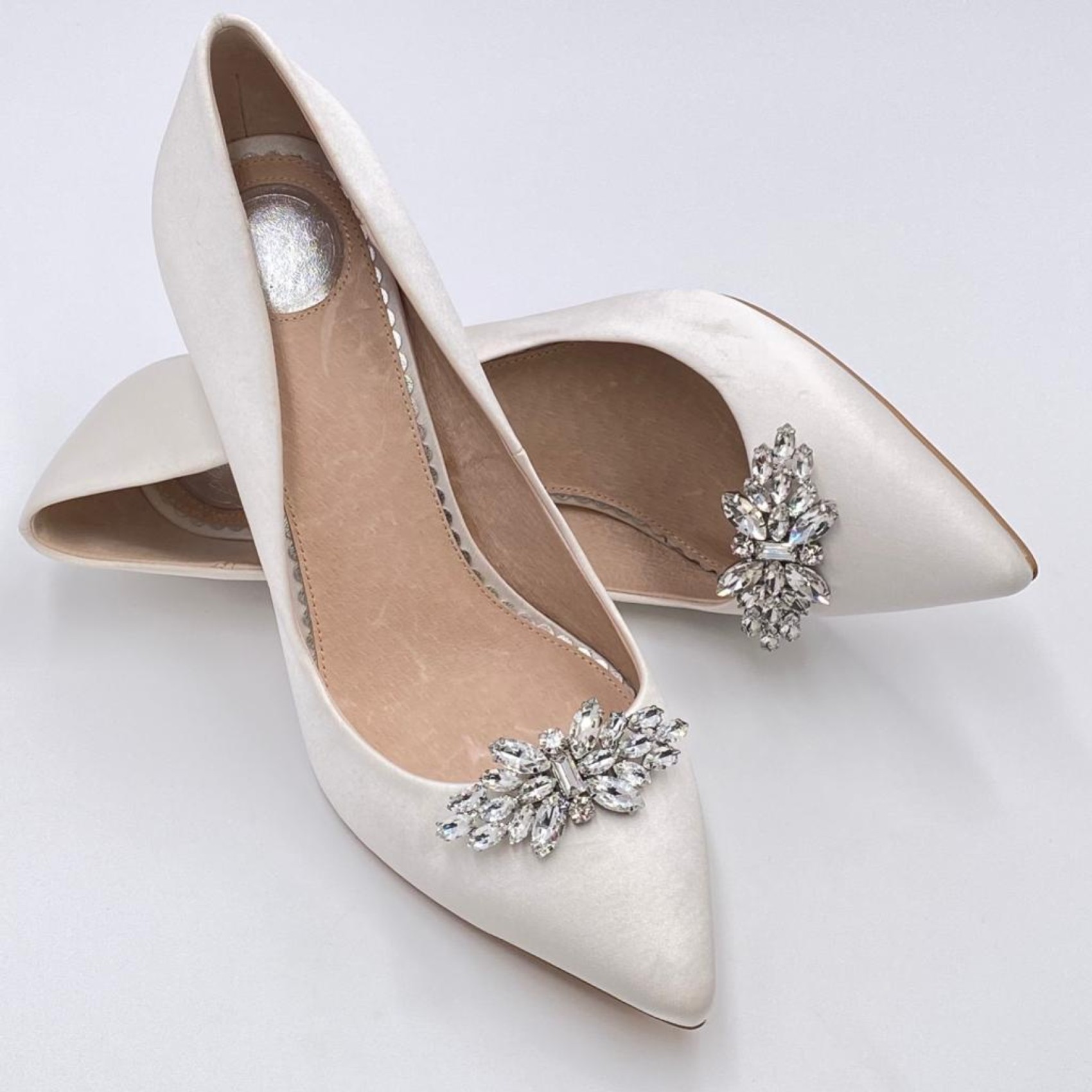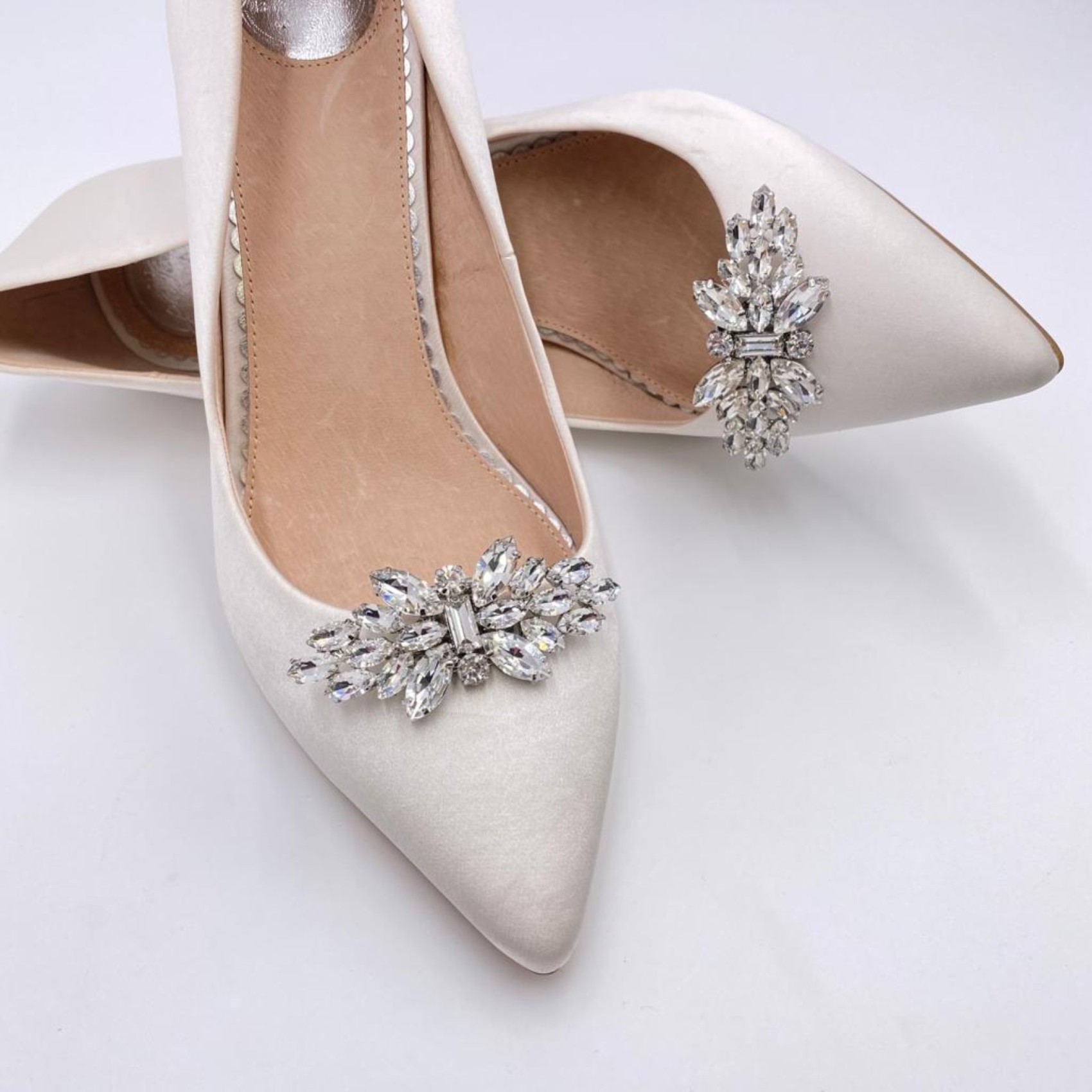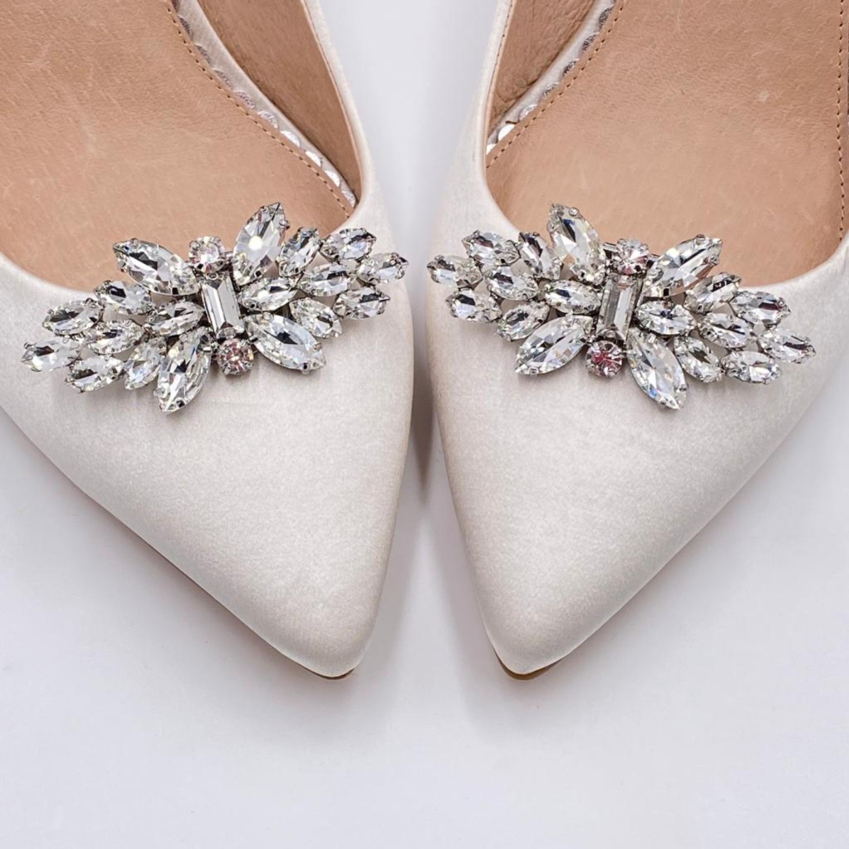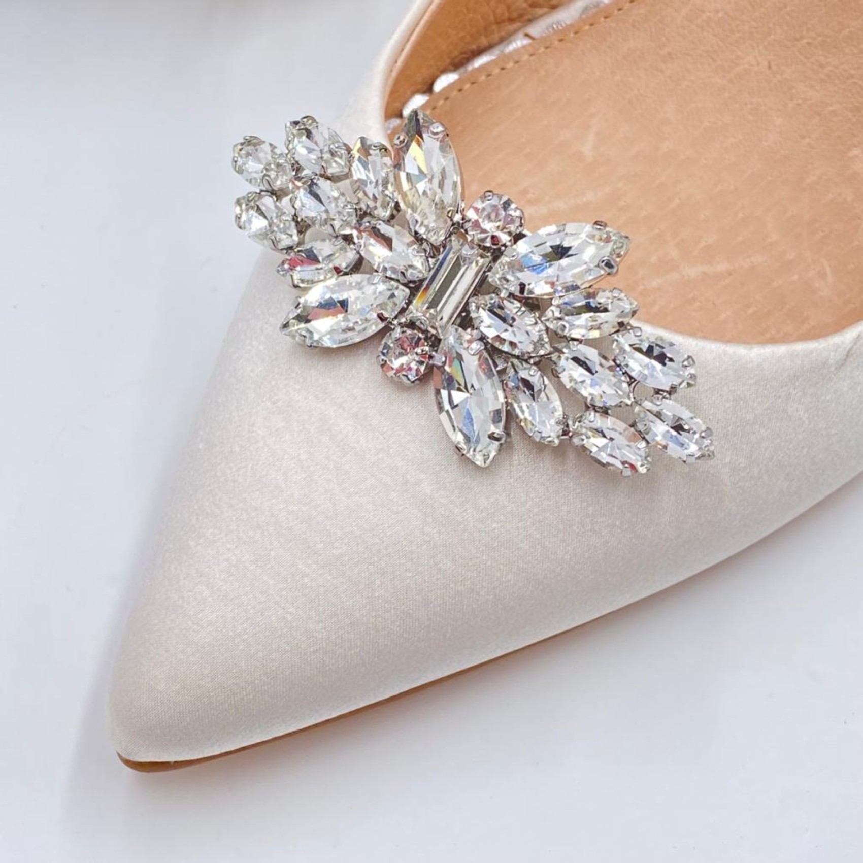 Add a touch of 'Glamour' to your wedding shoes with these timeless crystal shoe clips. Glistening with radiant marquise crystals, finished with a rectangular and two round stones in the center. They look gorgeous on either the front or side of any court shoe! Also available in gold.