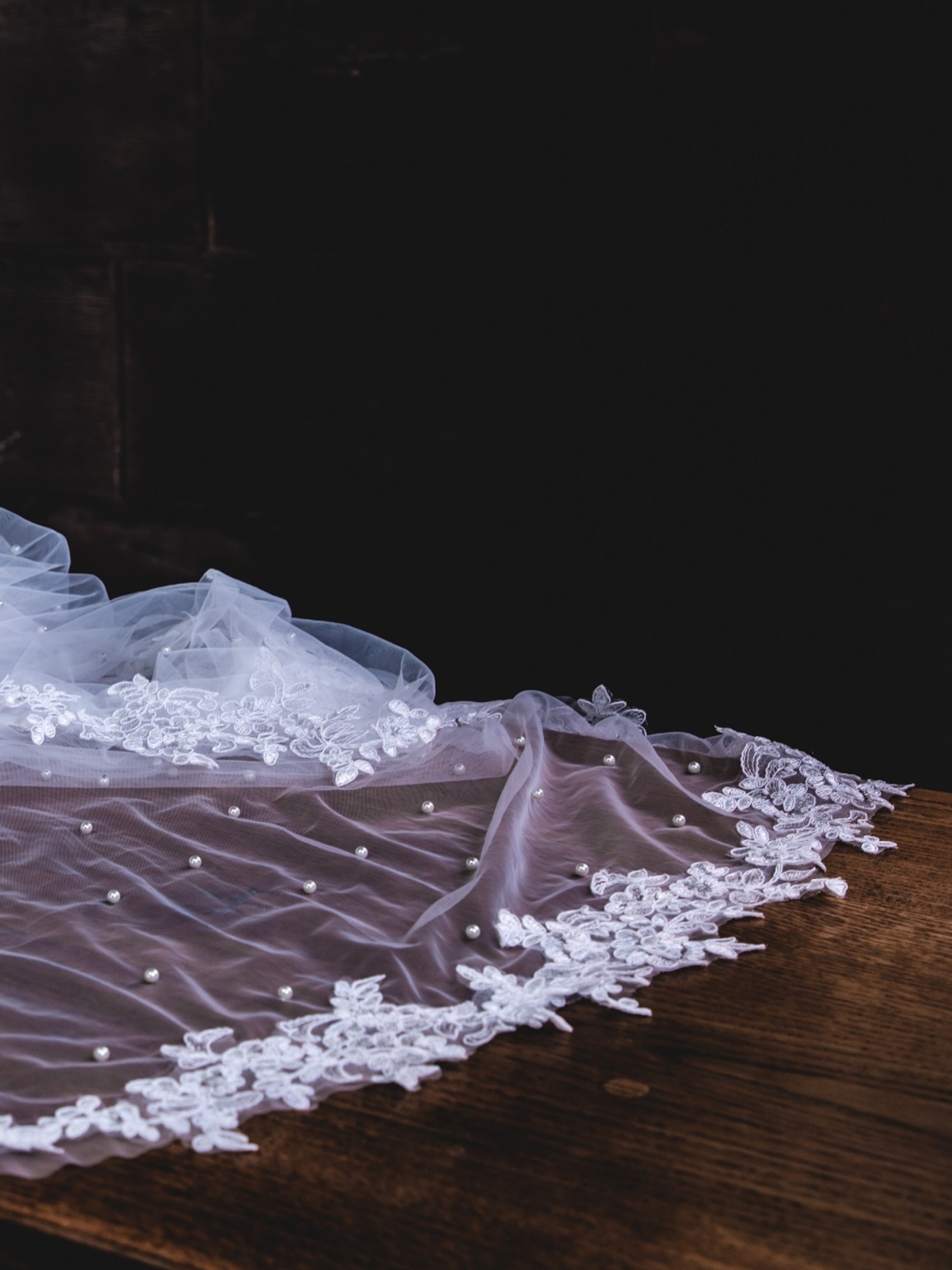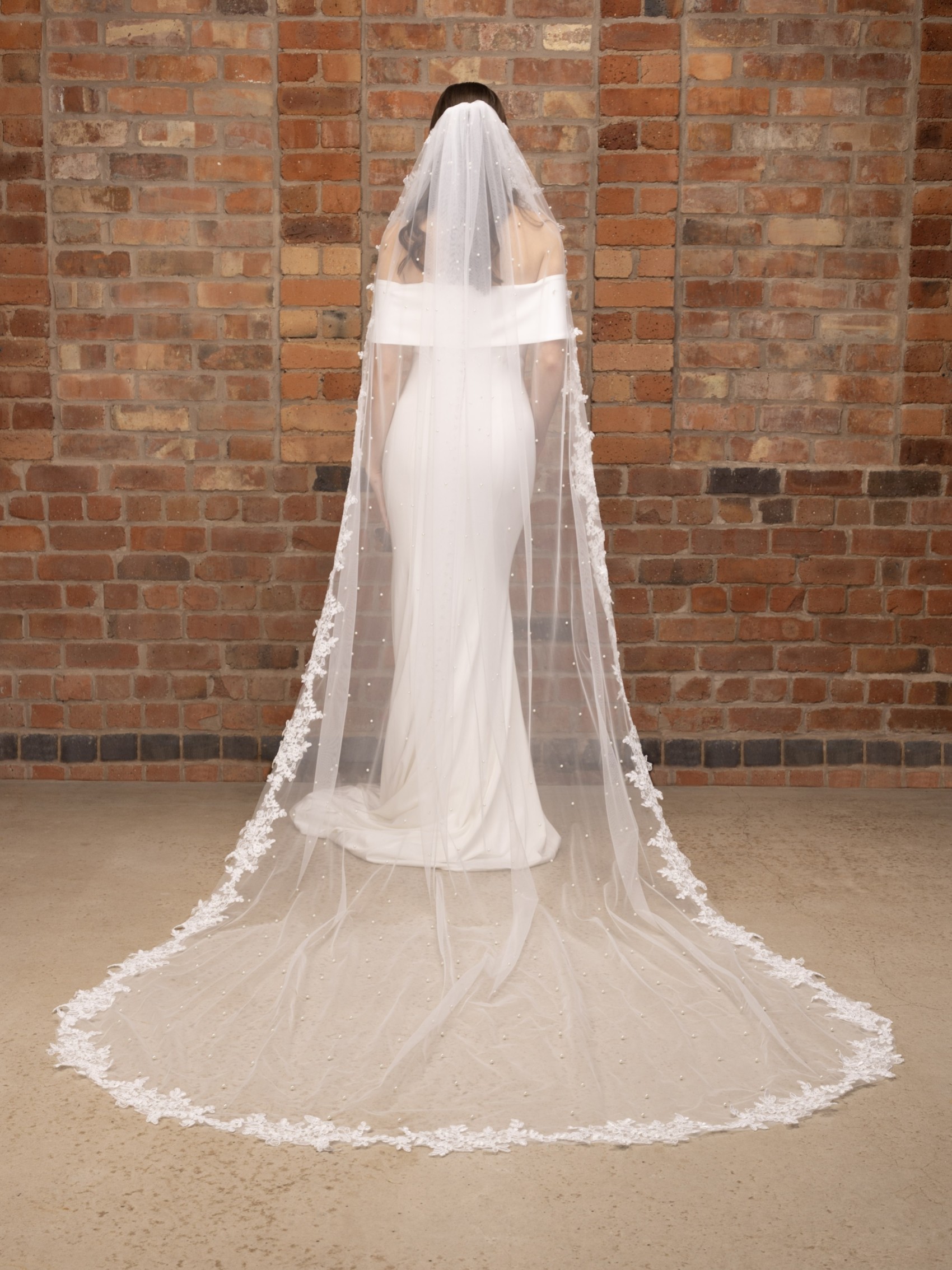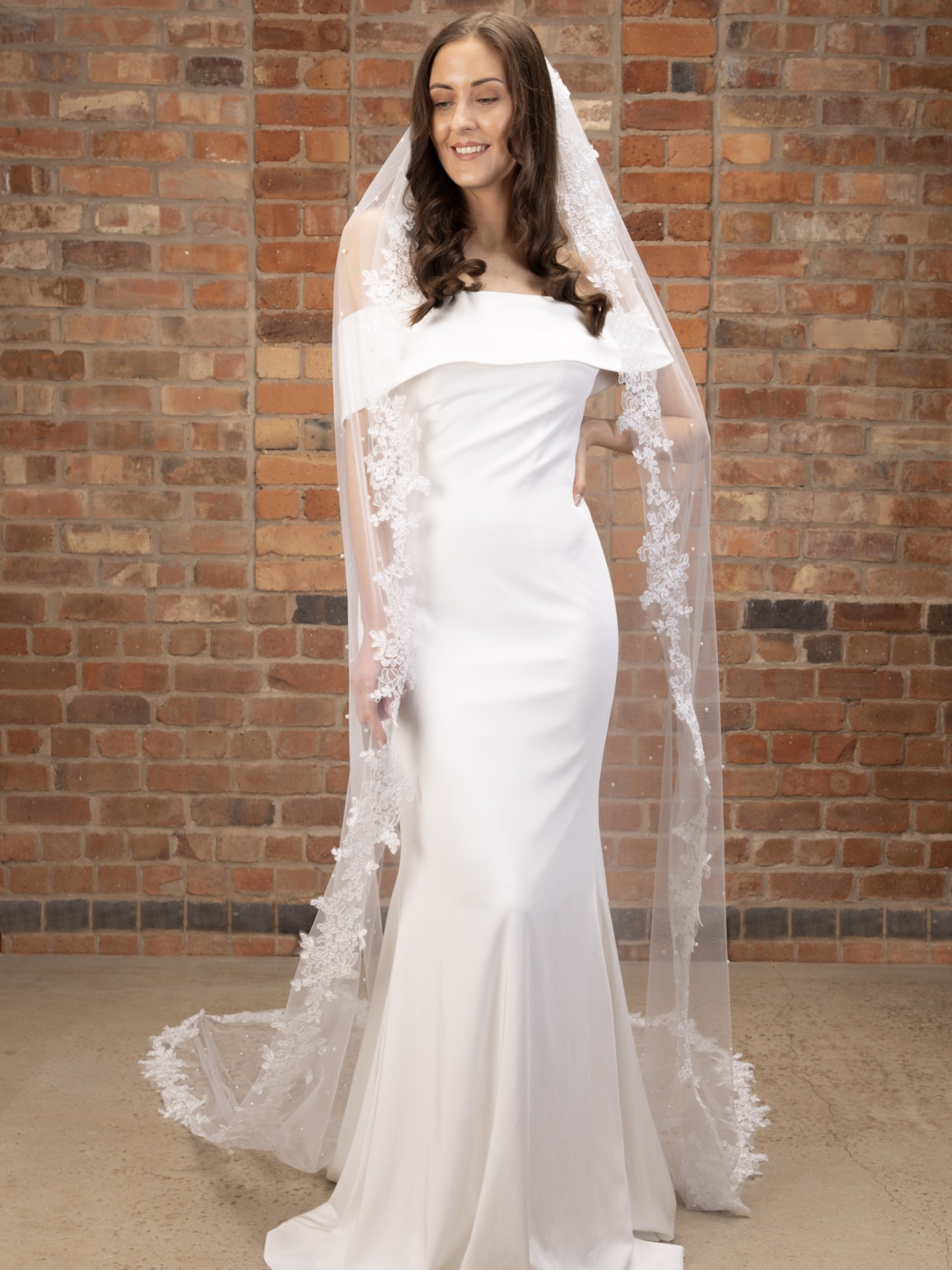 This beautifully decorative veil is perfect for brides who want to add detail to their attire. Handmade from a single layer of soft ivory tulle this wedding veil is scattered with hundreds of luminous ivory pearls and finished with a gorgeous floral lace edging. We think this veil looks best with a simple wedding dress.