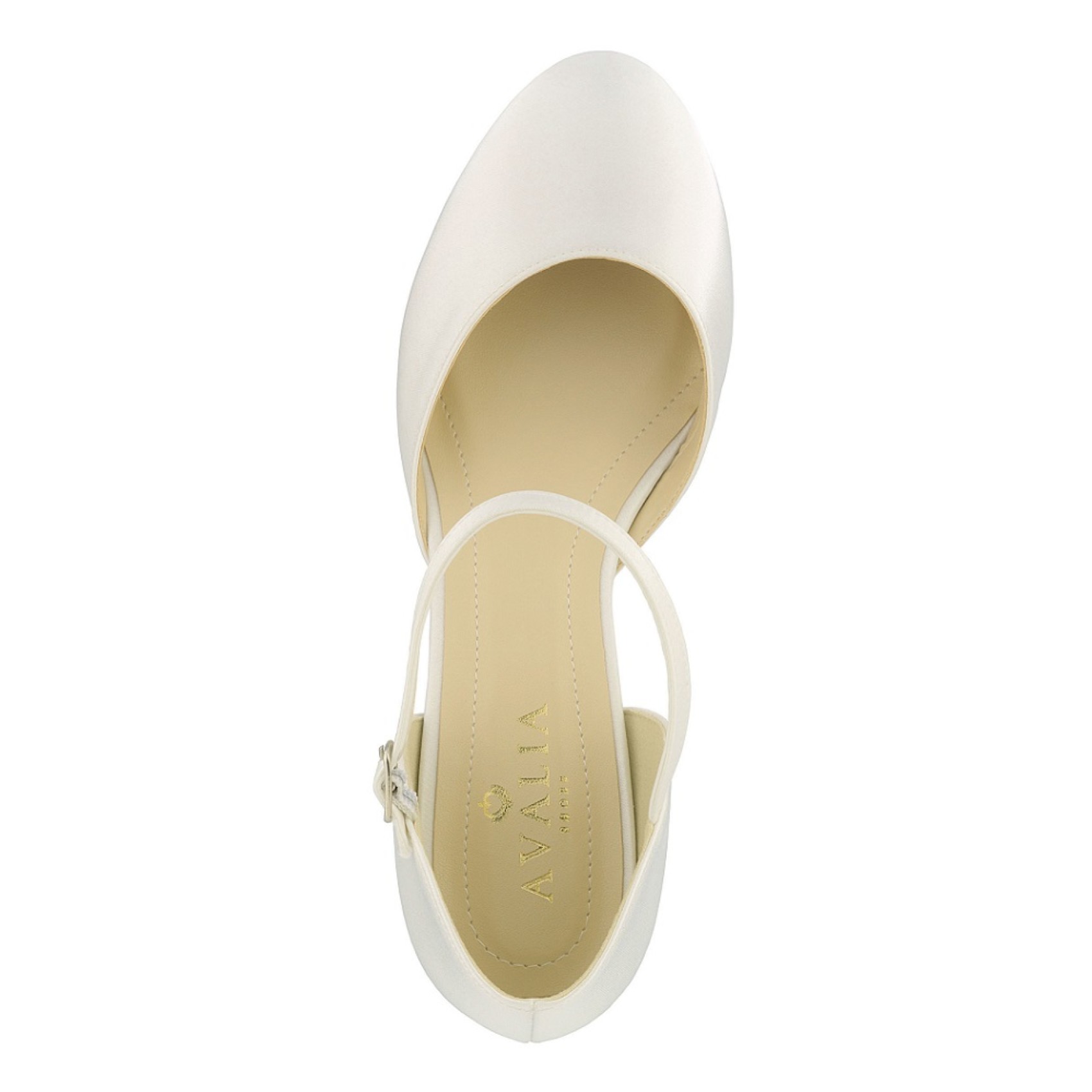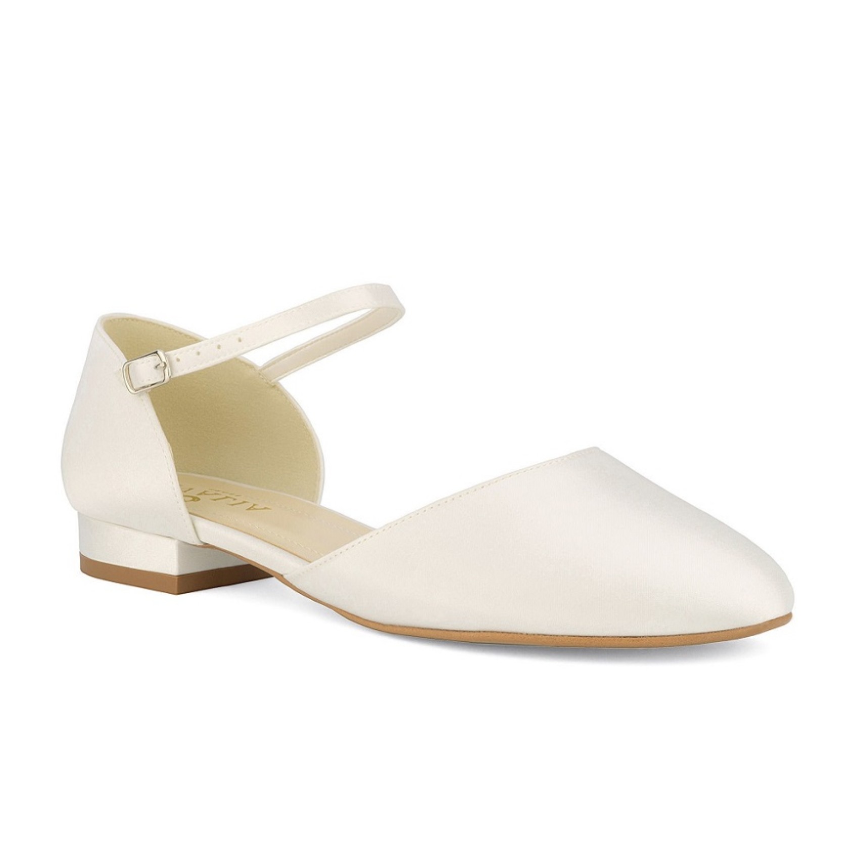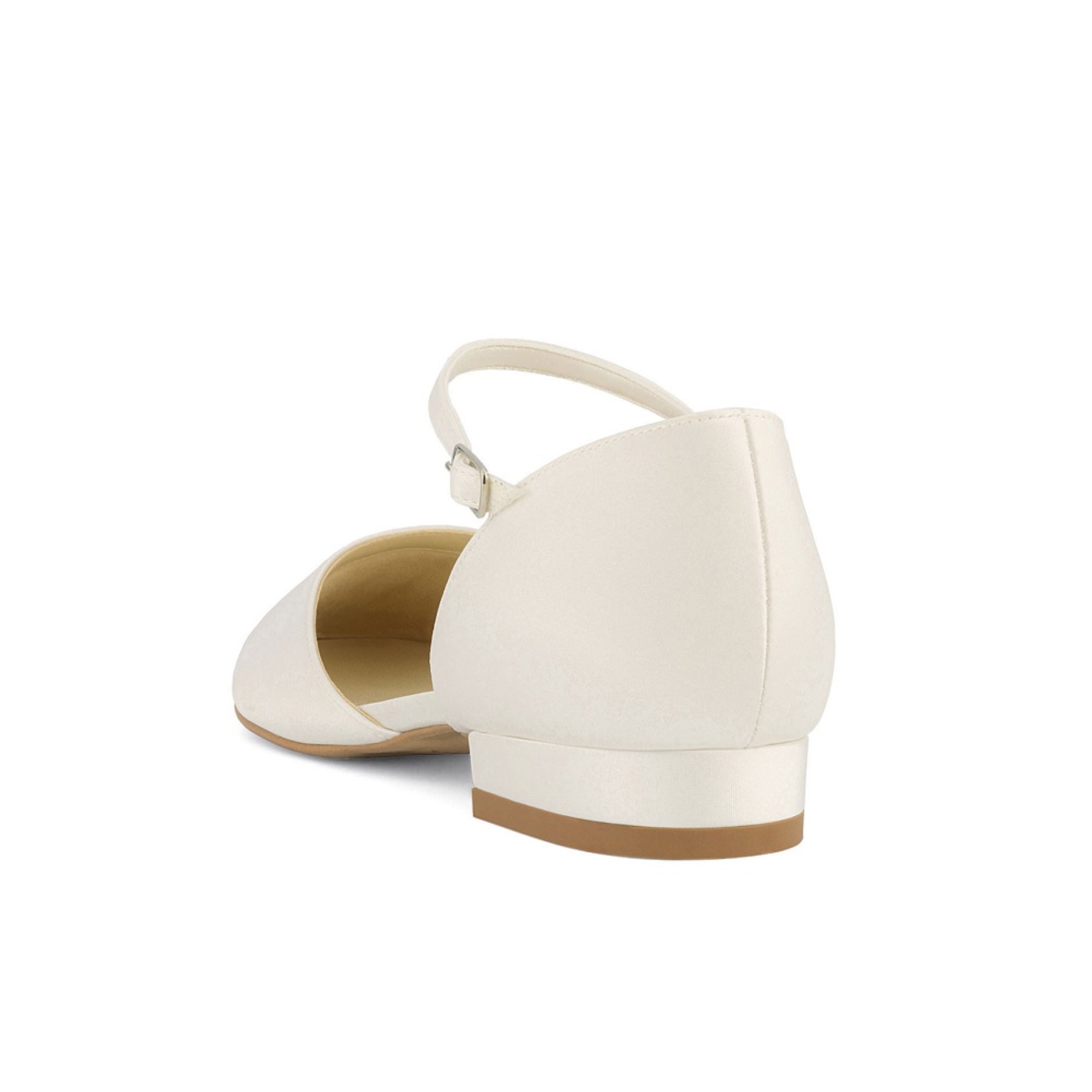 A sweet wedding flat made from luxury ivory satin Sissi features an elegant open waist, rounded closed toe and a delicate ankle strap for security. A popular choice for outdoor weddings and woodland ceremonies.