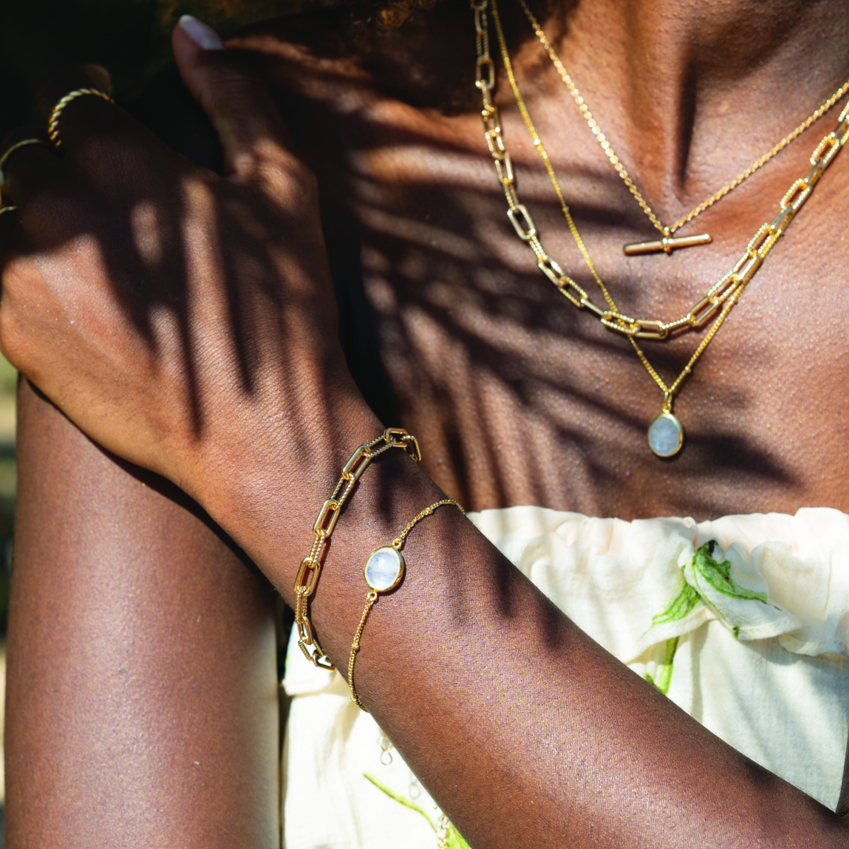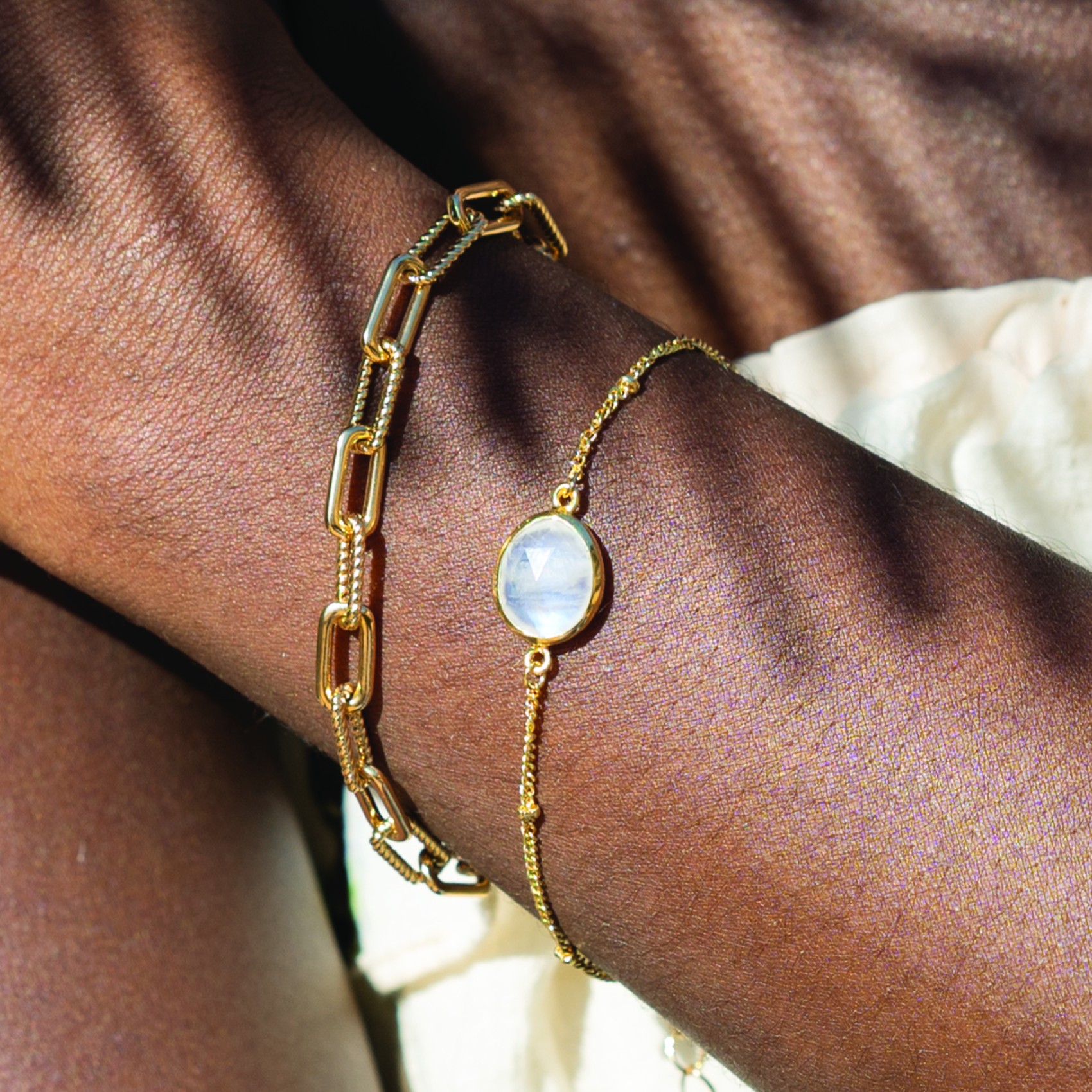 This delicate design is the perfect base for any bracelet stack. Set with hand cut Rainbow Moonstone on a dainty bobble chain this piece is a must. Style solo or layer with your faves for looks you’ll wear again and again.