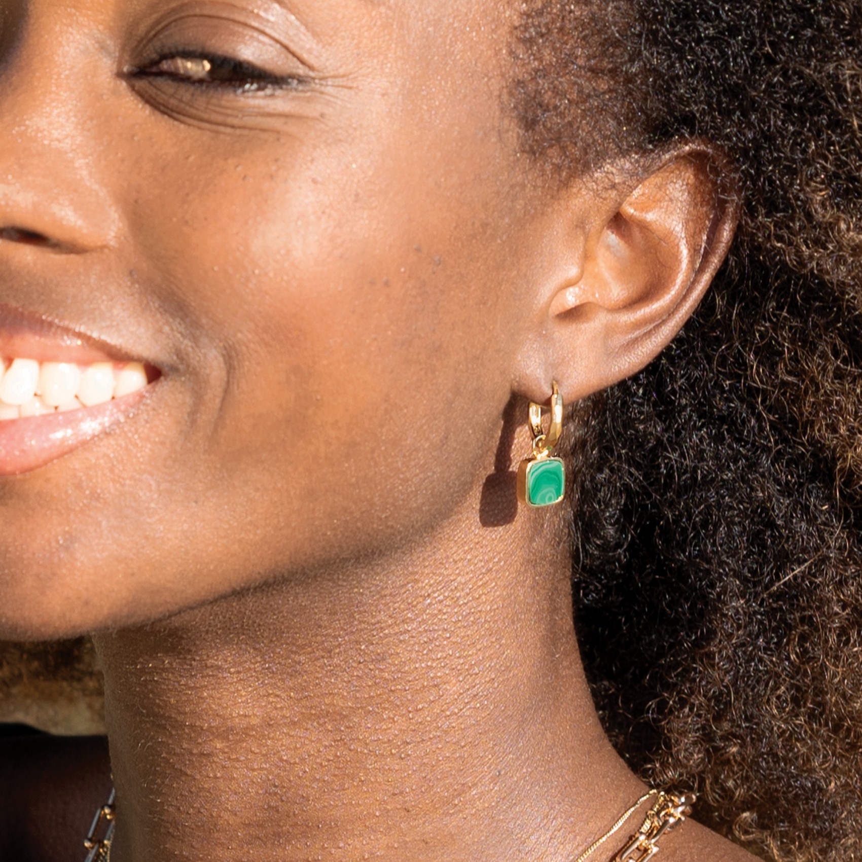 Bring easy on the eye luxury to your jewelry box with these beautiful gem earrings set with hand cut Malachite. Wear huggies alone or with the hanging charm. The charm can be removed and worn on a bracelet or as a pendant on a chain. Perfect for gifting and can be paired with the matching Napa Necklace.