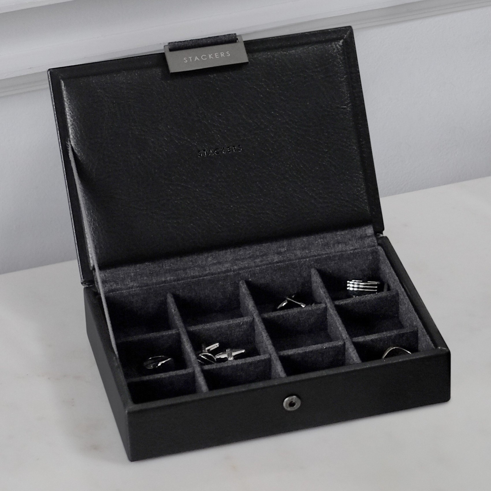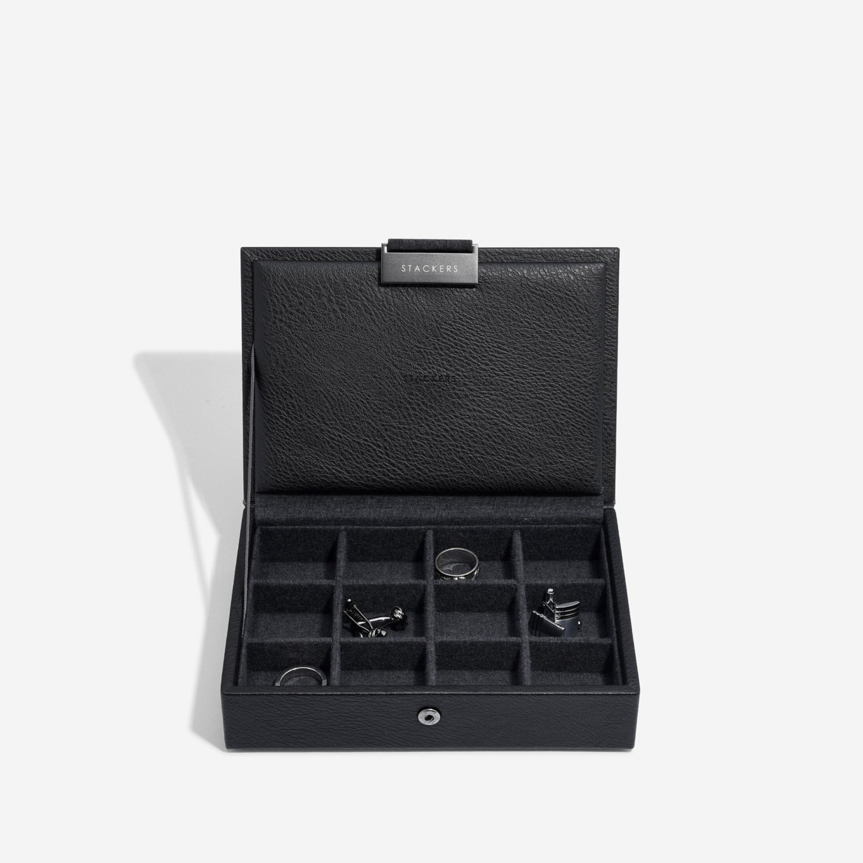 Keep your cufflinks organized in style. Made from black vegan faux leather this cufflink box features a quality velvet lining and sits neatly on top of the Stackers watch layer.