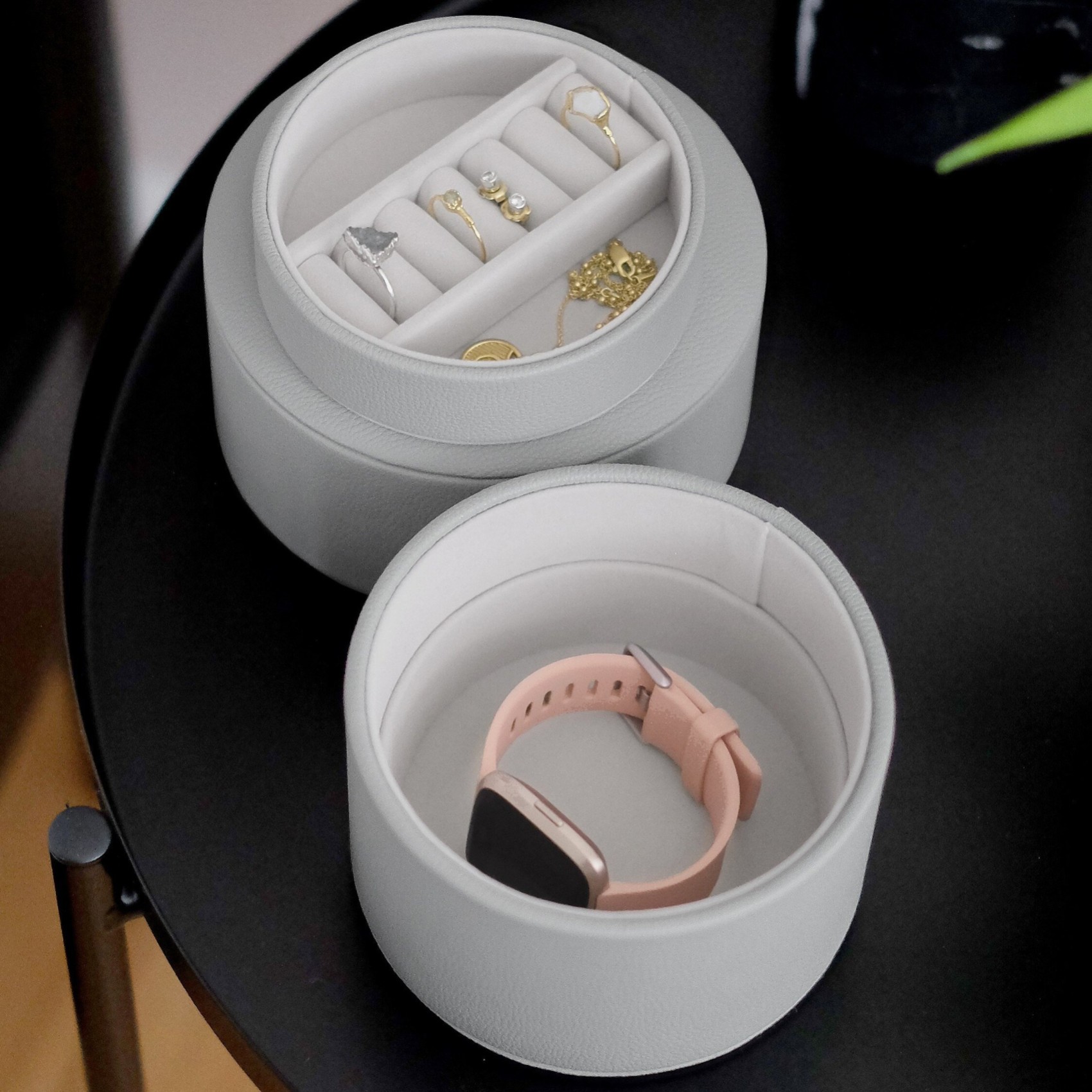 Your new bedside table bestie! The bedside table jewelry box pod is the perfect place to keep your everyday treasures safe whilst you get your beauty sleep! Compact but practical, the jewelry pod has space for rings, earrings and other day-to-day jewelry. Lift out the inner tray to reveal a second space in the base of the pod for your other trinkets! Finished in pebble gray faux leather with a soft gray velvet interior.